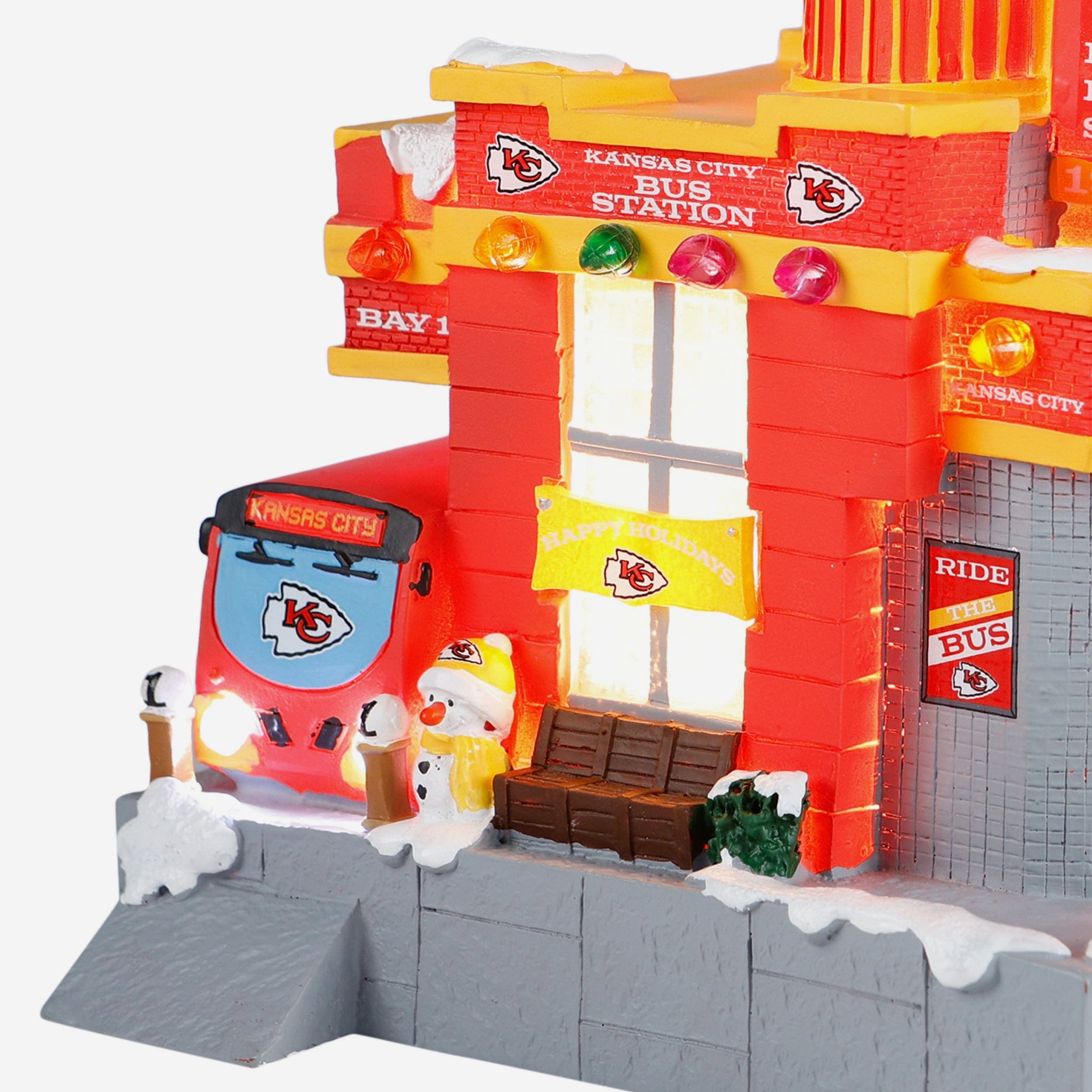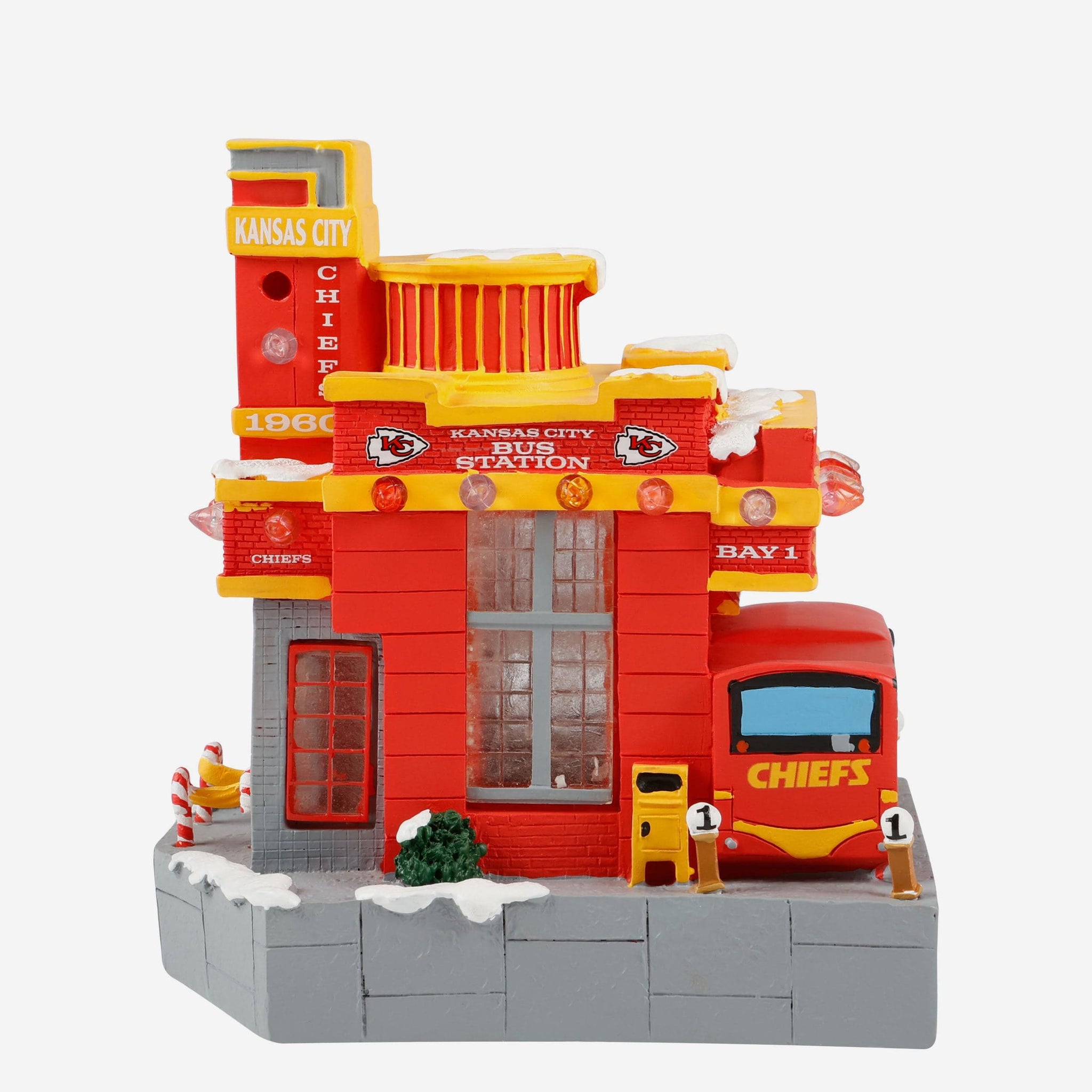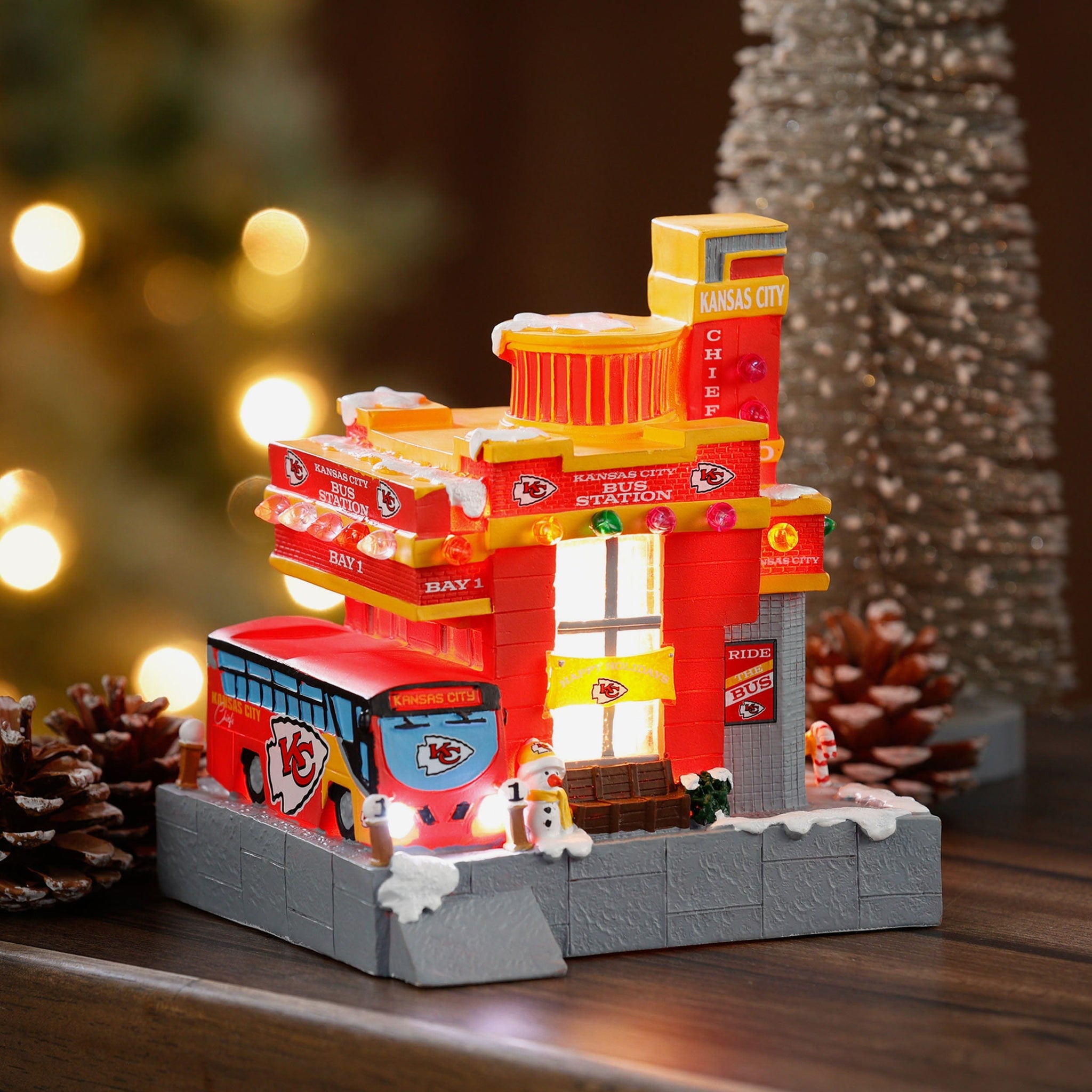 All aboard the holiday spirit! Illuminate your festive village with the Kansas City Chiefs Light Up Resin Team Bus Station.