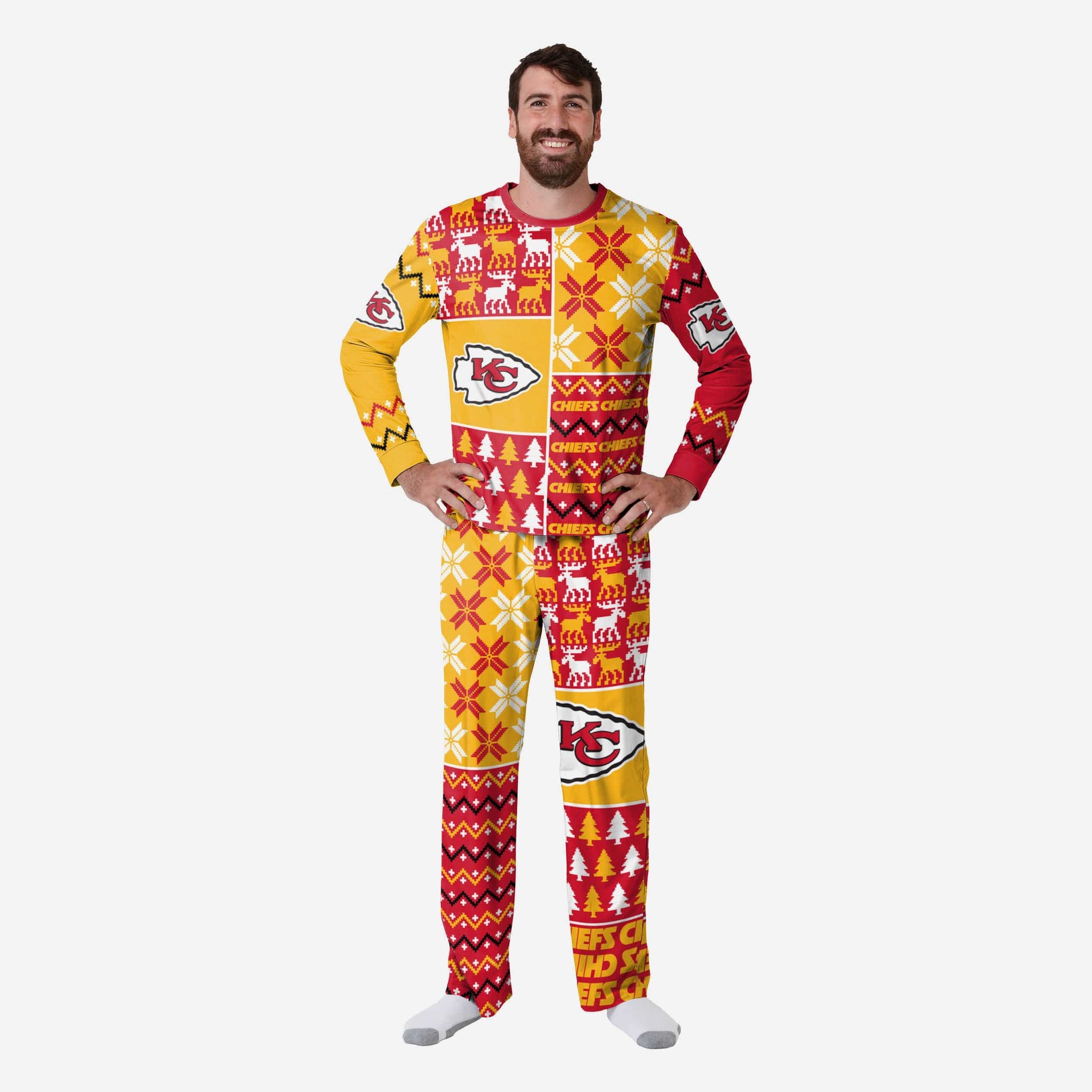 Get some matching family pajamas and dress to impress this holiday season! You won't want to miss these men's team pajamas! These men's PJ's are comfortable and show off your team spirit in the form of some sweet men's jammies. Introducing the Kansas City Chiefs Men's Busy Block Family Holiday Pajamas! Don't forget to take your holiday photo with the whole family wearing matching Christmas pajamas!