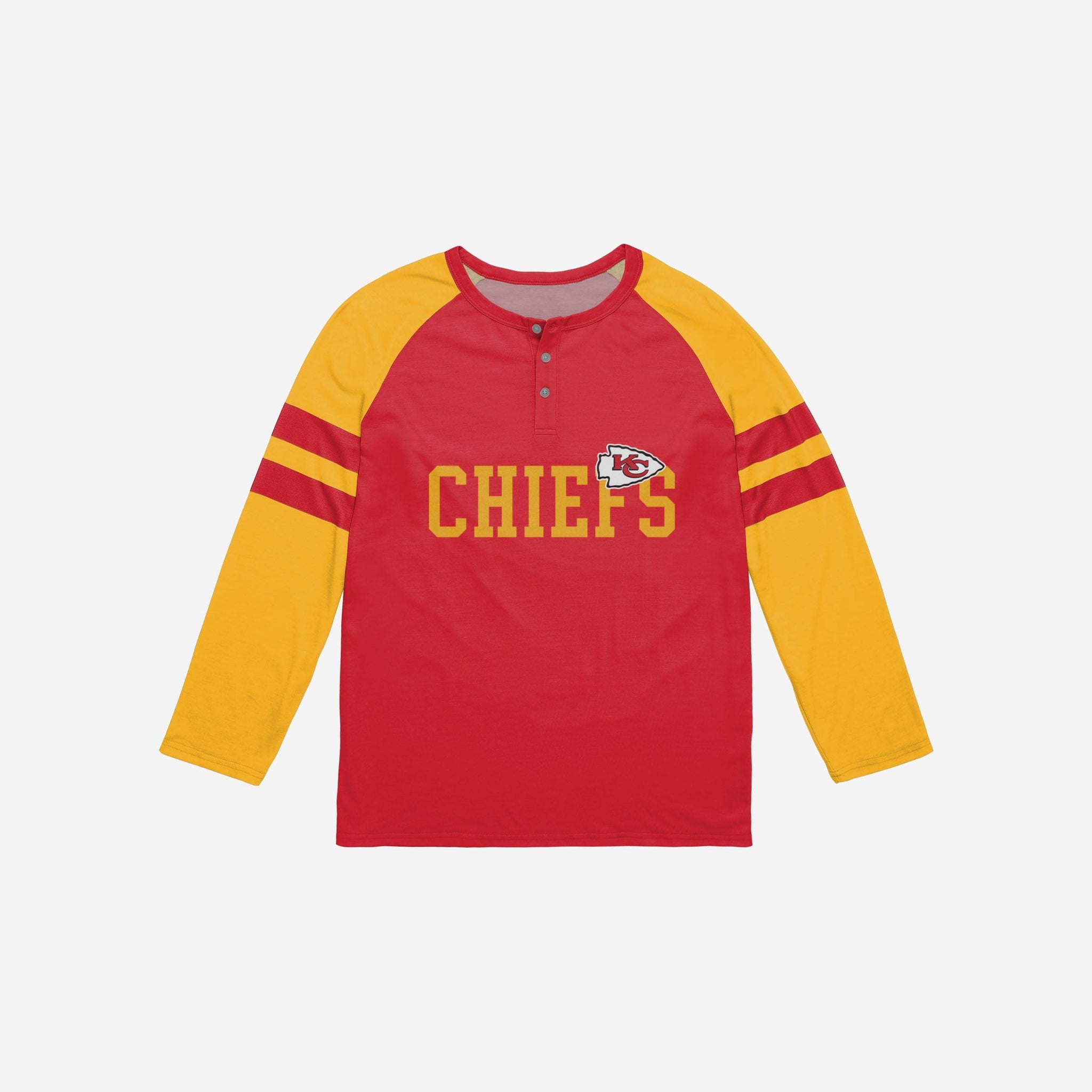 Long sleeves to keep you warm. Sleek style to keep you cool. Bring some sensational style to the game or wherever your team spirit takes you with this Kansas City Chiefs Team Stripe Wordmark Long Sleeve Henley.