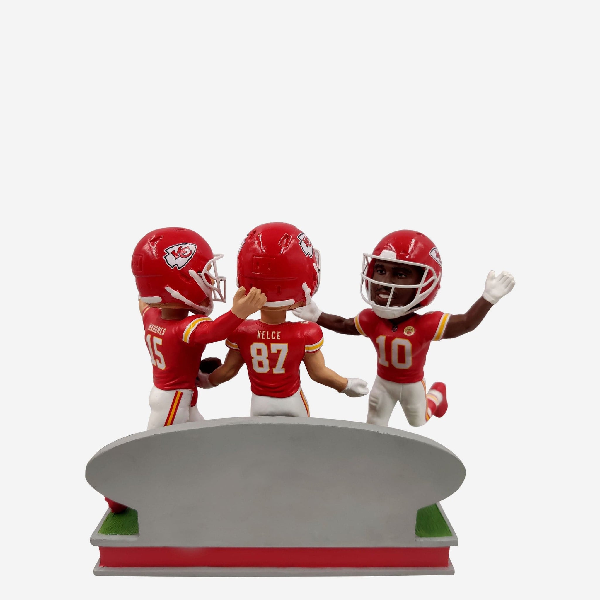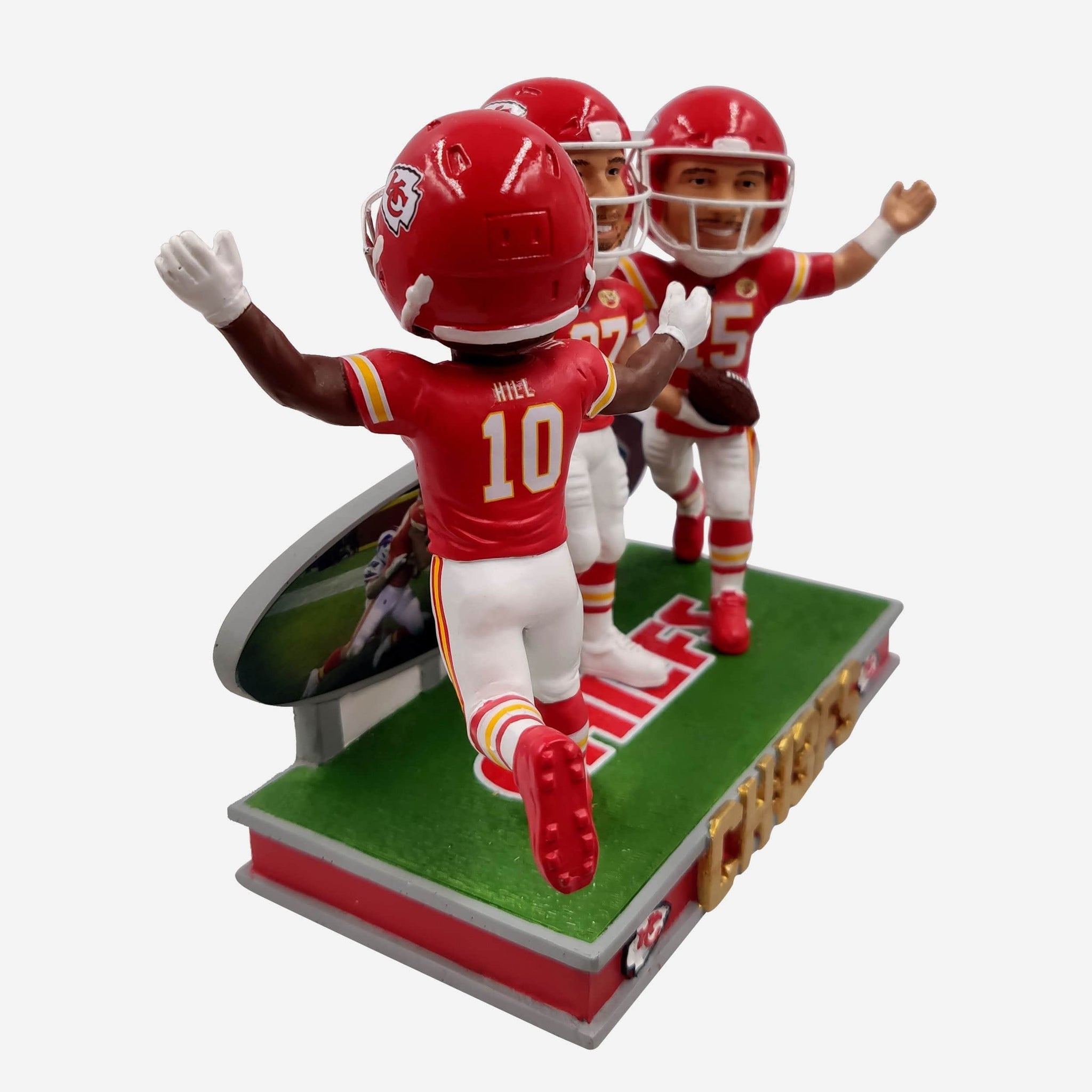 • Portrays Patrick Mahomes, Tyreek Hill, and Travis Kelce wearing their gameday uniforms in celebratory poses for a triple dose of KC greatness