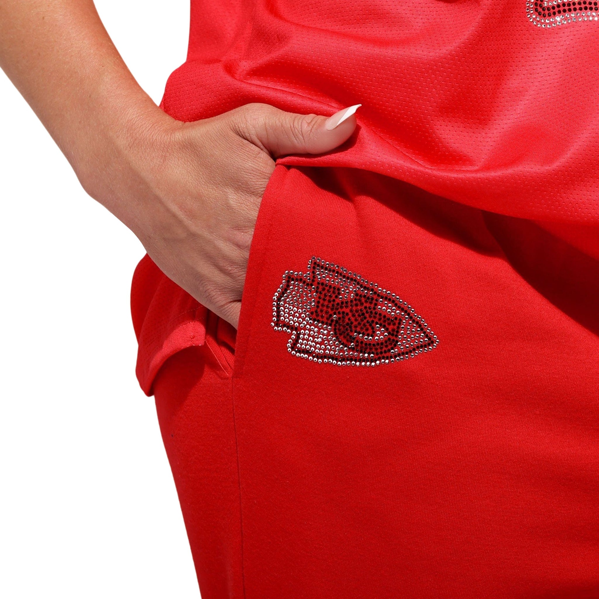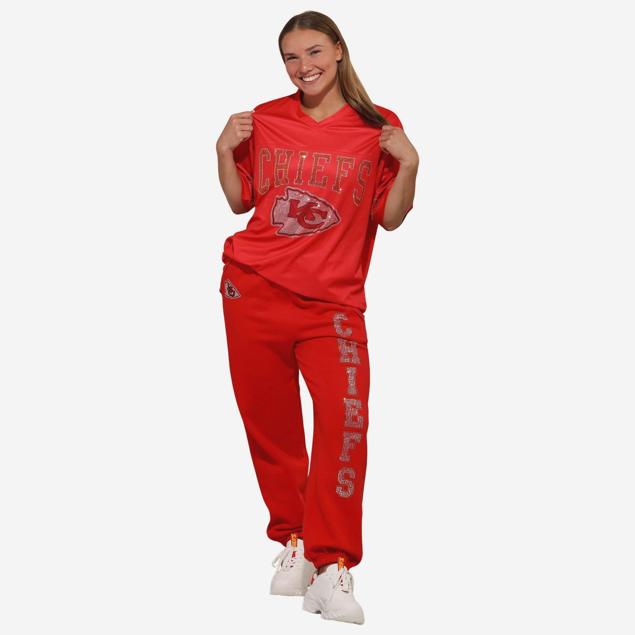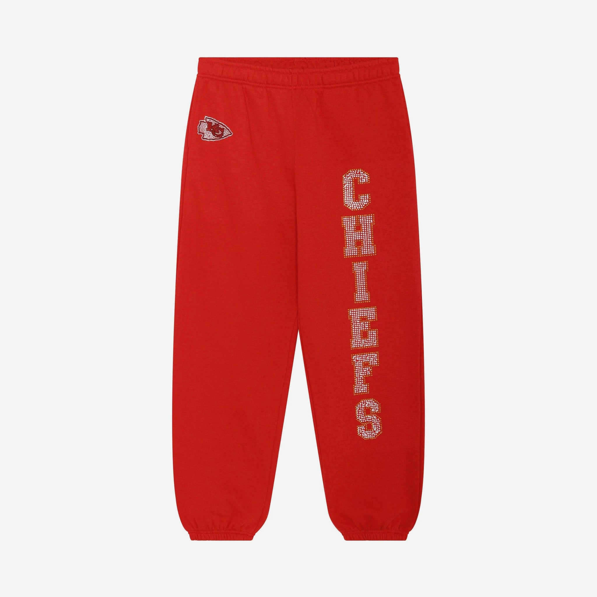 Turn your team spirit into a style statement with the Kansas City Chiefs Womens Wordmark Rhinestone Sweatpants. Designed for fans who love a little glam, these sweatpants feature rhinestone logo and wordmark details that shimmer with every step. Stand out. Stay cozy.