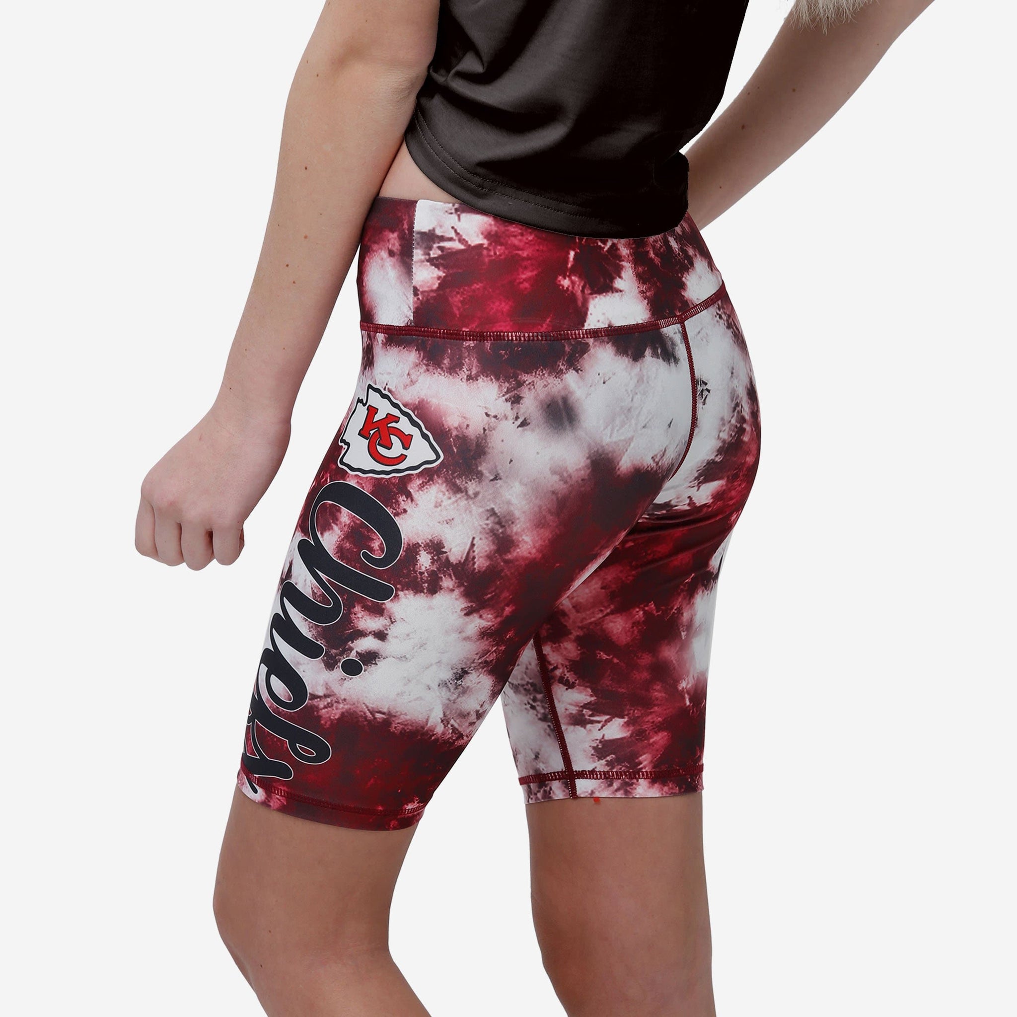 Workout checklist: Your protein shake, your exercise app, and your team spirit! Make sure you've got a whole lot of that last one with these Kansas City Chiefs Team Color Tie Dye Bike Shorts.