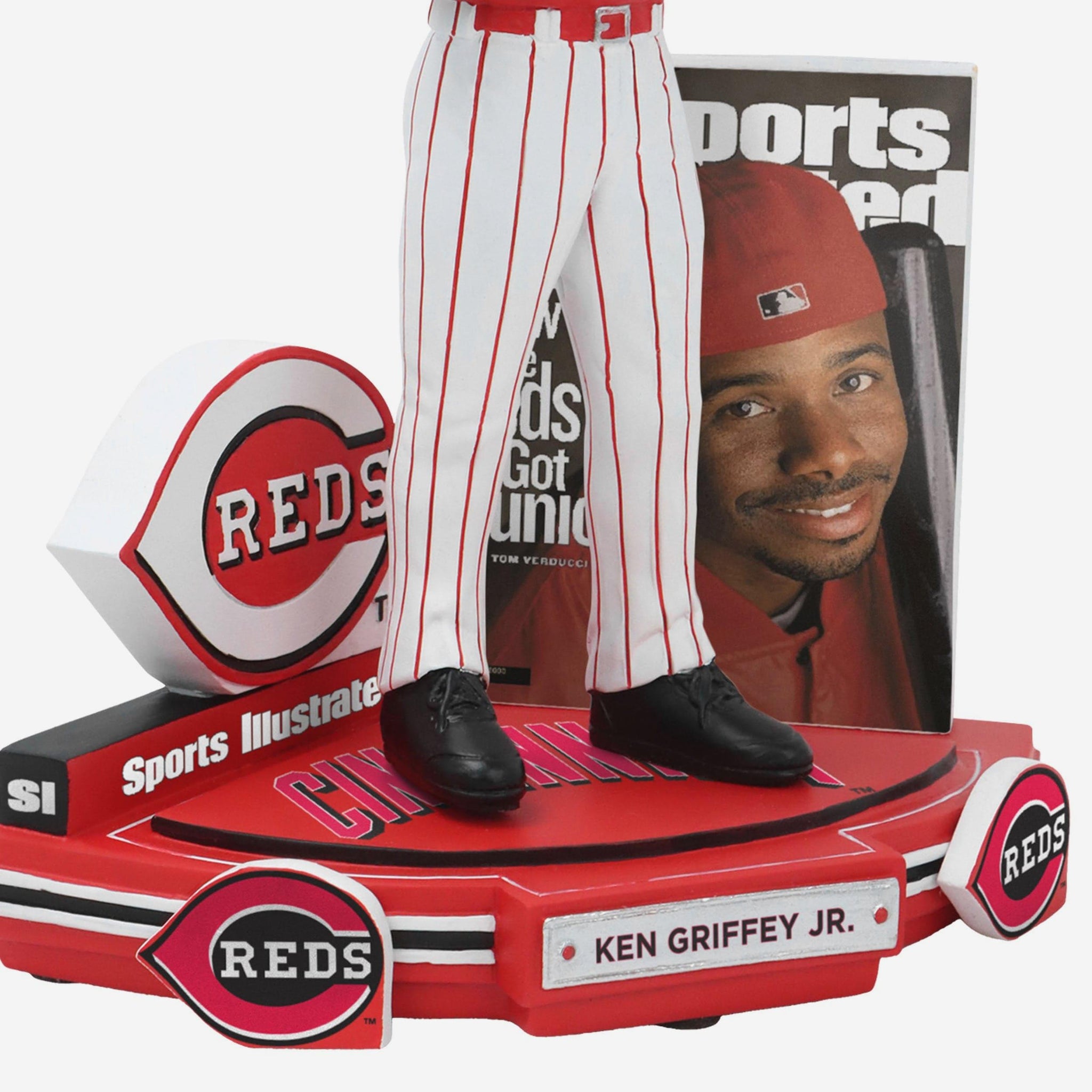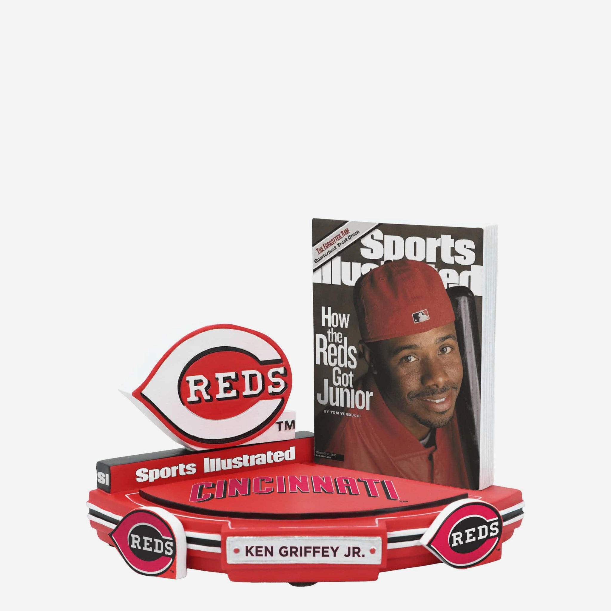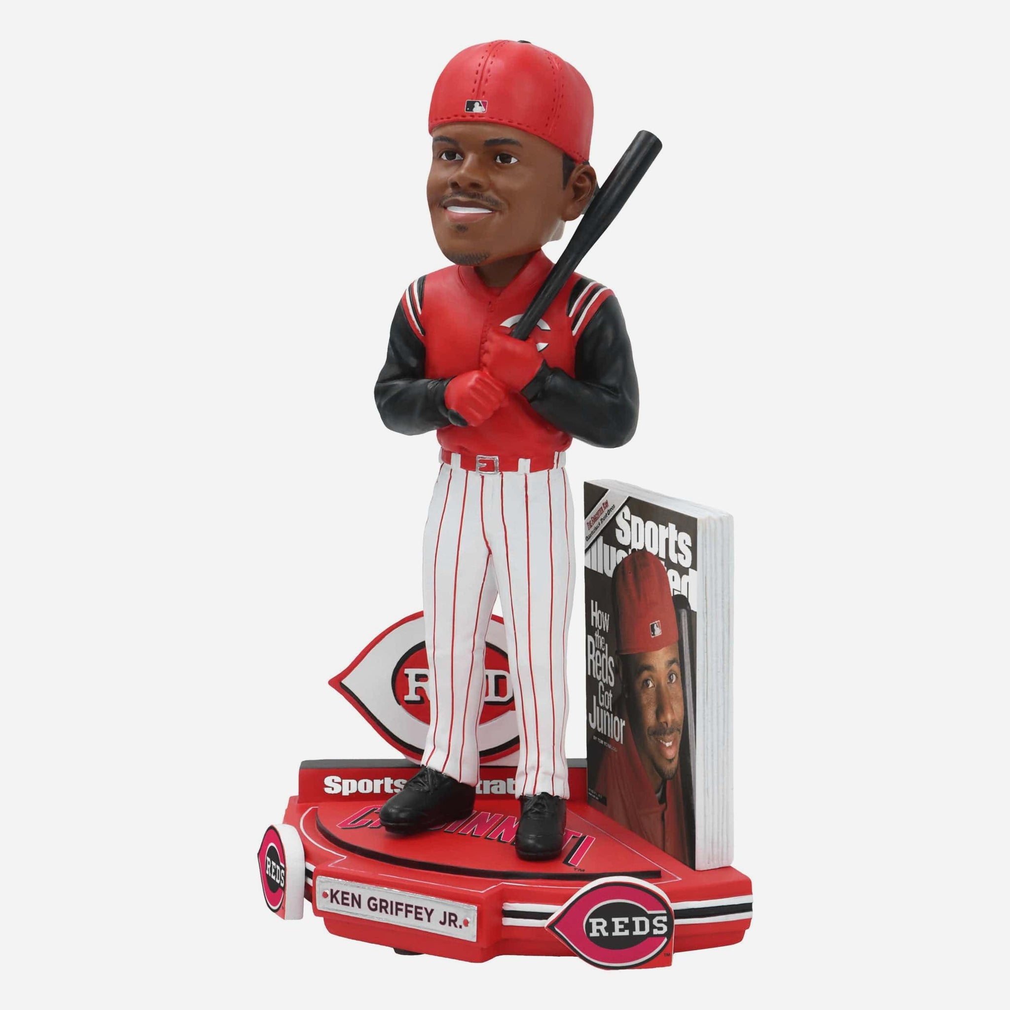 The swing. The smile. The spotlight. Add this front-page phenom to your fancave with the Ken Griffey Jr. Cincinnati Reds How The Reds Got Junior Sports Illustrated Cover Bobblehead.