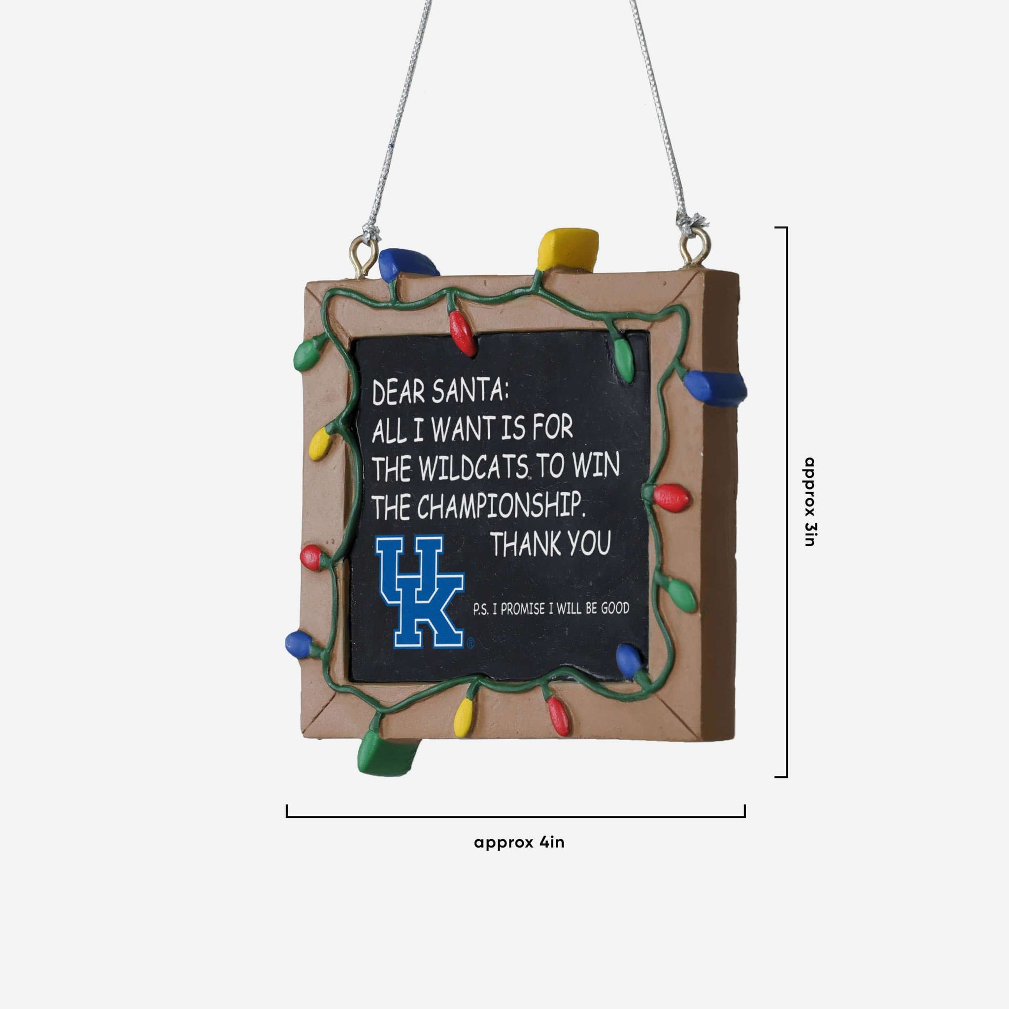 So, you made your list and sent it to jolly ol' Fanta Claus, asking him for a championship. But sometimes letters can get lost in the mail. Just in case, put this Kentucky Wildcats Resin Chalkboard Sign Ornament on your tree to let him know how good you've been this year, and that all you want for the holidays is a trophy.