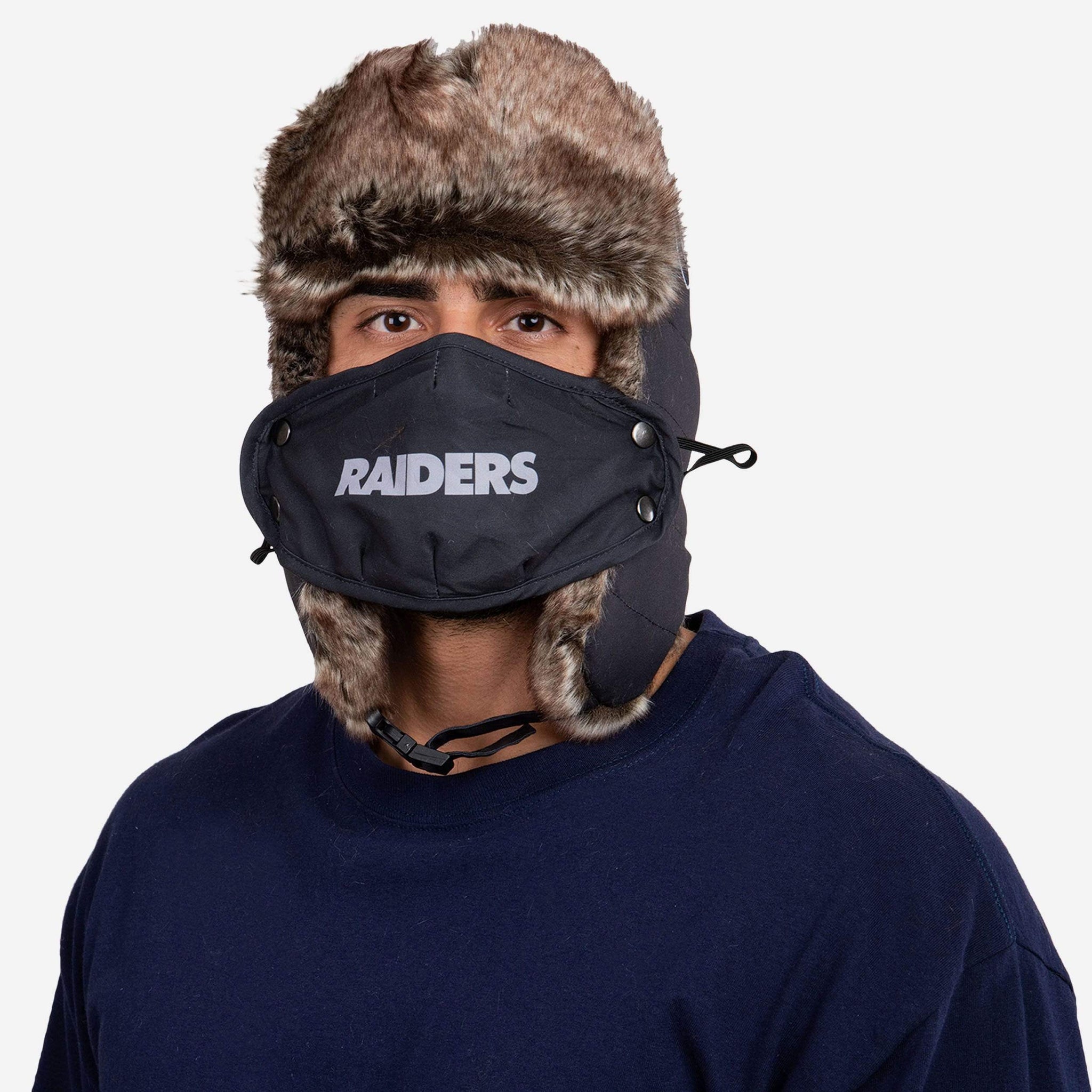 Getting chilly out? Don't worry. We've got you covered! Look cool and stay nice and warm in this Las Vegas Raiders Big Logo Trapper Hat with Face Cover!