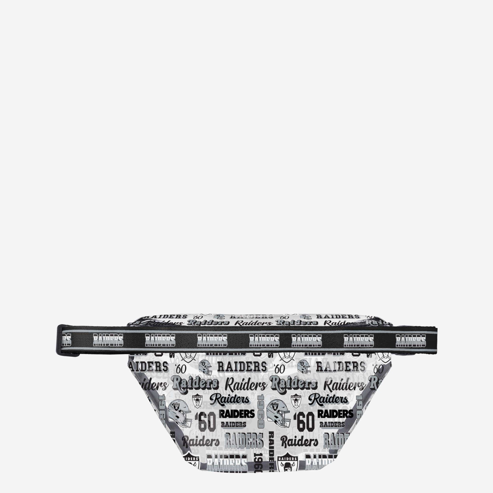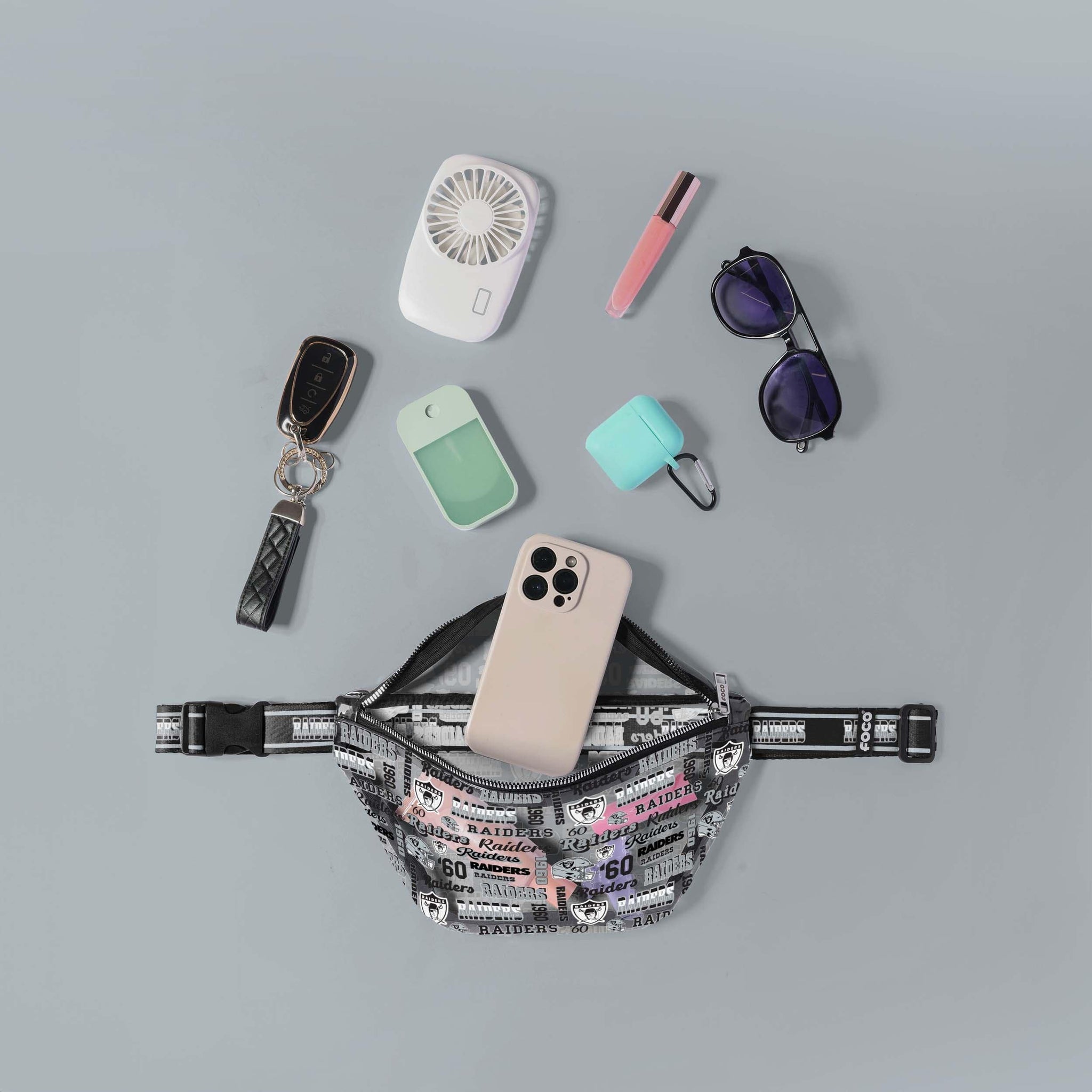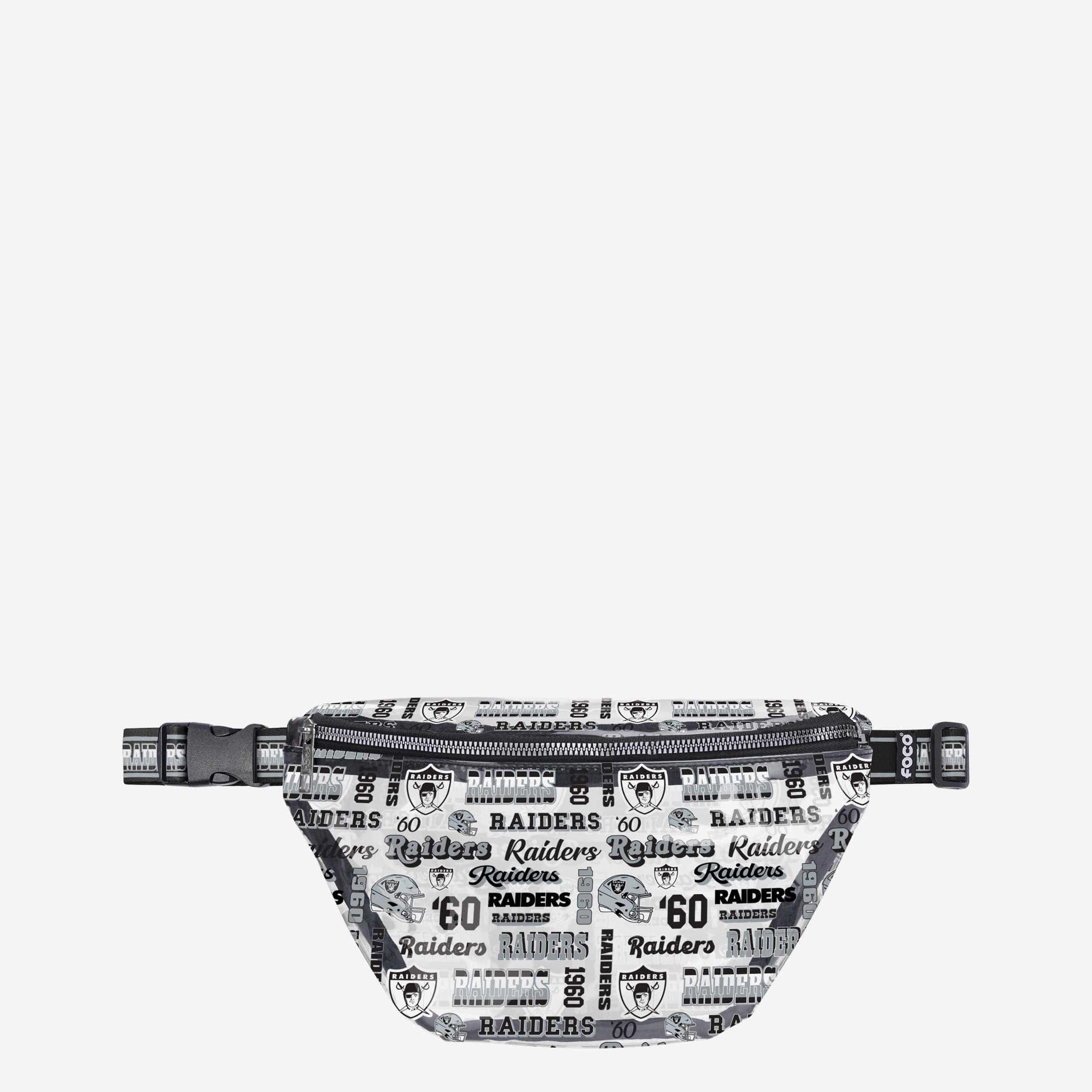 - Repeat Las Vegas Raiders current and retro team logo and wordmark displays on the fanny pack, in case there were any doubts where your allegiances lie