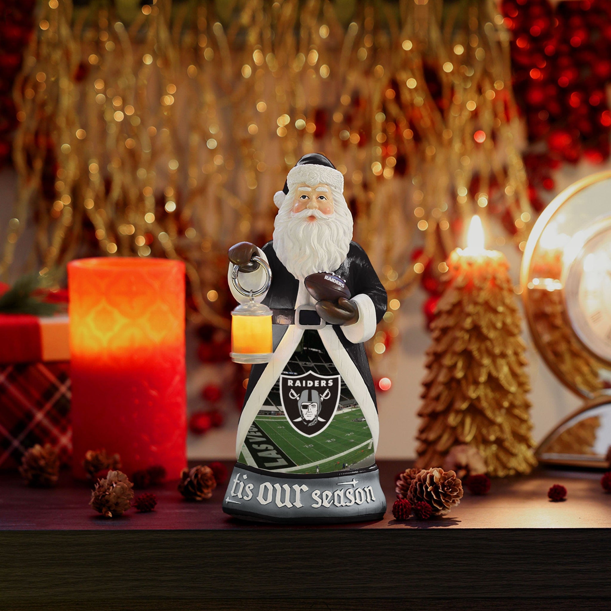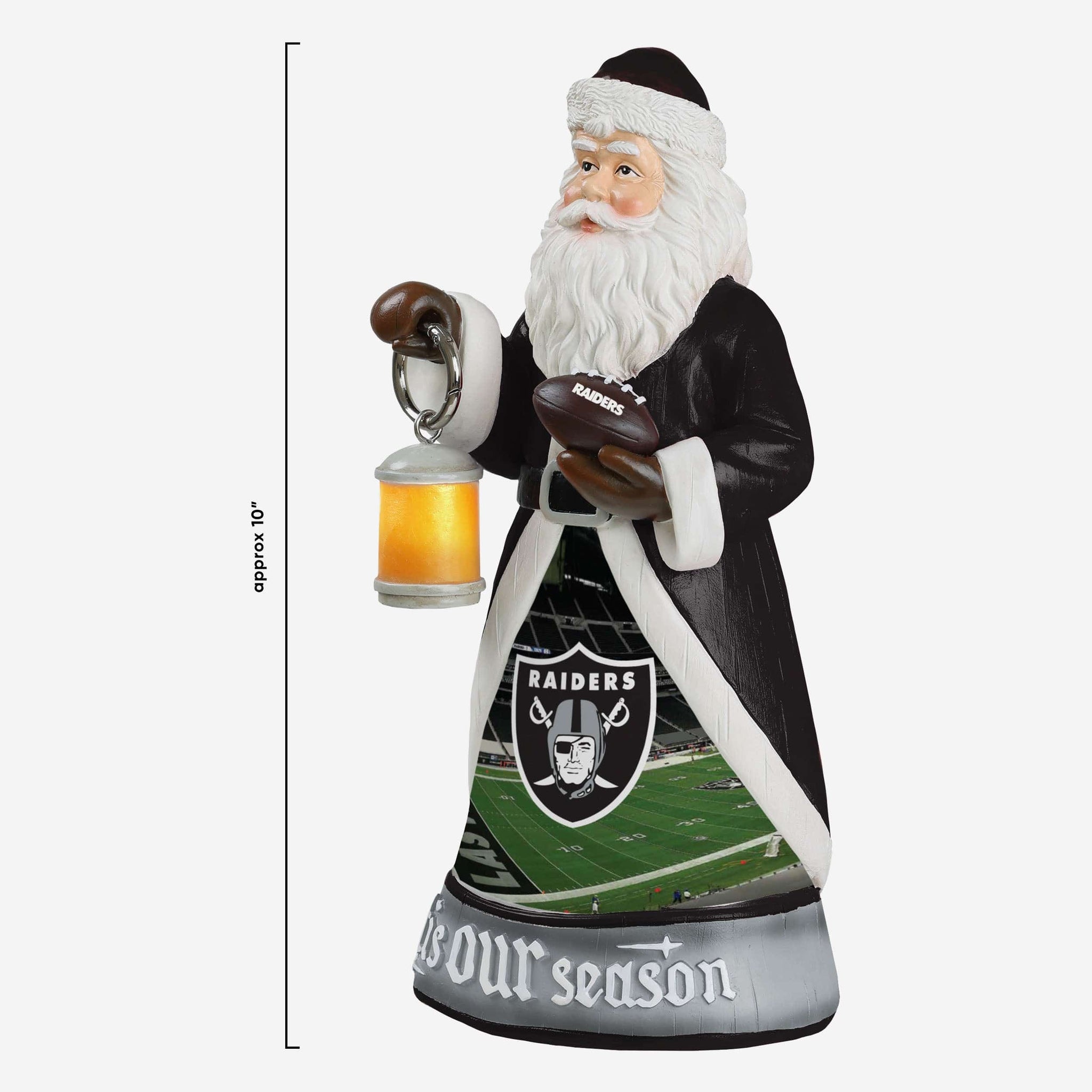 Santa is here to light the way to holiday team spirit! Everyone will know 'tis OUR season when you've got this Las Vegas Raiders Santa Figure with Light Up Lantern on display!
