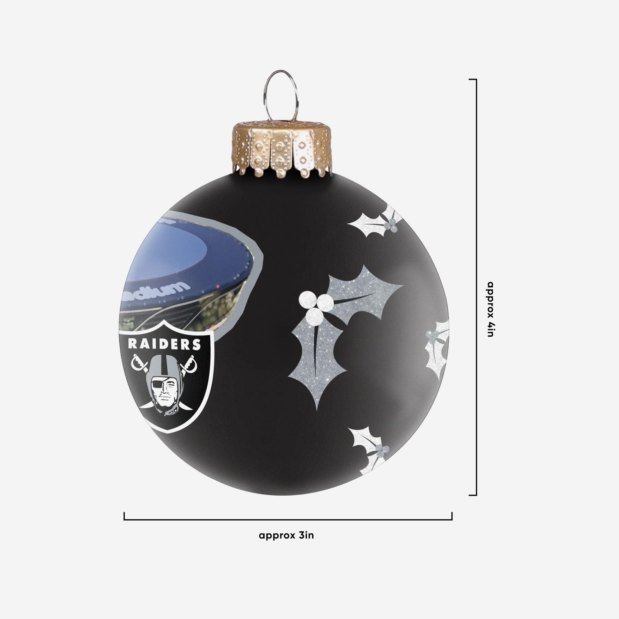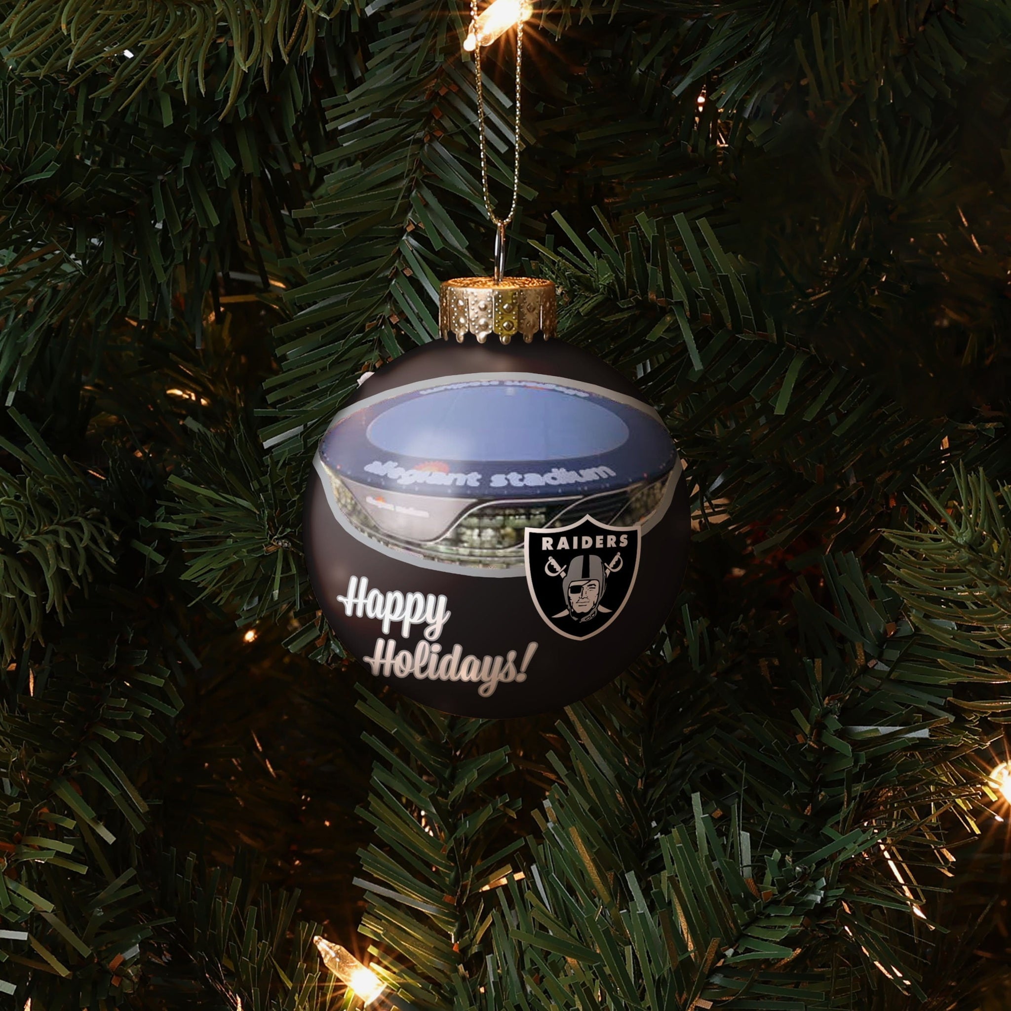 Bring some home field advantage to your home for the holidays. Now every day will feel like gameday during the holidays with this Las Vegas Raiders Stadium Print Glass Ball Ornament on display!