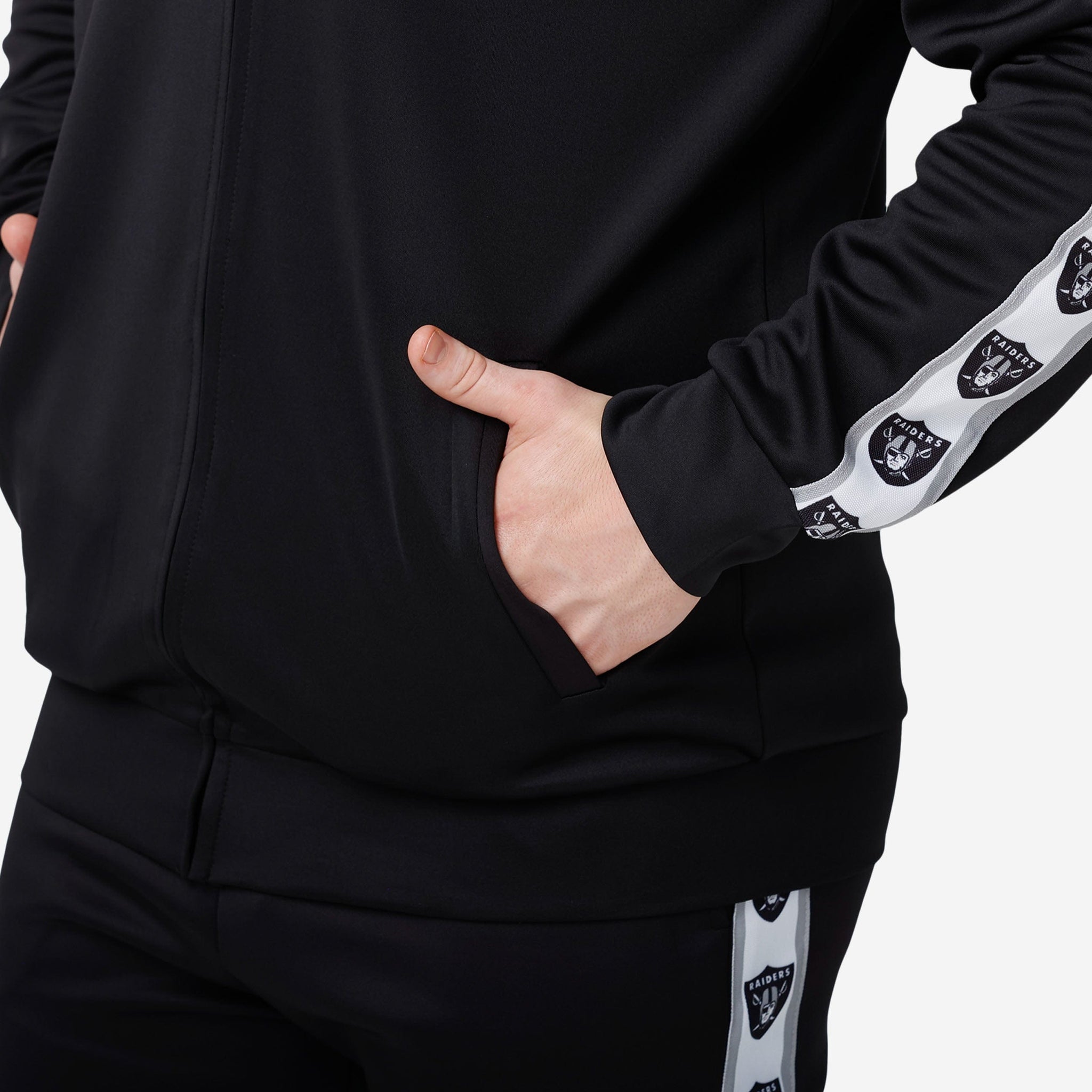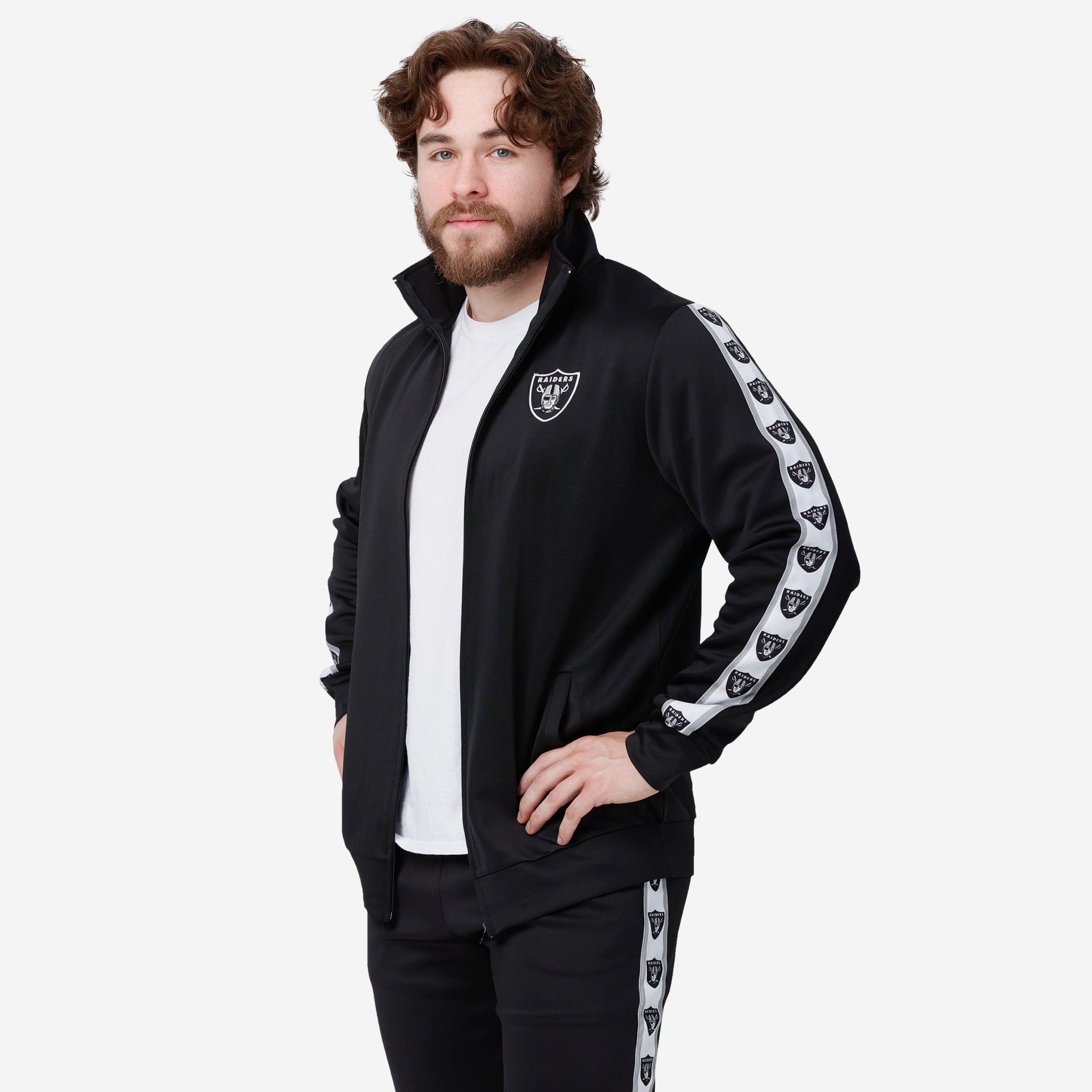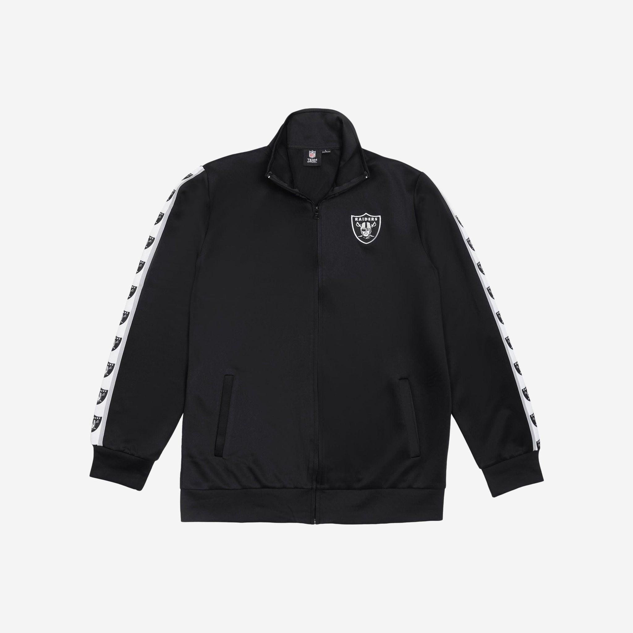 A jacket that you'll be jacked up to wear. Bundle up for your jog around the block with this Las Vegas Raiders Stripe Logo Track Jacket.