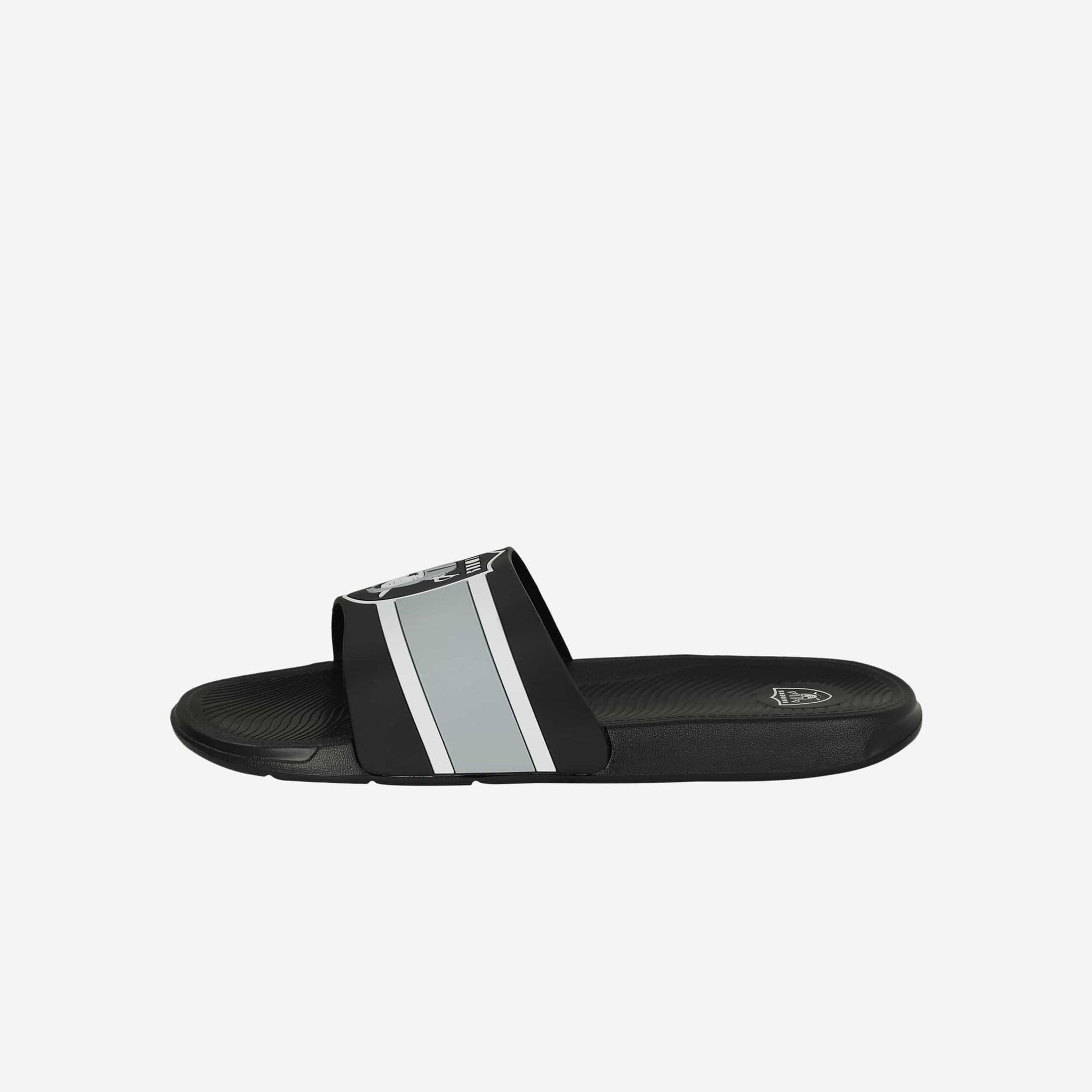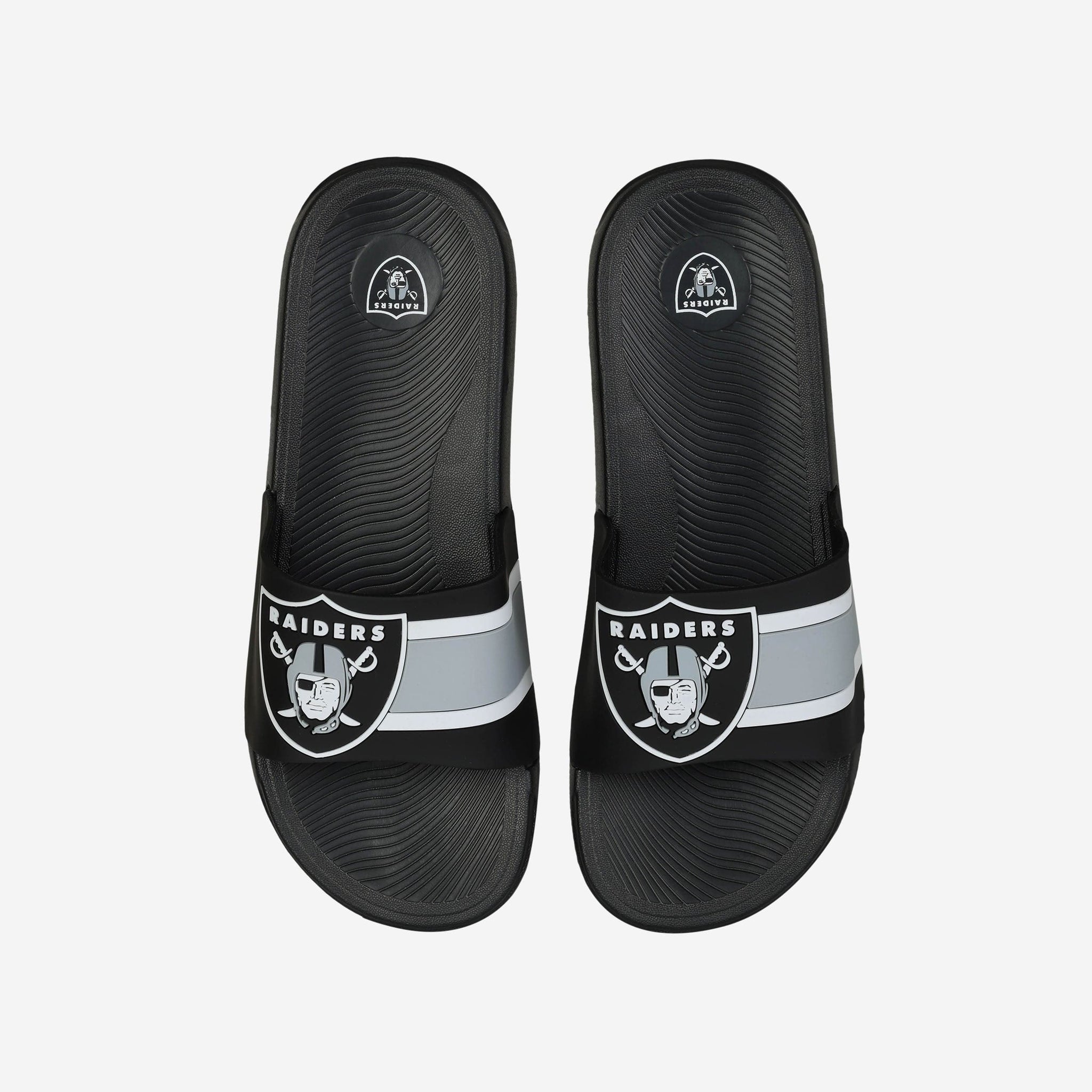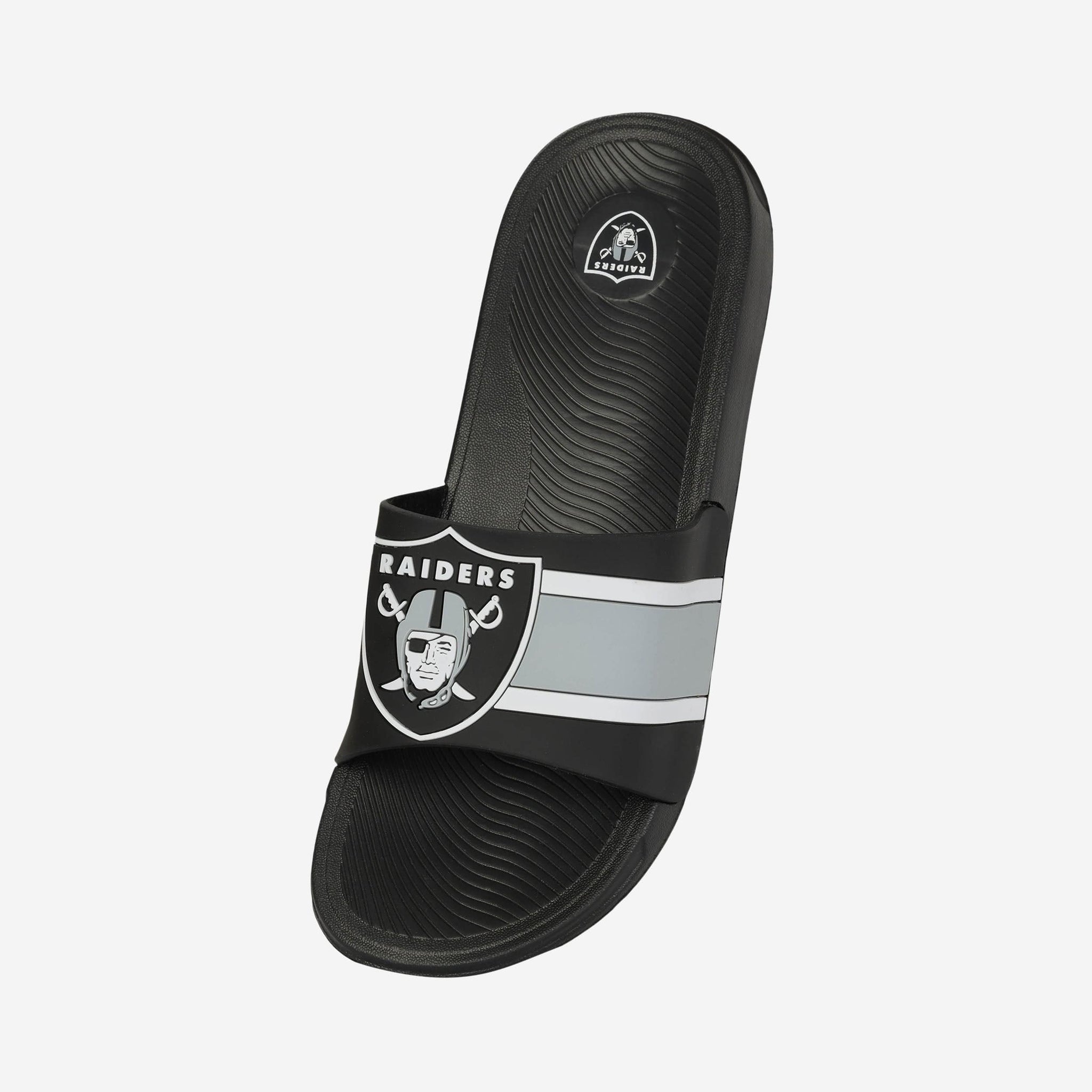 These Las Vegas Raiders Striped Big Logo Raised Slides give a whole new meaning to the idea of putting some pep in your step.
