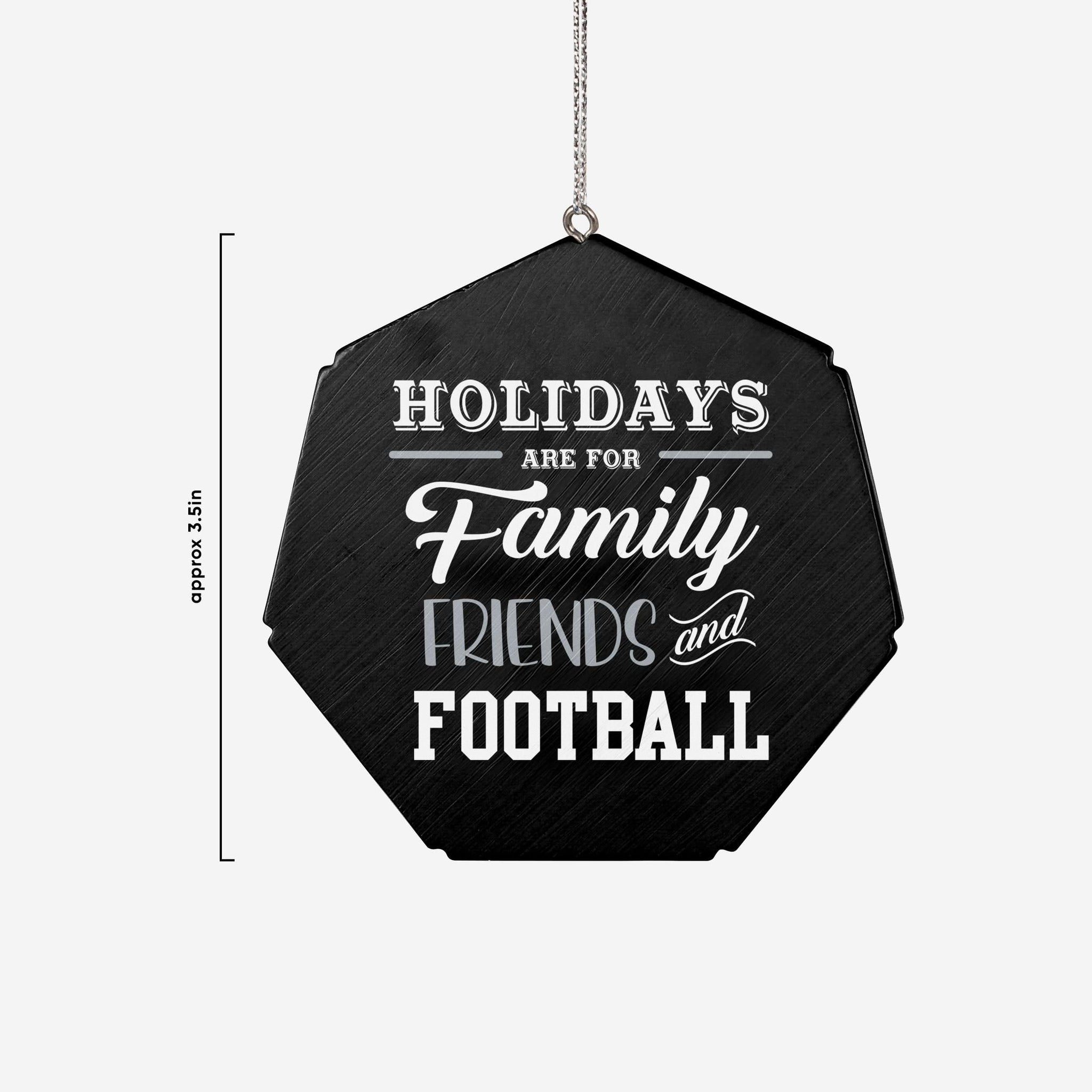 - ”HOLIDAYS ARE FOR FAMILY FRIENDS AND FOOTBALL” text display on reverse side of ornament