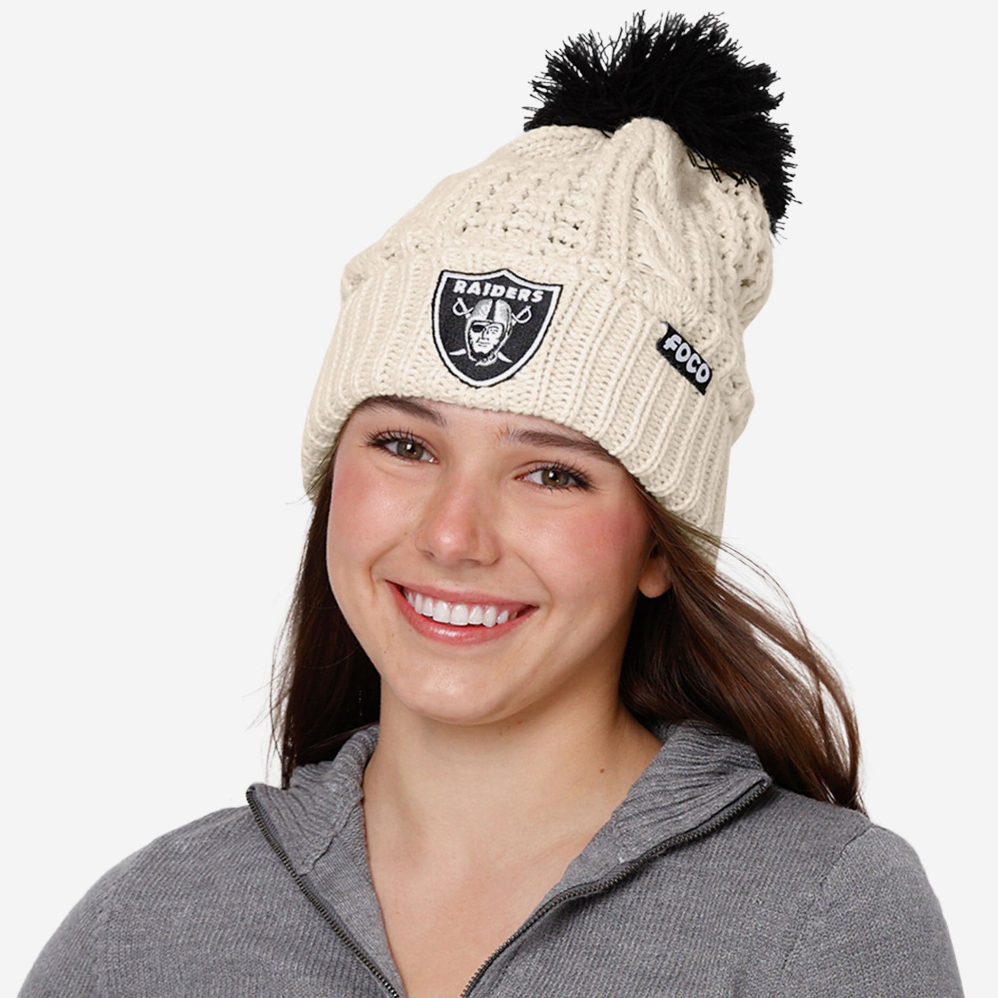 Putting together the ultimate fit for the tailgate and beyond? Make sure to get your head in the game with the Las Vegas Raiders Women's Primary Logo White Cable Knit Pom Beanie!