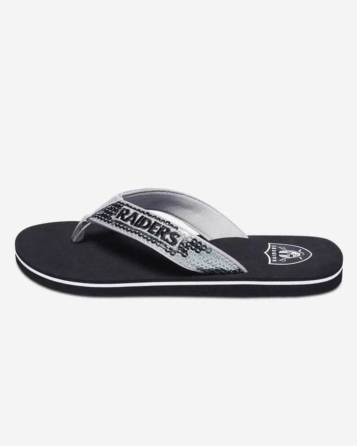 Nothing comes close to shining as bright as your team spirit. Well, nothing other than these Las Vegas Raiders Womens Sequin Flip Flops. Rock your fandom in comfort and style. Just don't be surprised when people need sunglasses when they look at you.