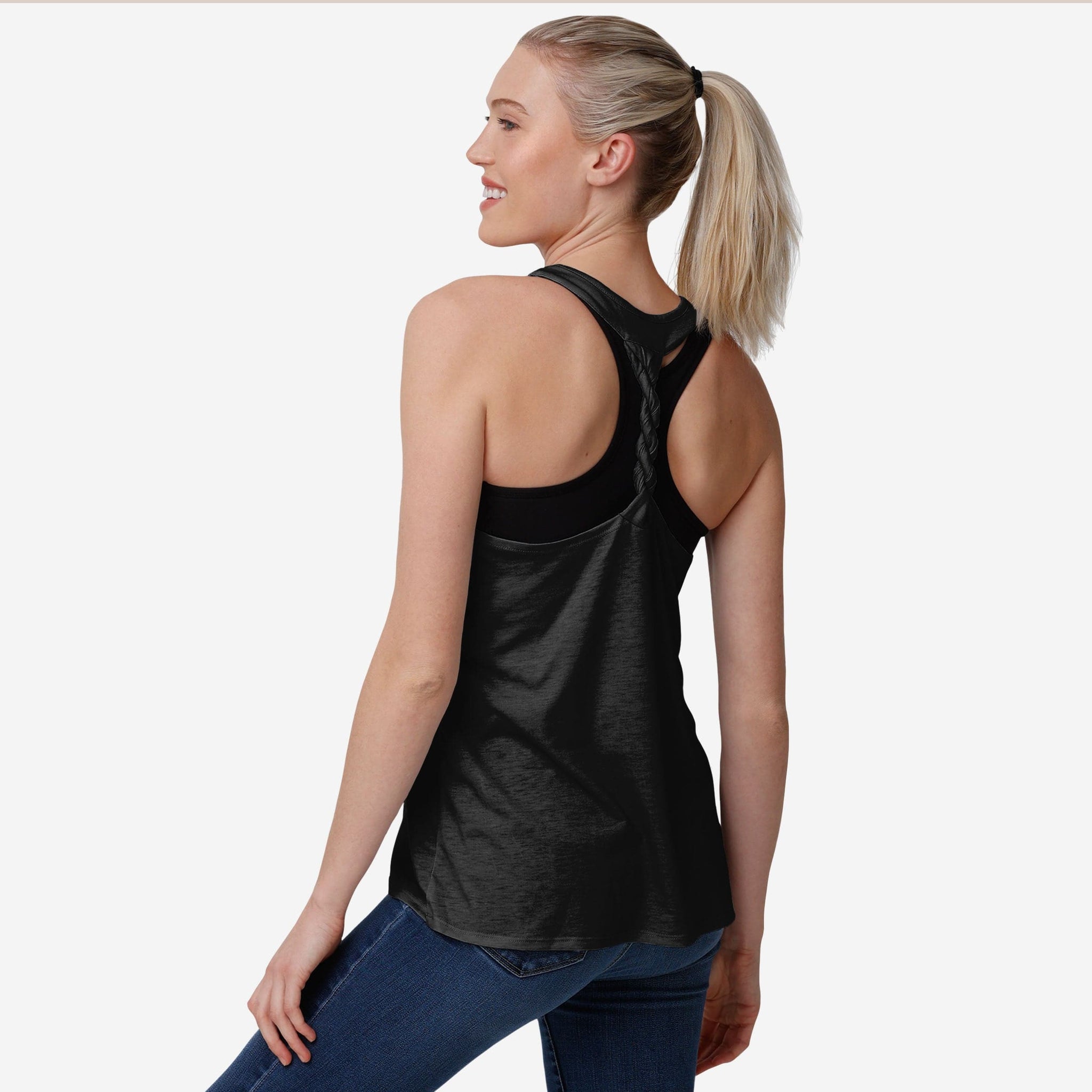 Get ready to flex your fan muscles, with a twist. Literally. This Las Vegas Raiders Women's Team Twist Sleeveless Top shows off your team spirit and will have you looking good at the beach, in the gym, or wherever else you feel like showing everyone what a true fan looks like.
