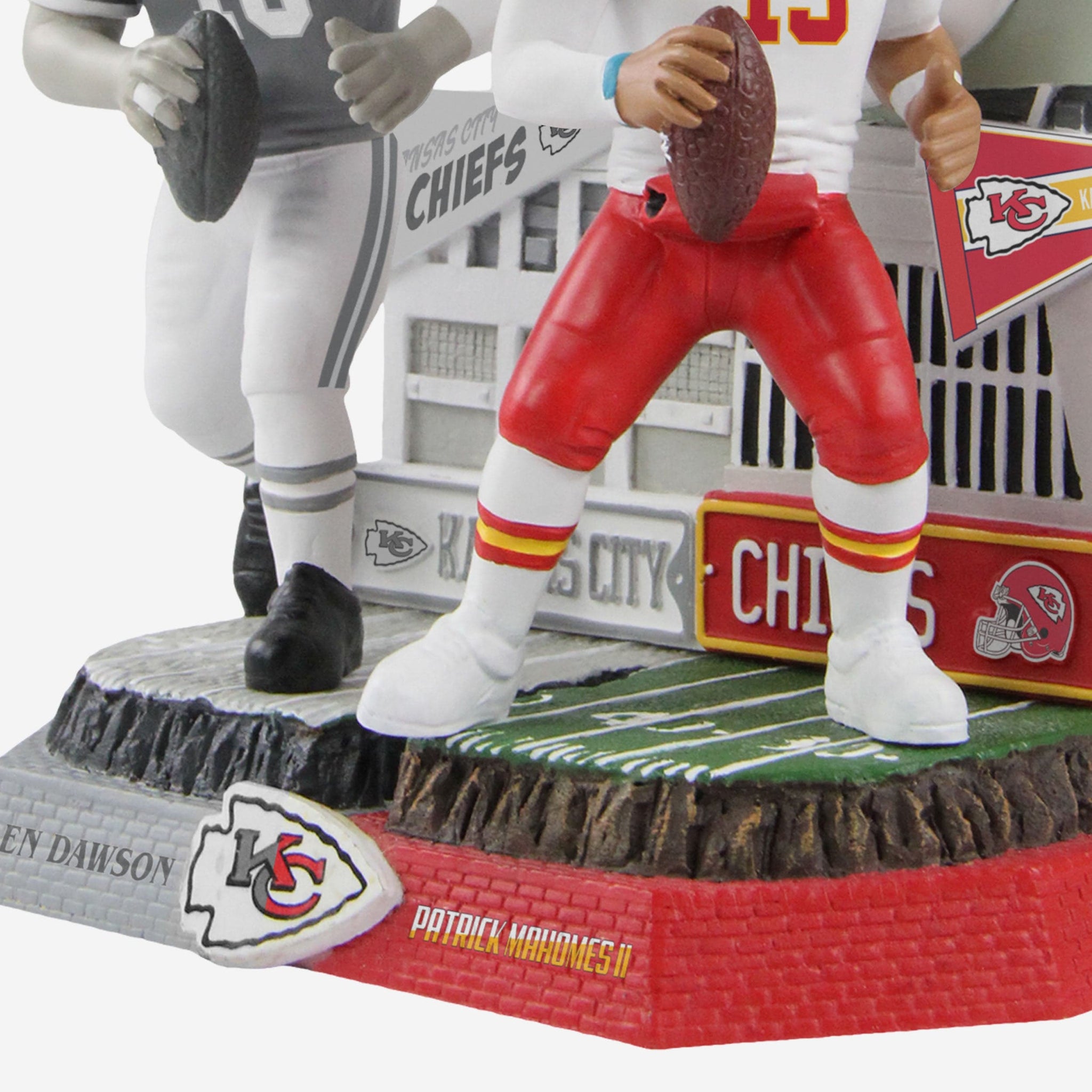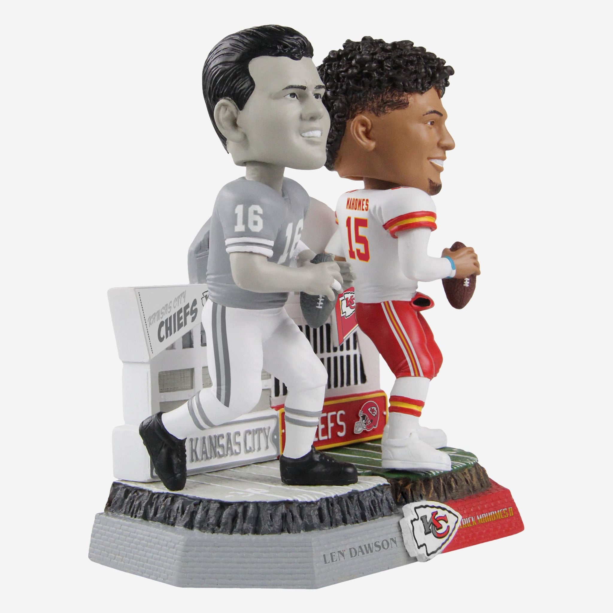 Chiefs Kingdom, you're not seeing double. Not one, but two iconic QBs are here to sling it with the Len Dawson & Patrick Mahomes Kansas City Chiefs Then and Now Bobblehead.
