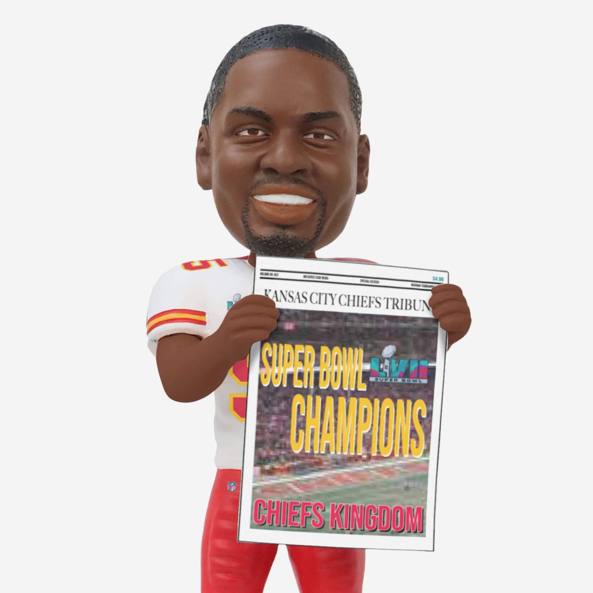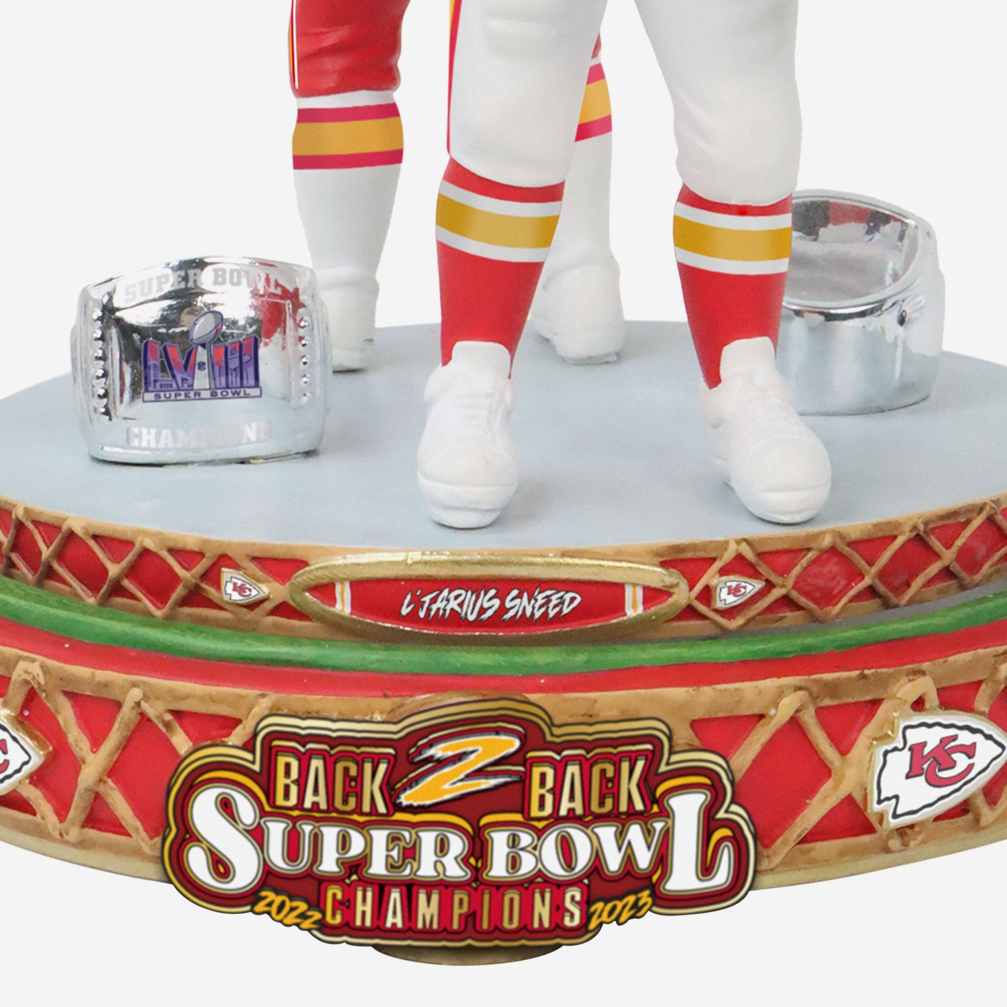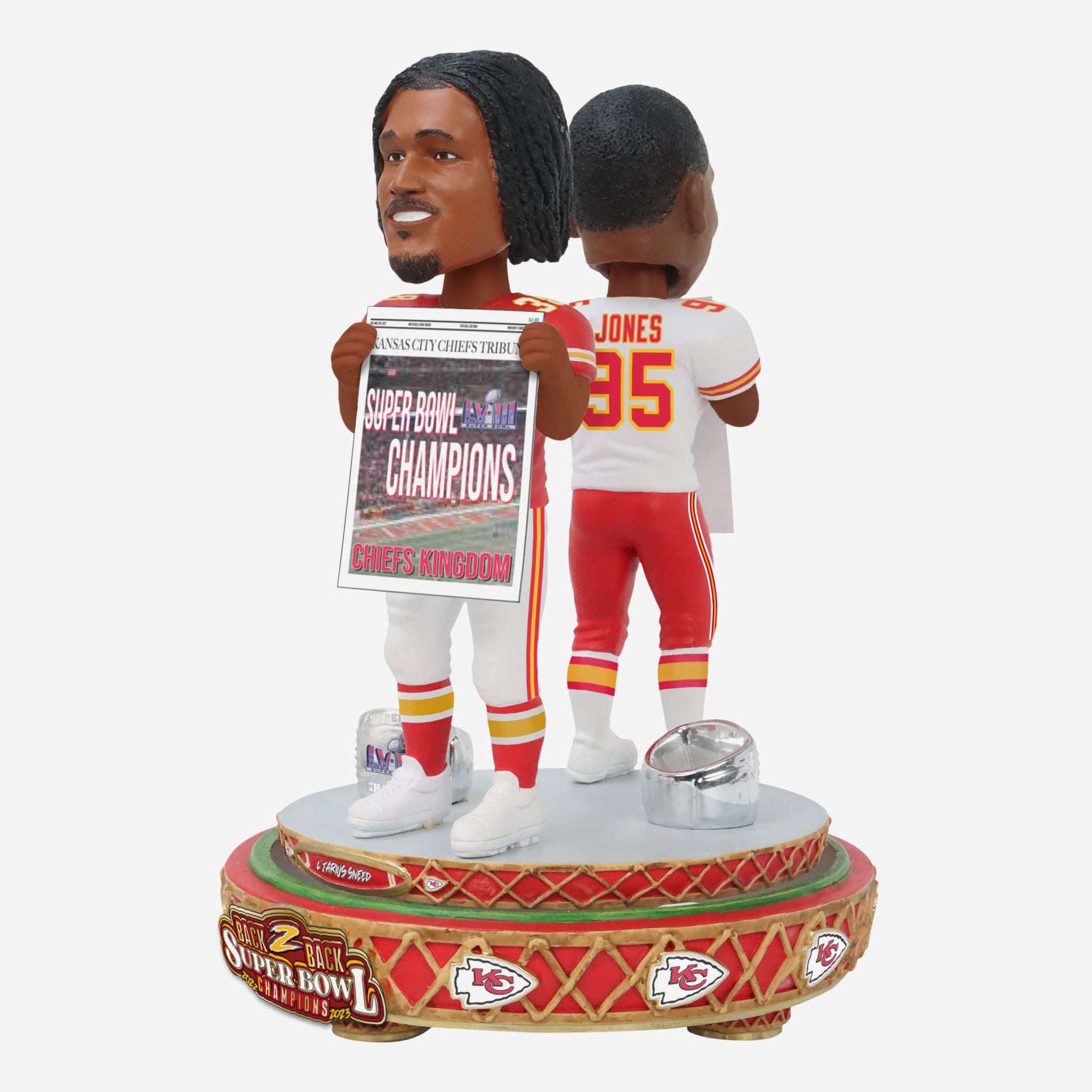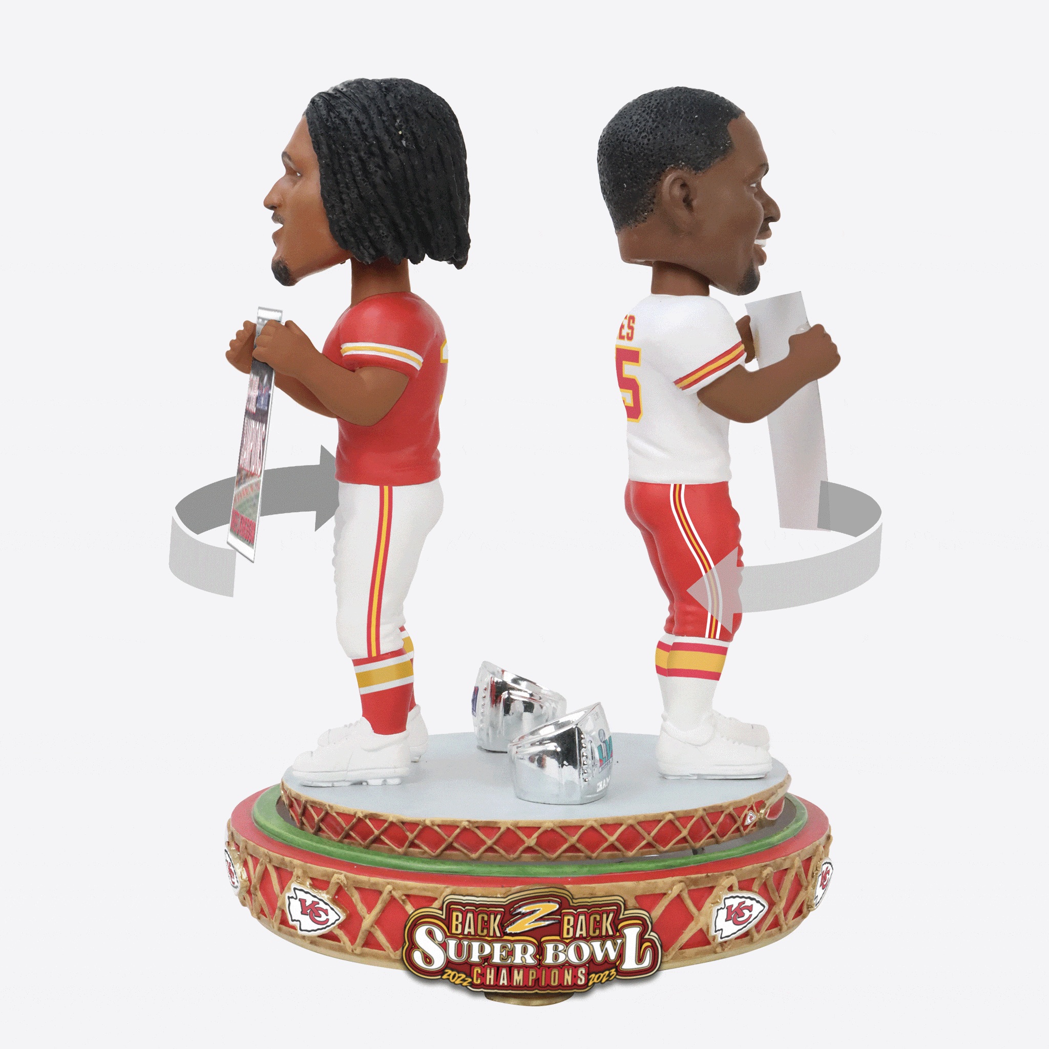 Two Super Bowl winners. One spinning bobble! The back-to-back champions are showing out in your collection with the L’Jarius Sneed & Chris Jones Kansas City Chiefs Super Bowl LVIII Champions Dual Spinner Bobblehead