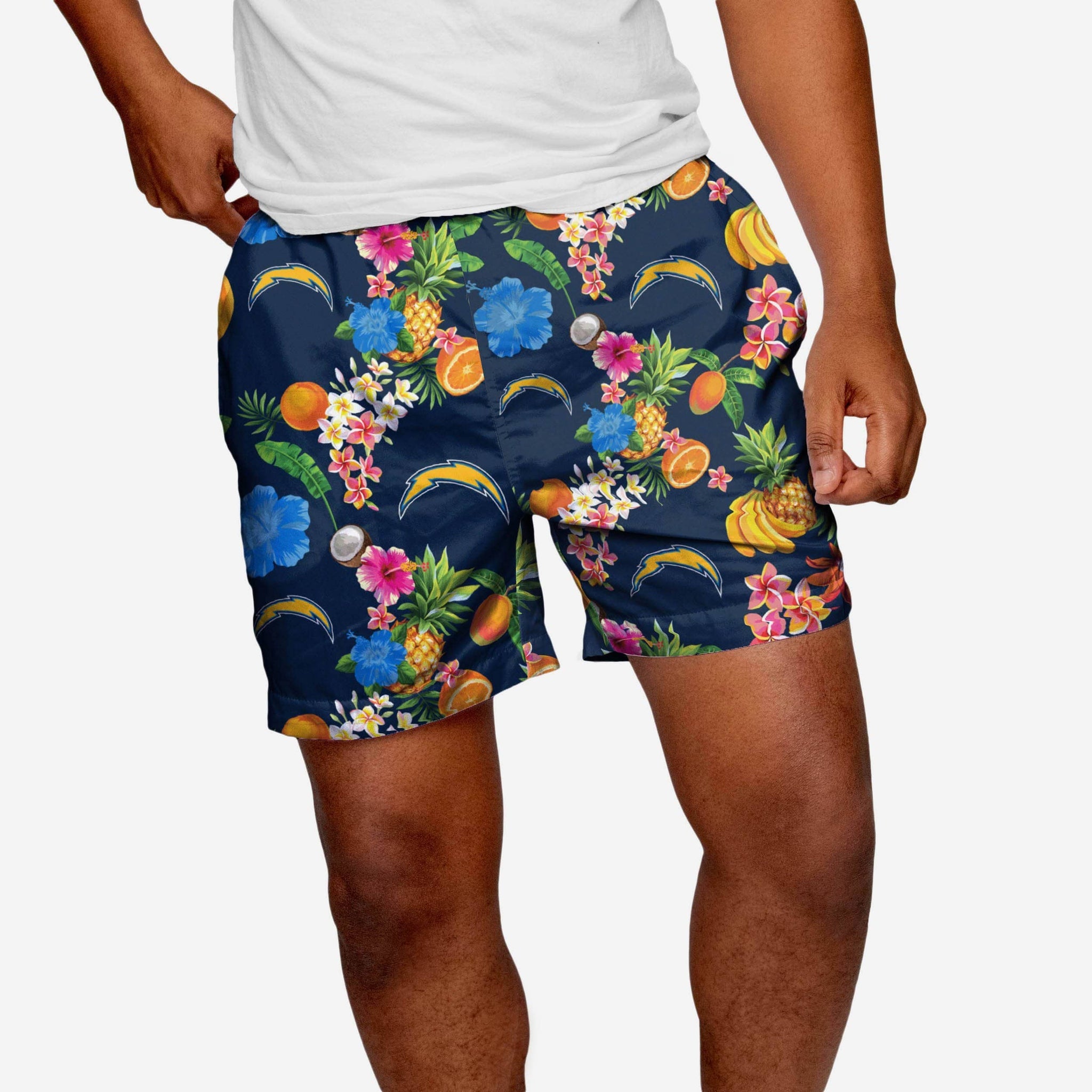 Your cannonballs will be epic. Your toned calves will be on display. You're gonna look like a juicy snack. Why? Because you're going to own the summer in these Los Angeles Chargers Fruit Life 5.5" Swimming Trunks.