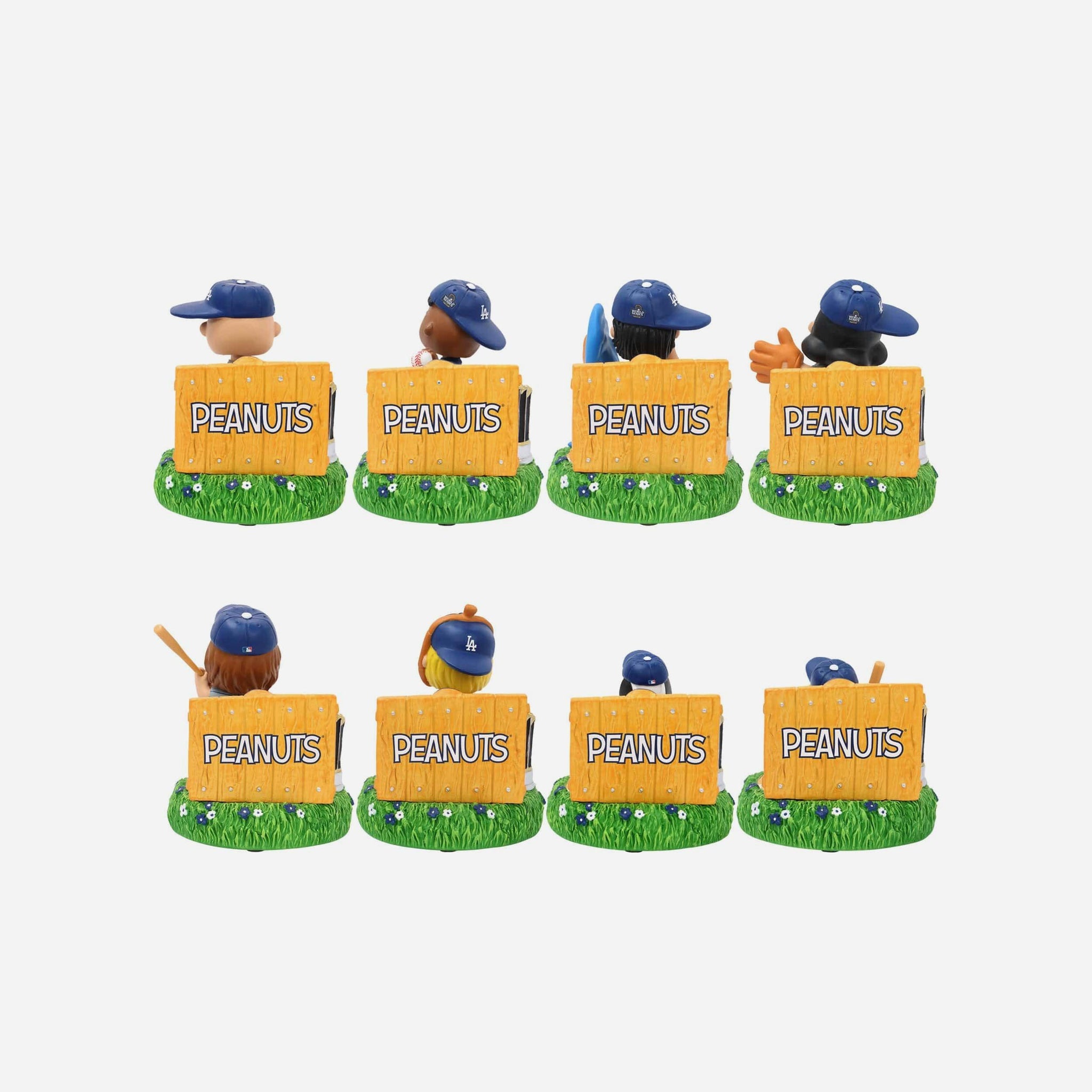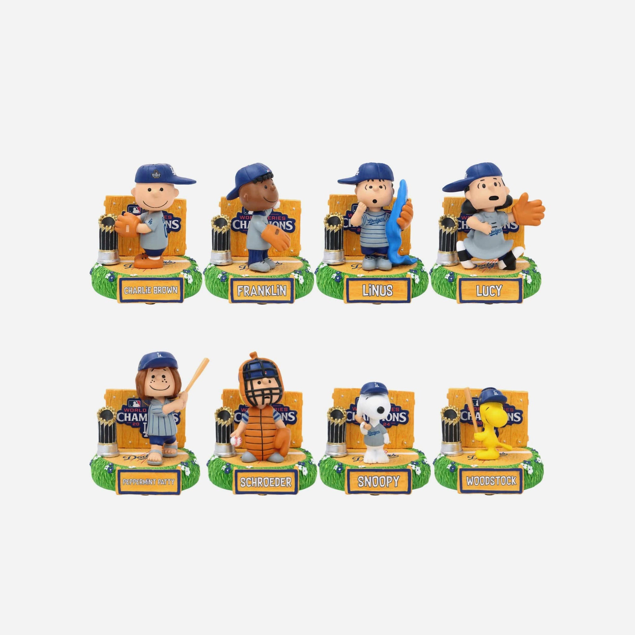 - Set includes Charlie Brown, Snoopy, Lucy, Linus, Schroeder, Franklin, Peppermint Patty, and Woodstock wearing the Dodgers grey gameday uniforms, ready to keep the World Series celebration going