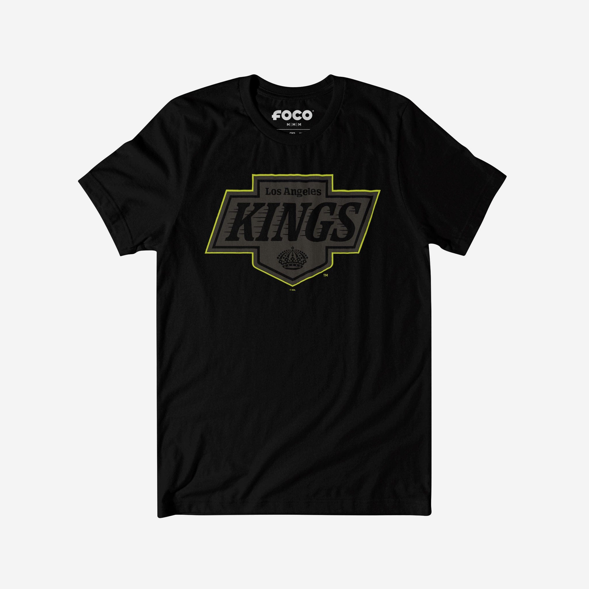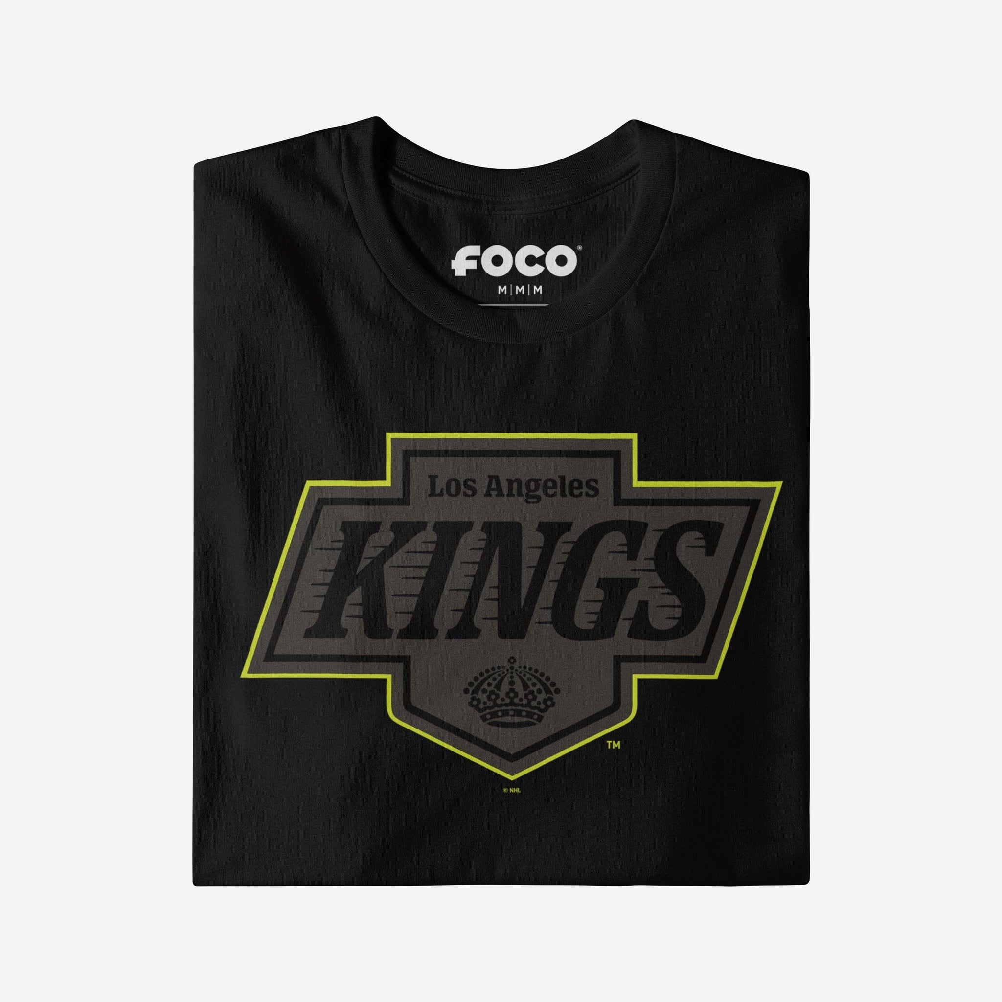 - Team logo display with highlight outline: The front of this apparel features a black Los Angeles Kings team logo display outlined in neon, and a neon wordmark team name display