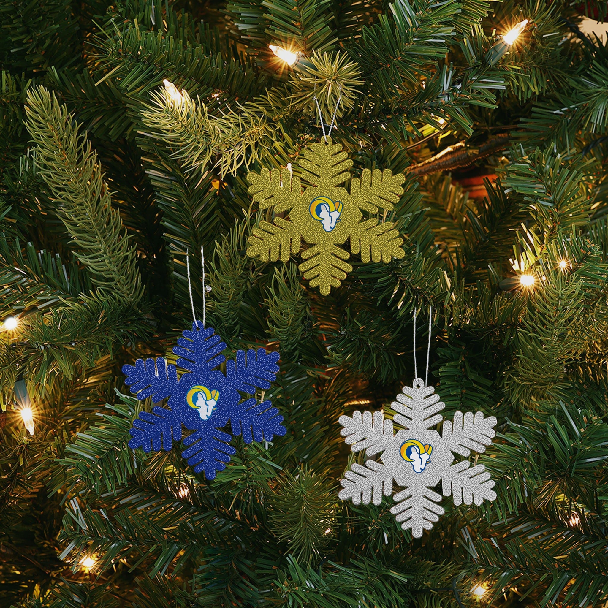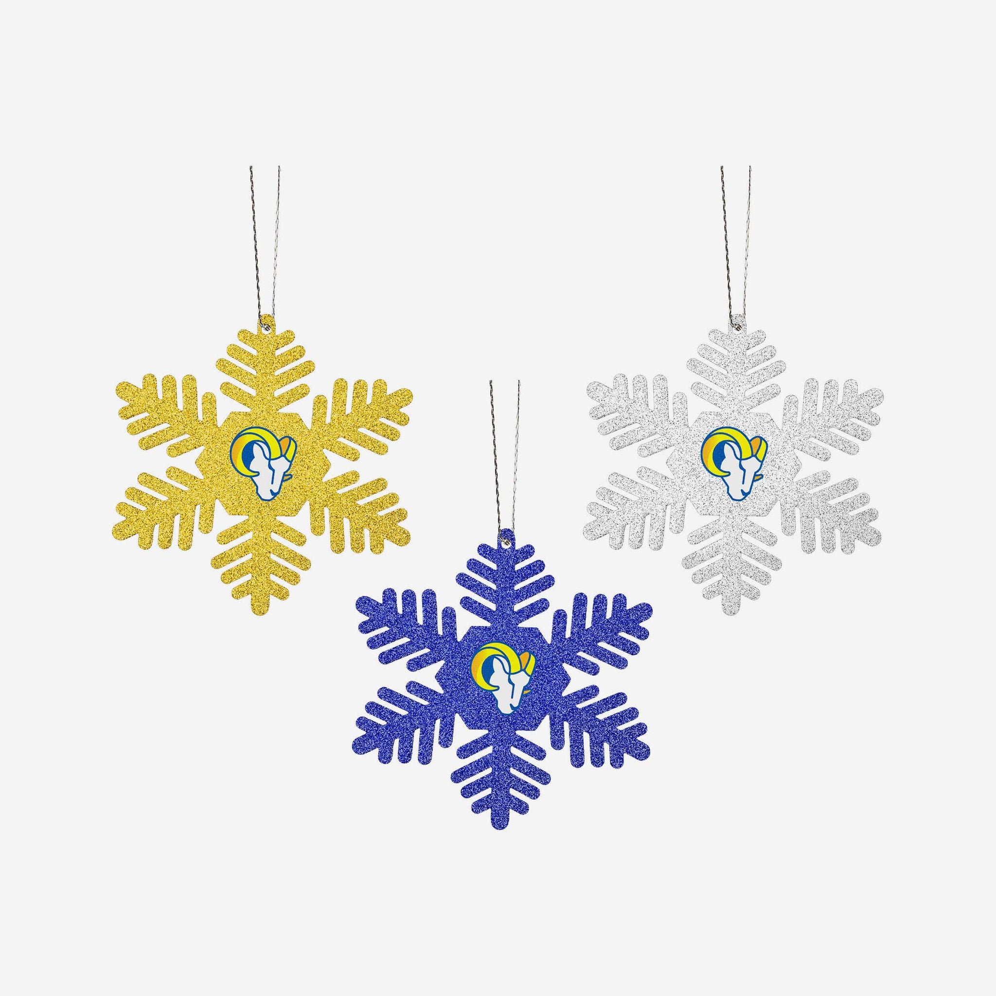 One half "Let it Snow", one half "Go Team Go!" This holiday season, let your team spirit AND holiday spirit shine by proudly displaying this Los Angeles Rams 3 Pack Metal Glitter Snowflake Ornament!