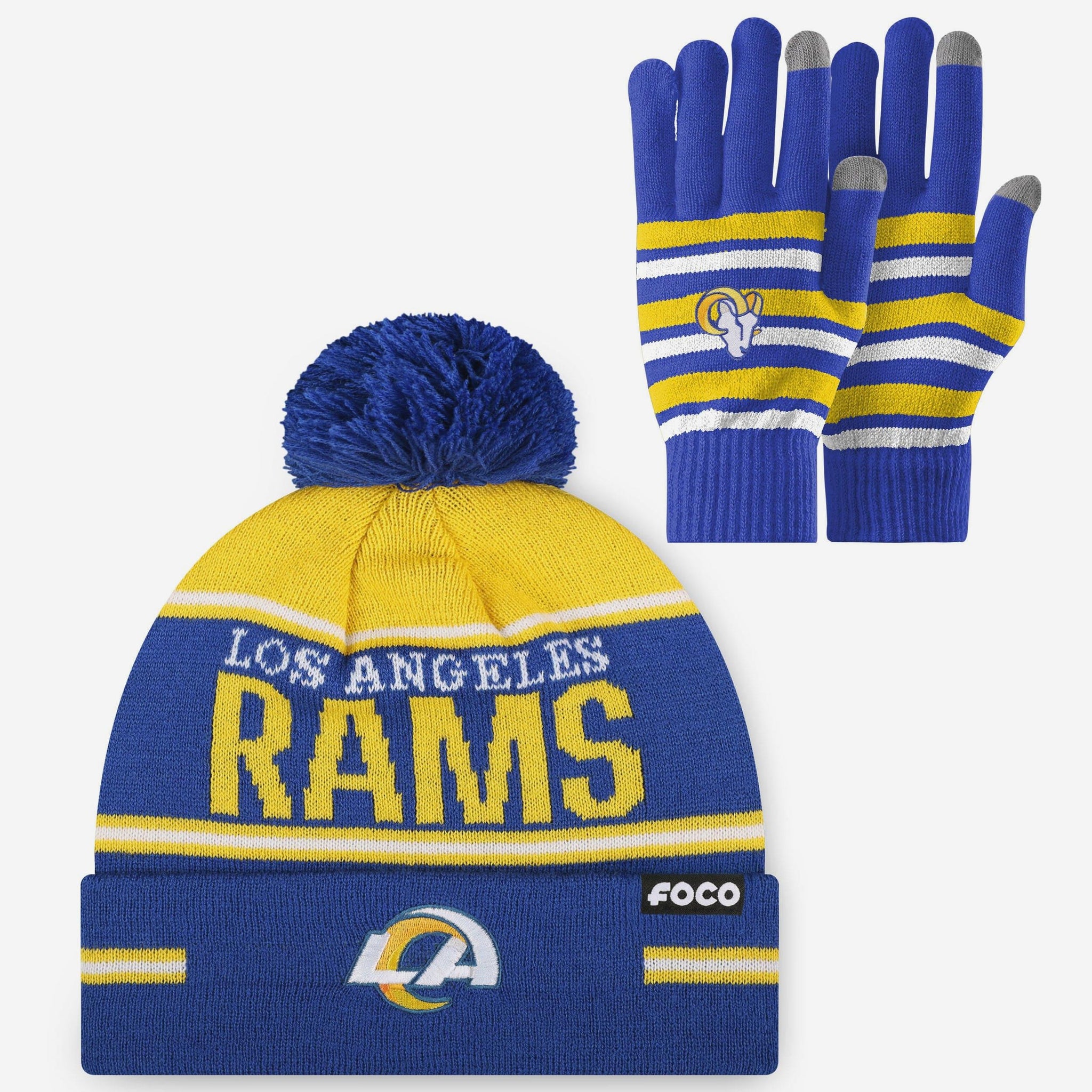 Los Angeles Rams Stretch Glove & Big Wordmark Stripe Pom Beanie Set FOCO - FOCO.com