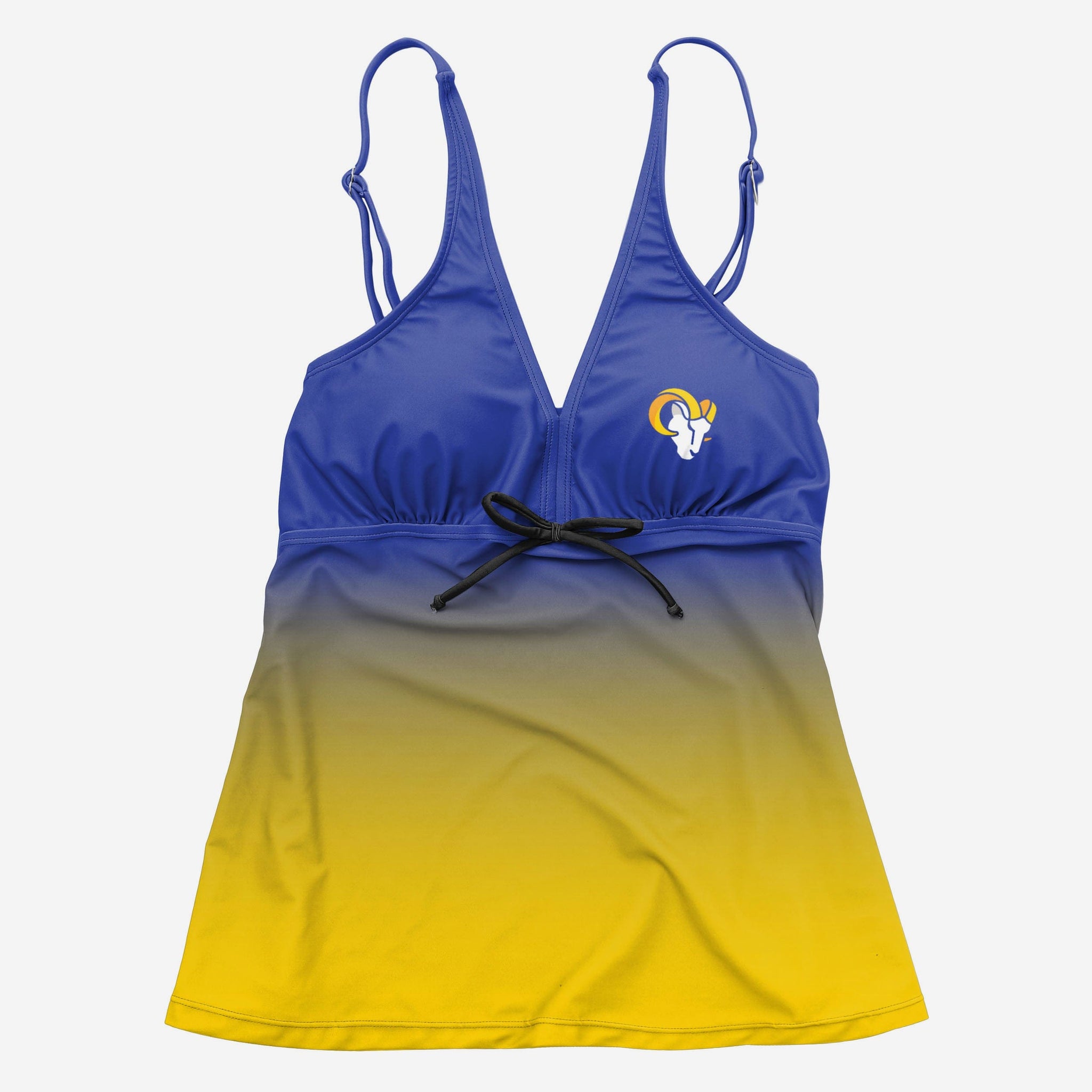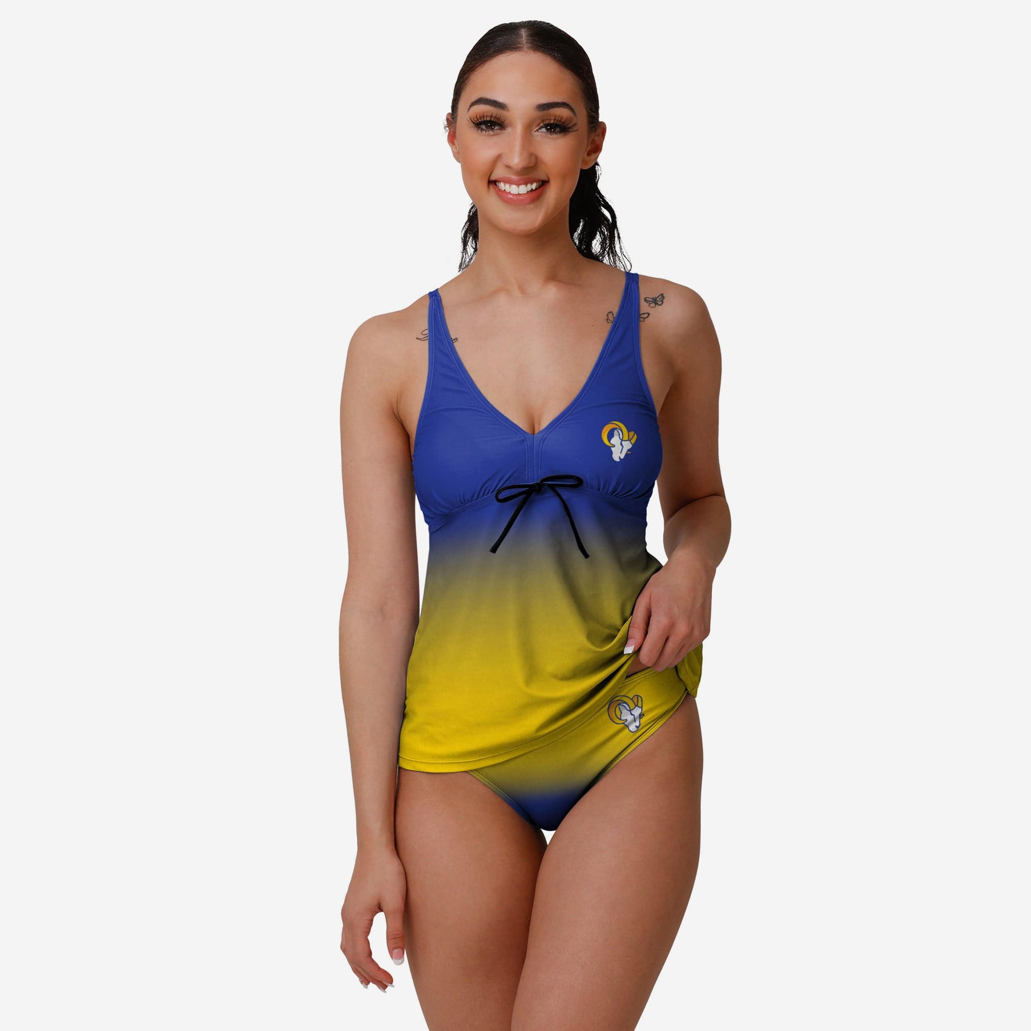Along with sunscreen, don't forget to apply some team pride this summer by enjoying some fun in the sun with this Los Angeles Rams Women's Gametime Gradient Tankini!