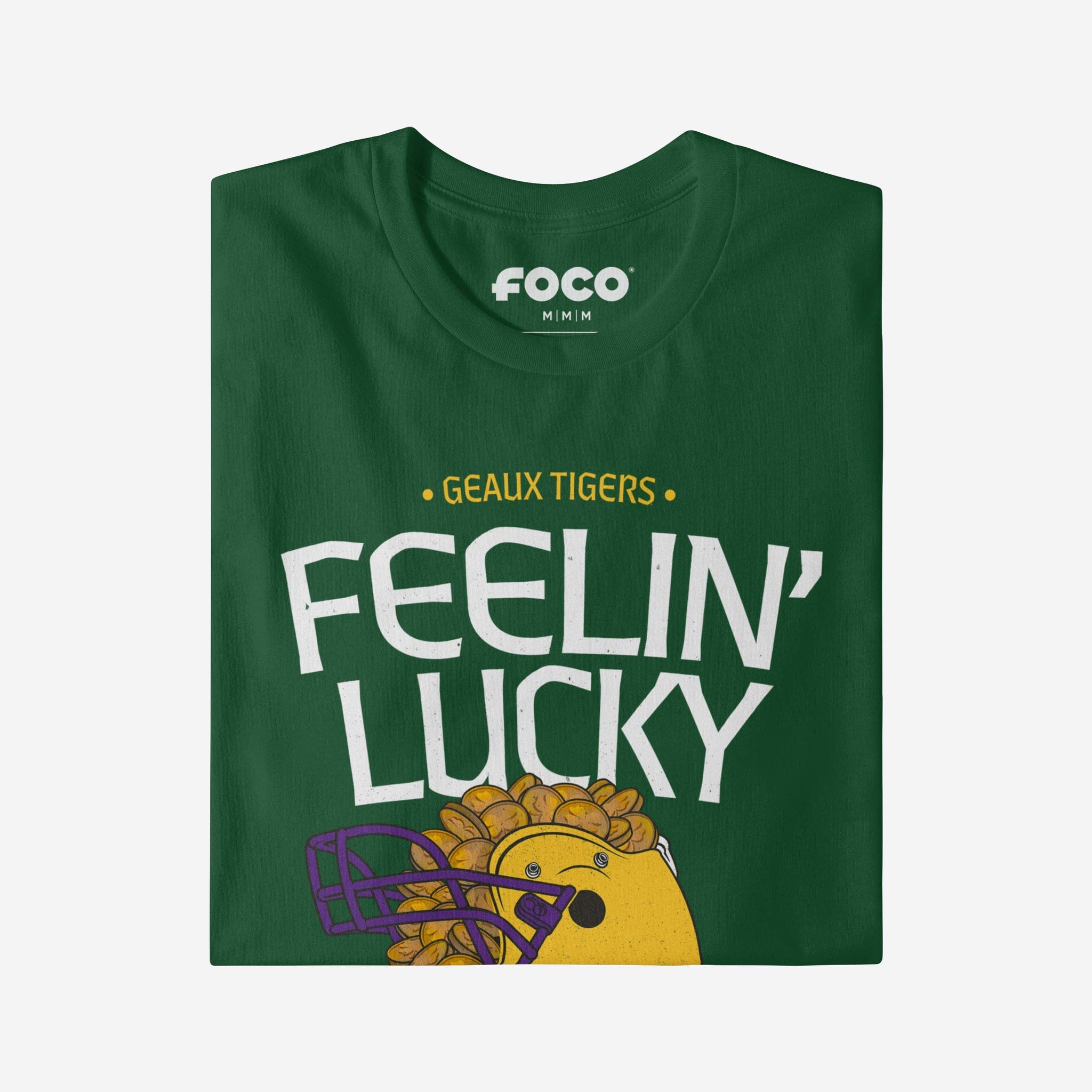 This top features a green and white design that showcases a team logo display, year of team establishment, a team wordmark display, a “FEELIN’ LUCKY” text display, and a football helmet filled with thematic four leaf clover coins on the front, meaning this t-shirt will prove your unmatched dedication to the LSU Tigers when you’re at the game, front row at the parade, or watching at home with your friends. No matter where you go, you’ll always have a little luck on your side.