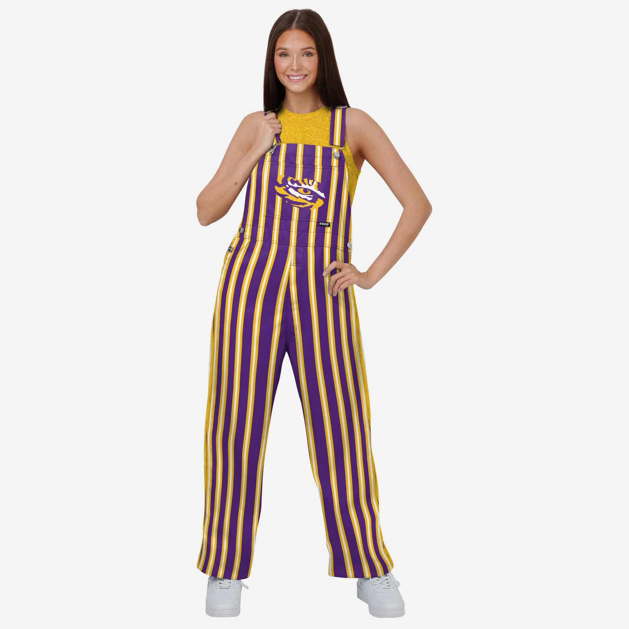 Show your team spirit in these stylish and comfortable LSU Tigers Womens Sideline Spirit Overalls. With their all-over team-colored design and bold team logo displays, these Overalls are the perfect way to show your support for the LSU Tigers while showing off some striped style that will have you ready for everything from campus strolls to sideline cheers.