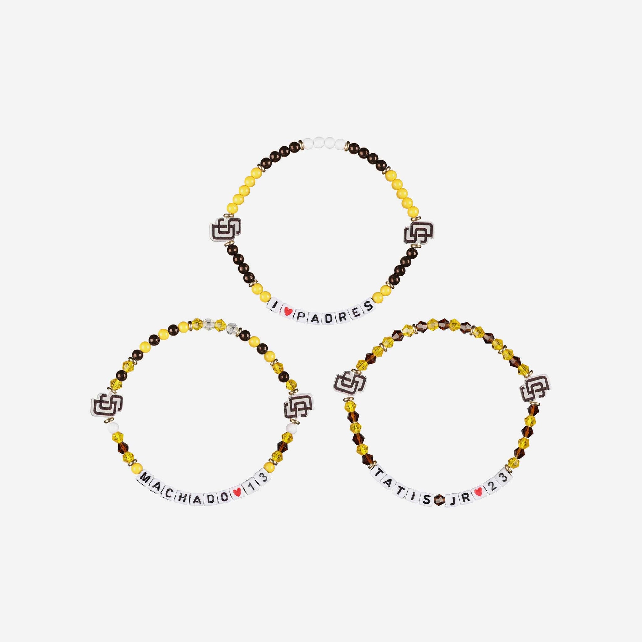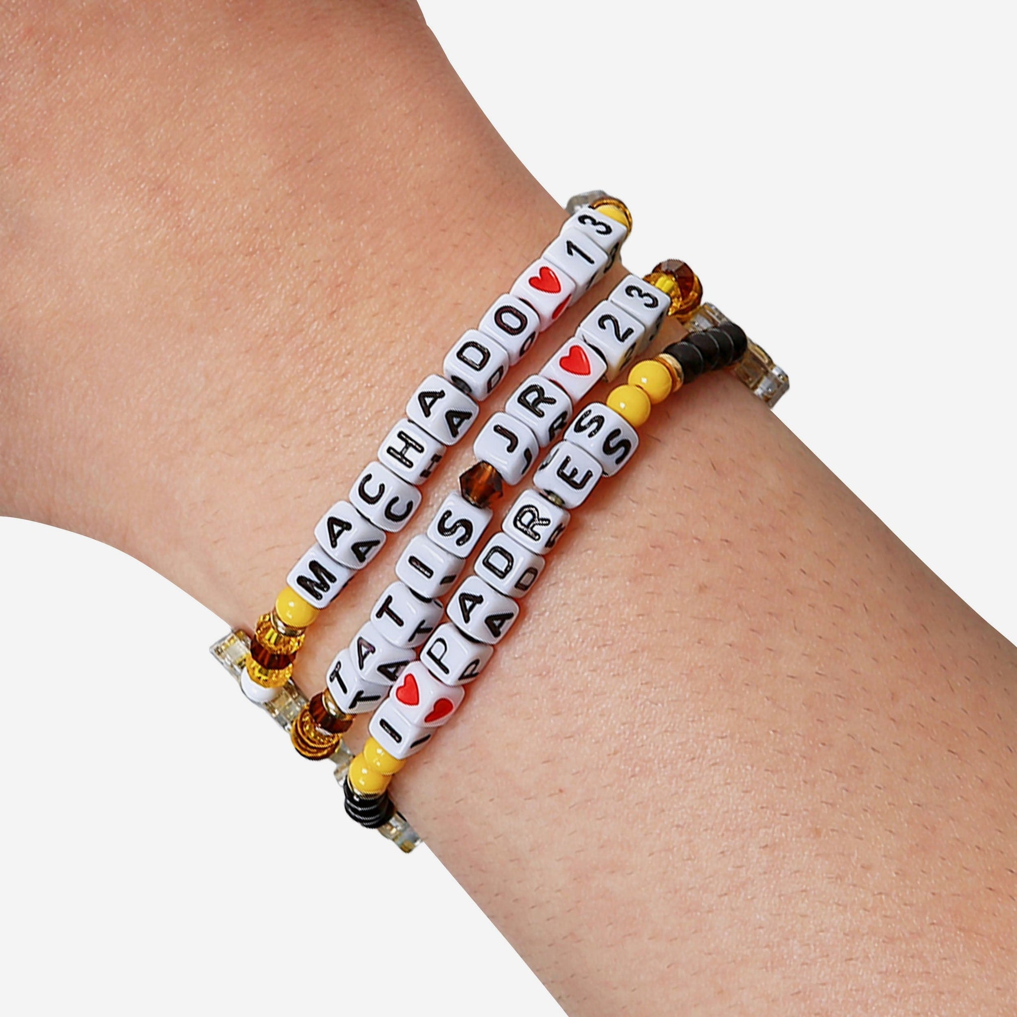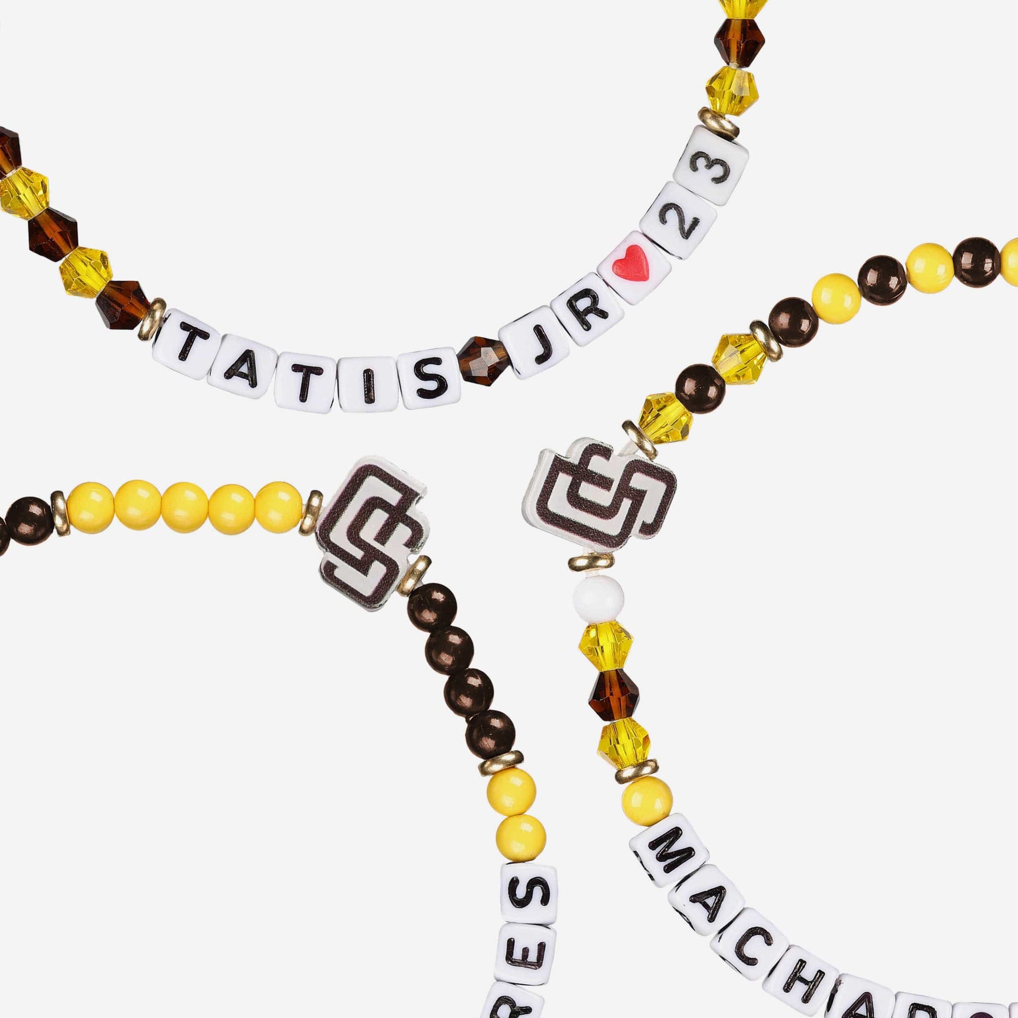 - Thematic words displayed: Letter cubes are organized on a friendship bracelet string to display team-specific words, messages, and player names that will make sure these Manny Machado & Fernando Tatis Jr. player friendship bracelets always have your team spirit front and center.