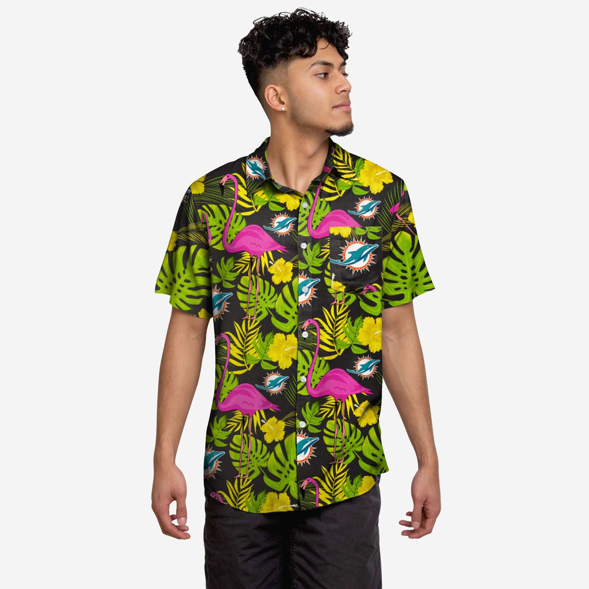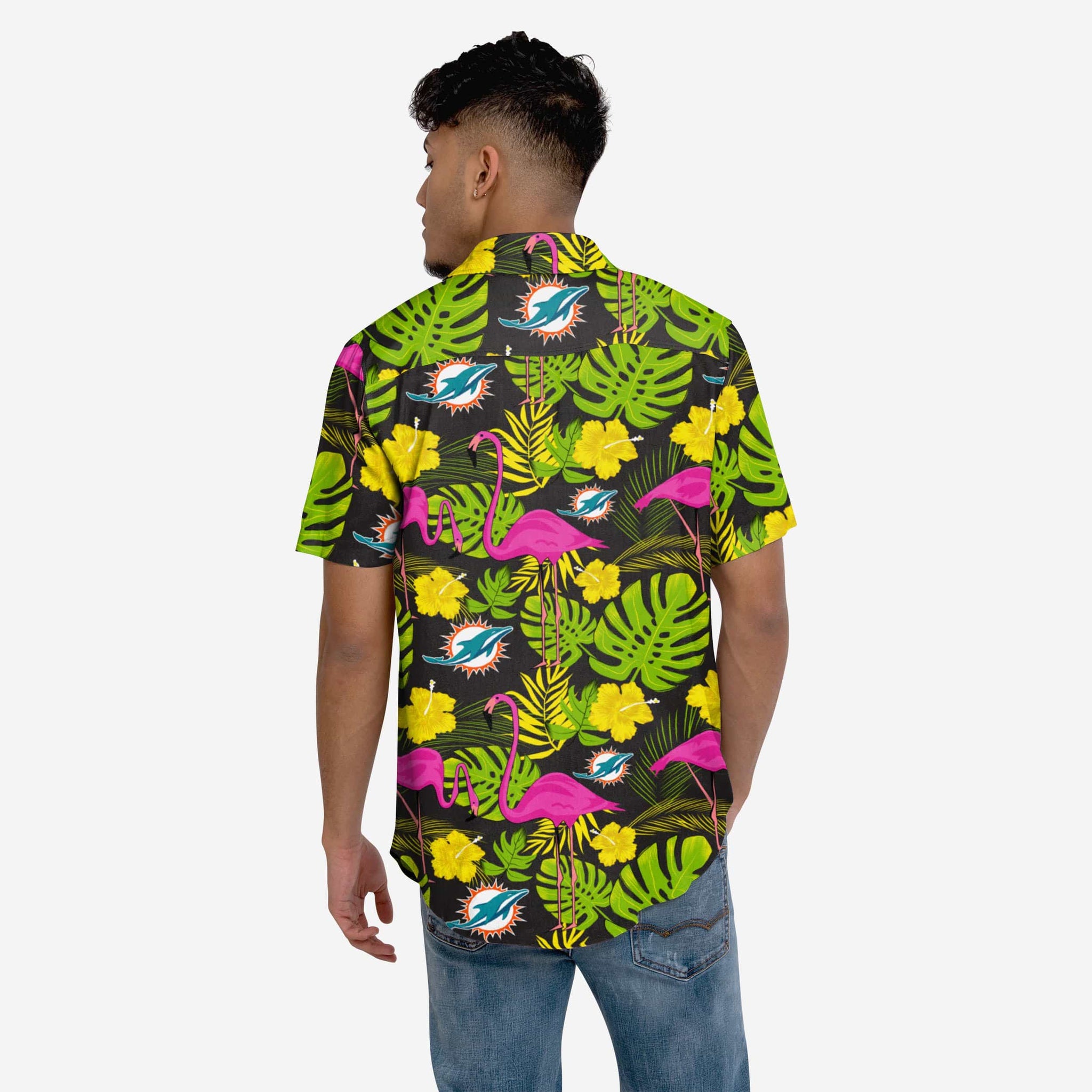 • All-over team-colored design with neon yellow flower and pink flamingo accents for maximum tropical team spirit