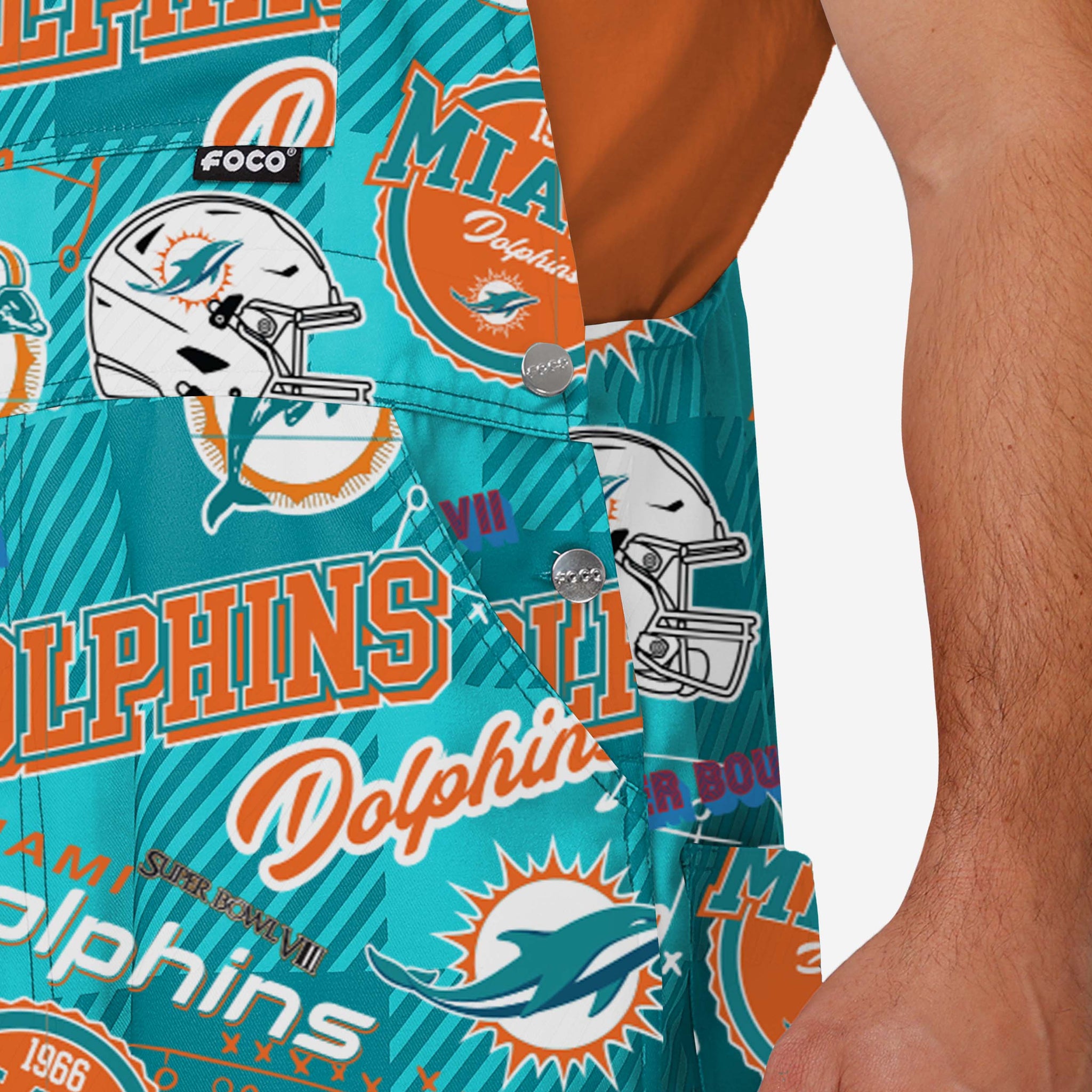 Show your team spirit in these stylish and comfortable Miami Dolphins Men's Historic Print Bib Overalls. With their all-over team-colored design and bold team logo displays, these Overalls are the perfect way to show your support for the Miami Dolphins while showing off your squad’s history, putting all that throwback glory on display.