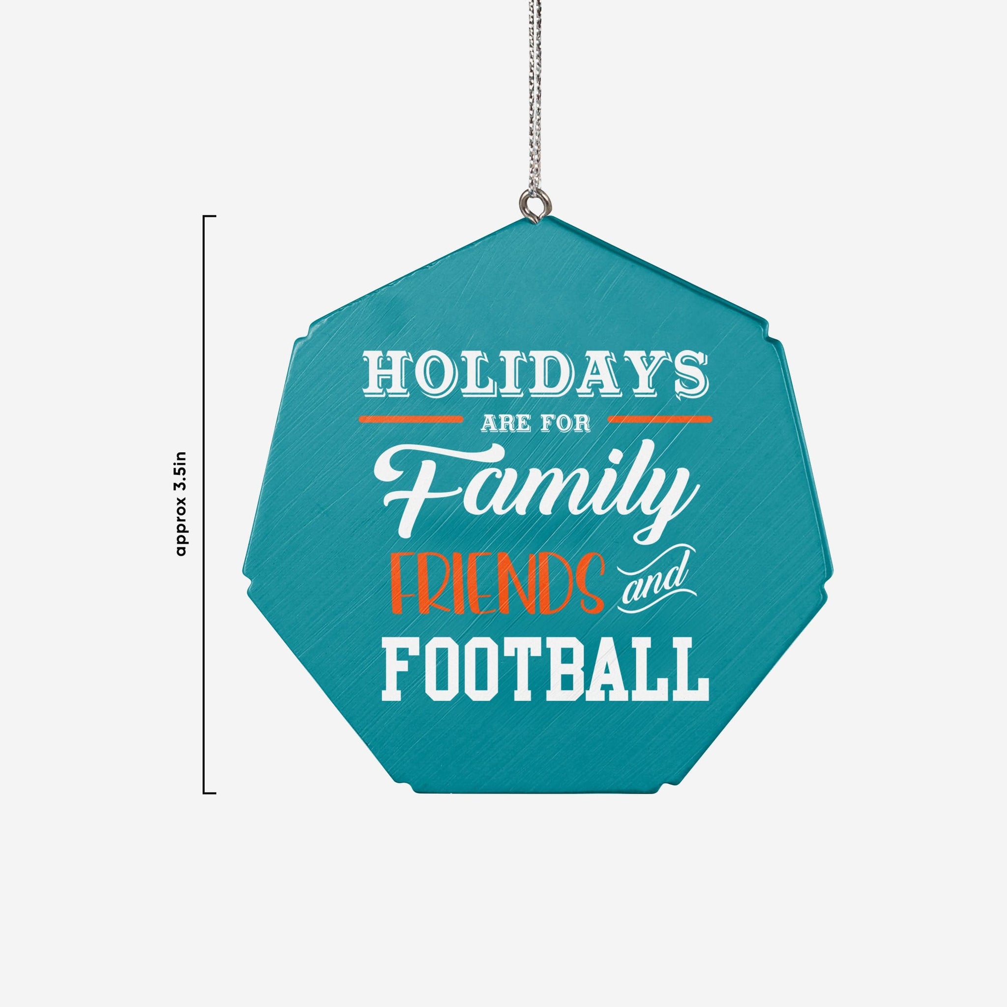 - ”HOLIDAYS ARE FOR FAMILY FRIENDS AND FOOTBALL” text display on reverse side of ornament