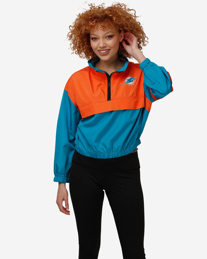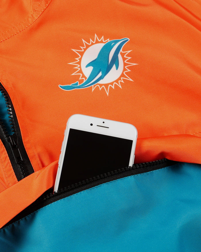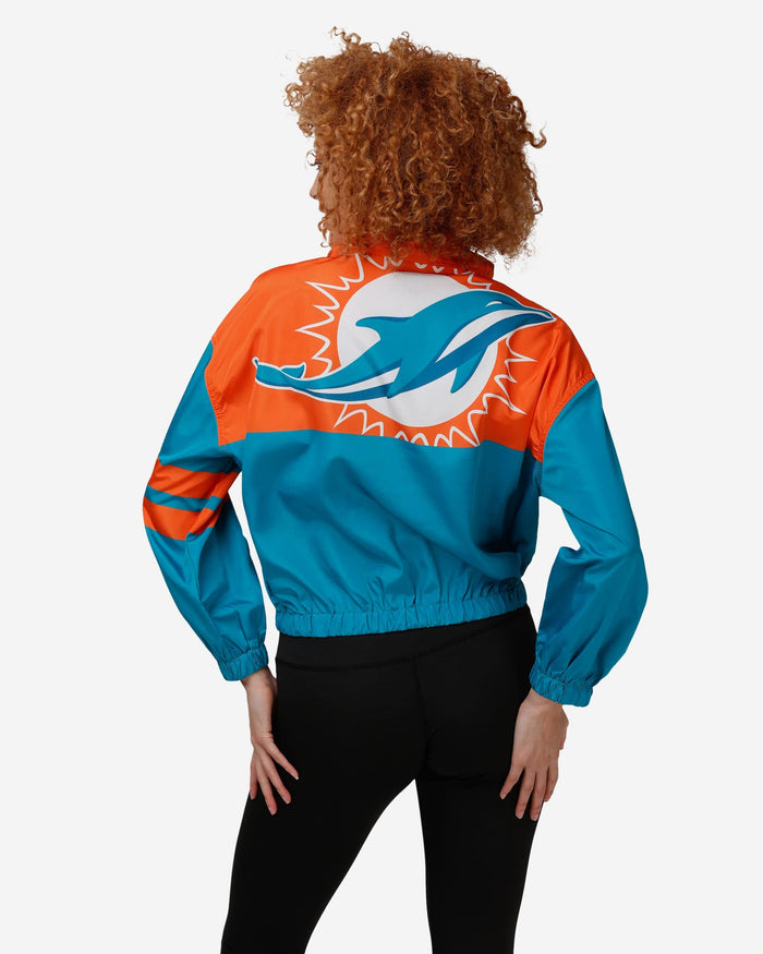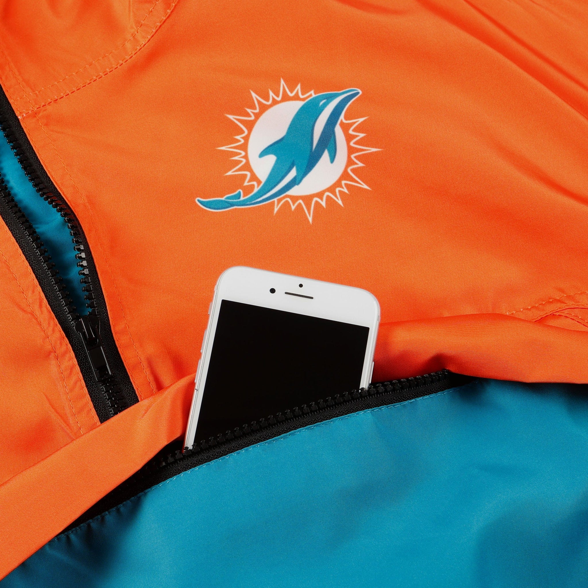This Miami Dolphins Women's Winning Play Windbreaker has a bold team logo on the back, so you can show off your team spirit to everyone you leave in the dust while you run the track.