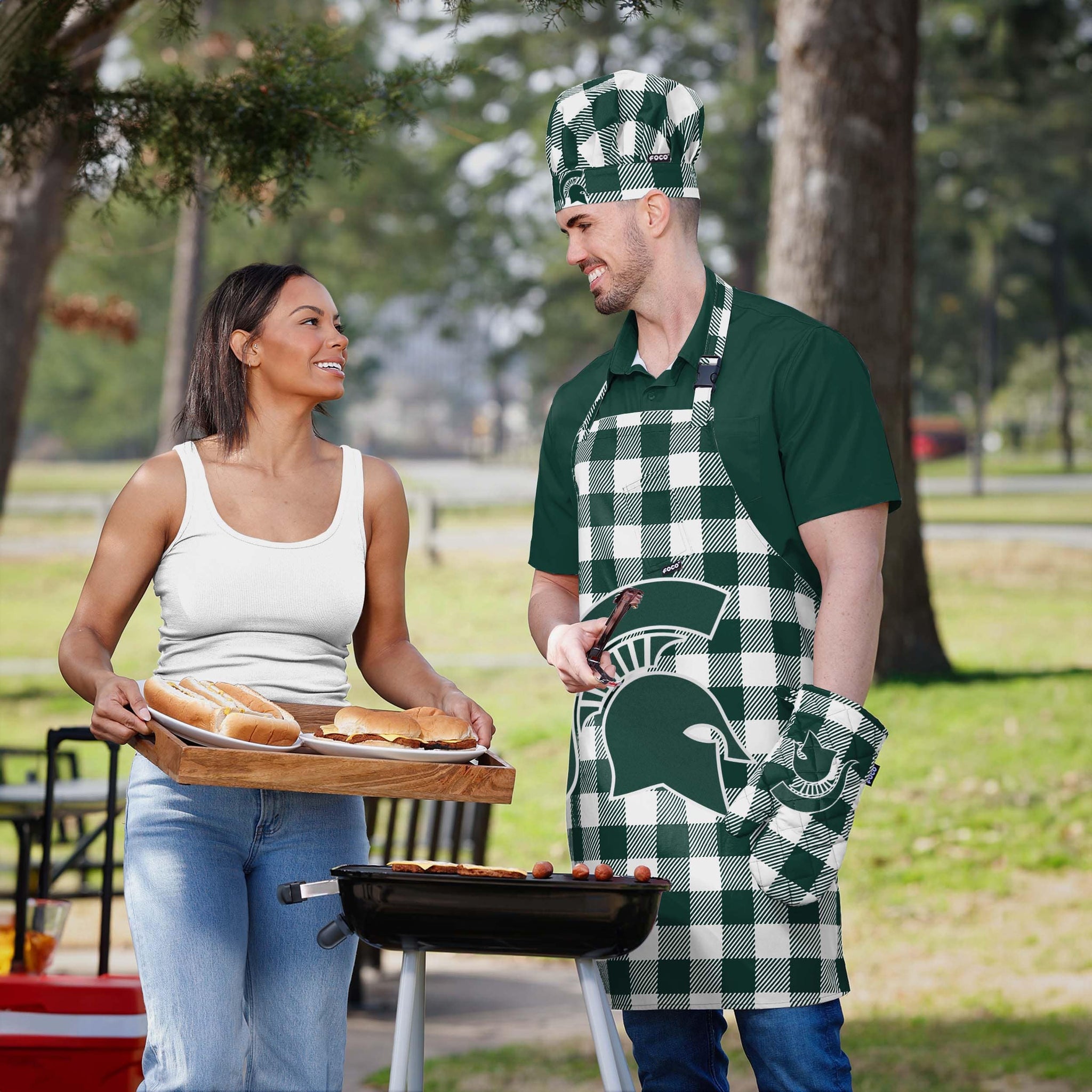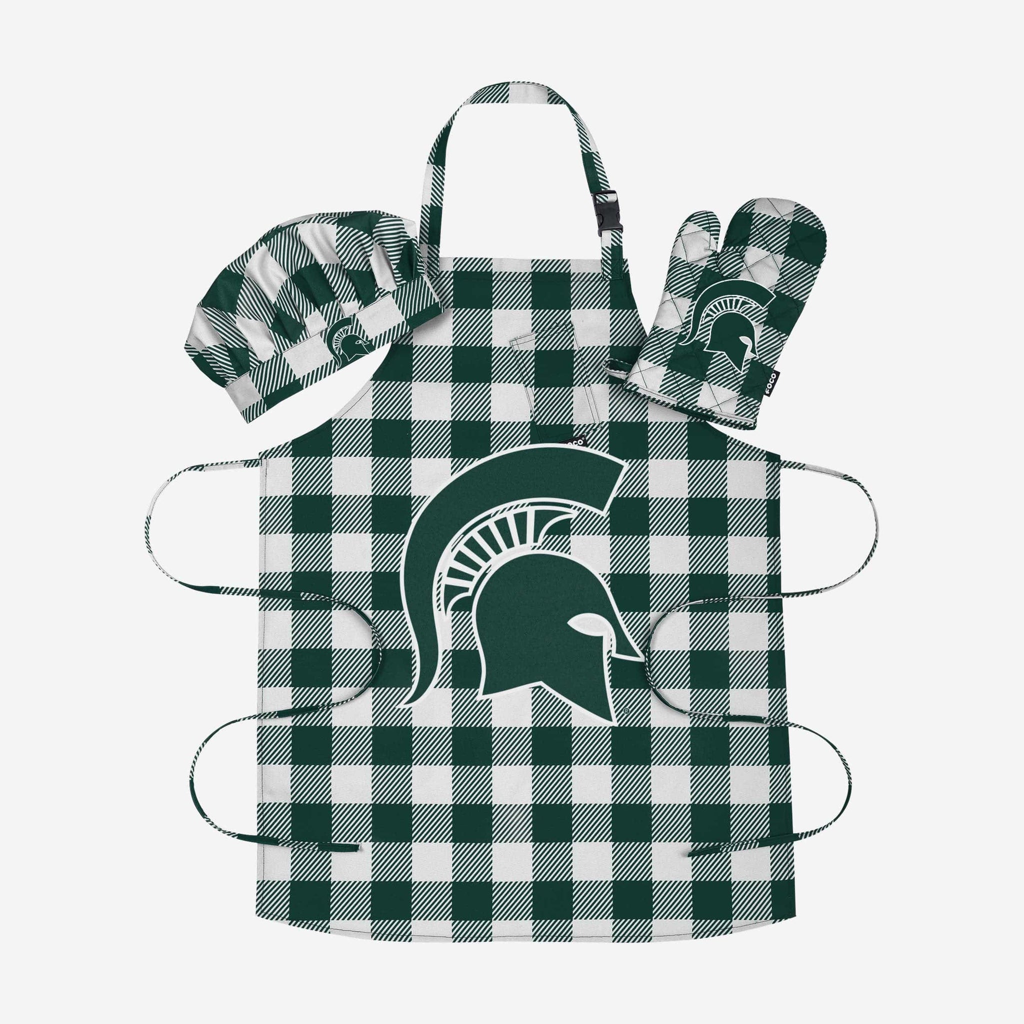 Get ready to serve up the best food in the greatest fan fit. From the kitchen, to the table, to game day, do it all in style with the Michigan Sate Spartans Plaid Chef Set.