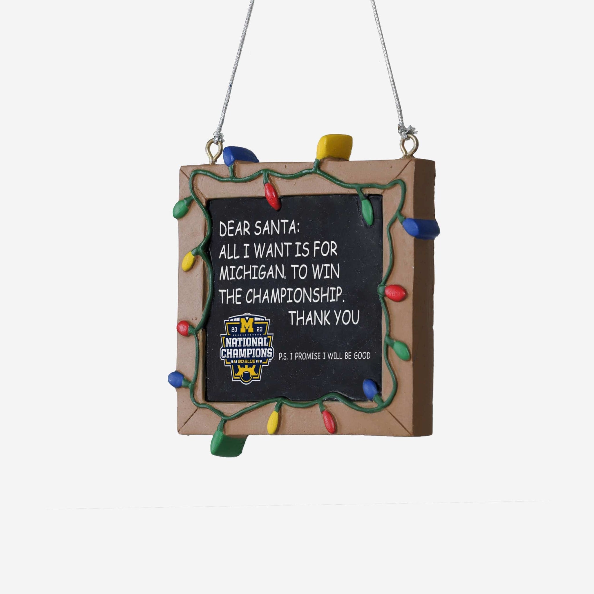 Let Fanta Claus know you've been a good fan this year and you want another championship under the tree next Christmas with this Michigan Wolverines 2023 Football National Champions Resin Chalkboard Sign Ornament.