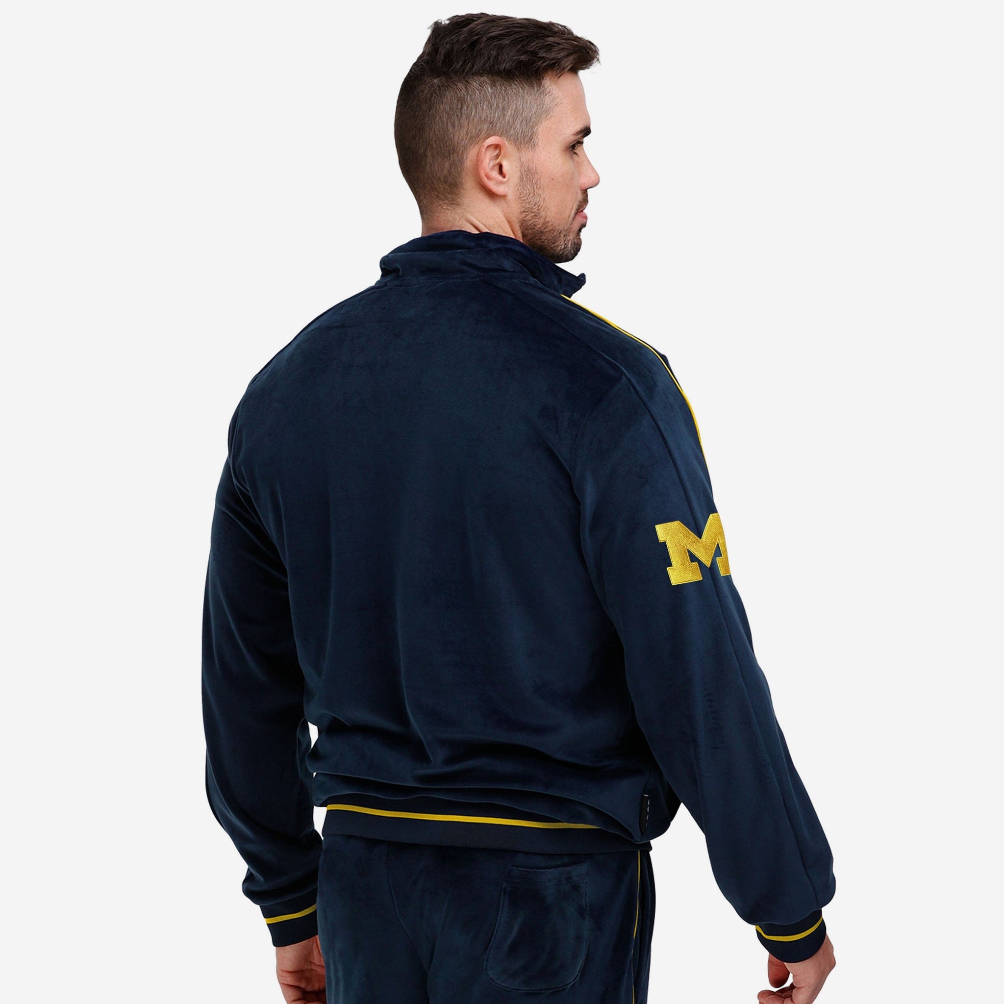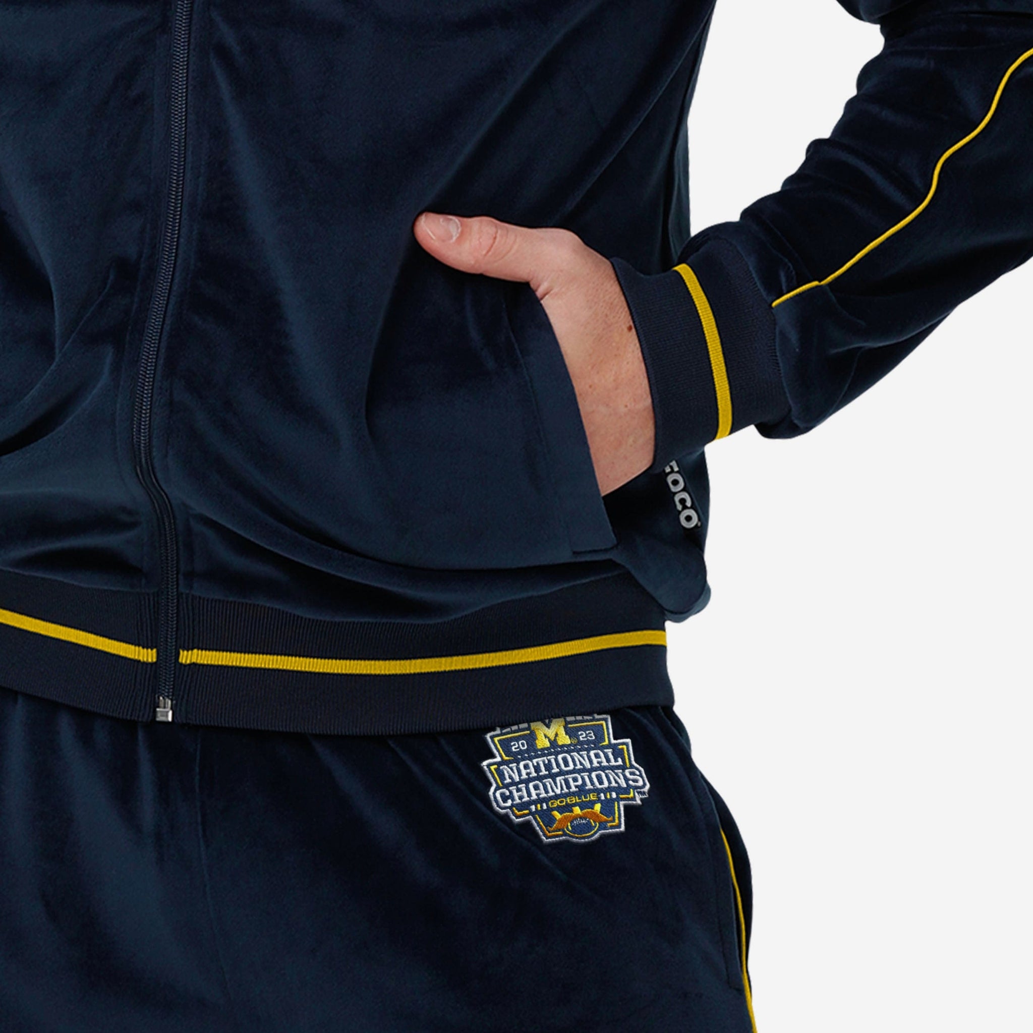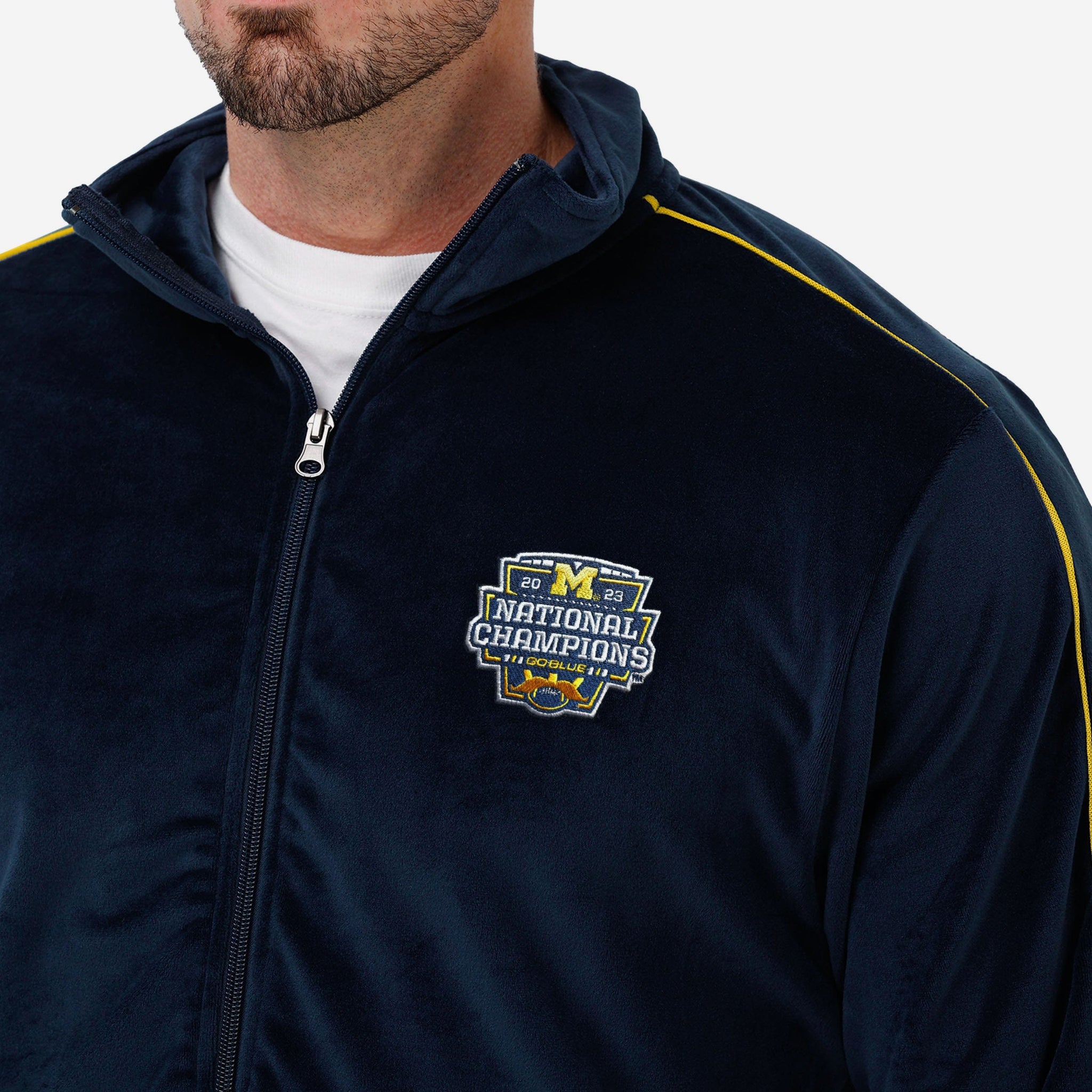 Here's a fashion tip for ya. With this Michigan Wolverines 2023 Football National Champions Blue Velour Zip Up Top on your shoulders, you'll be heating up the tailgate scene and staying warm and toasty during the game. Match it with the pairing pants for the full fit.