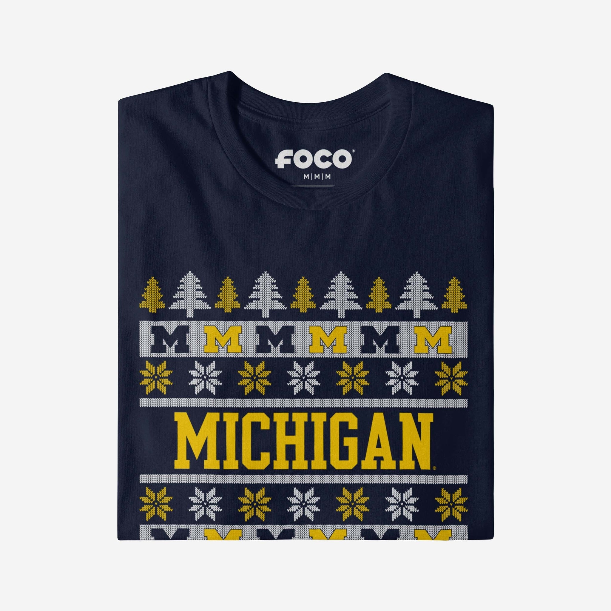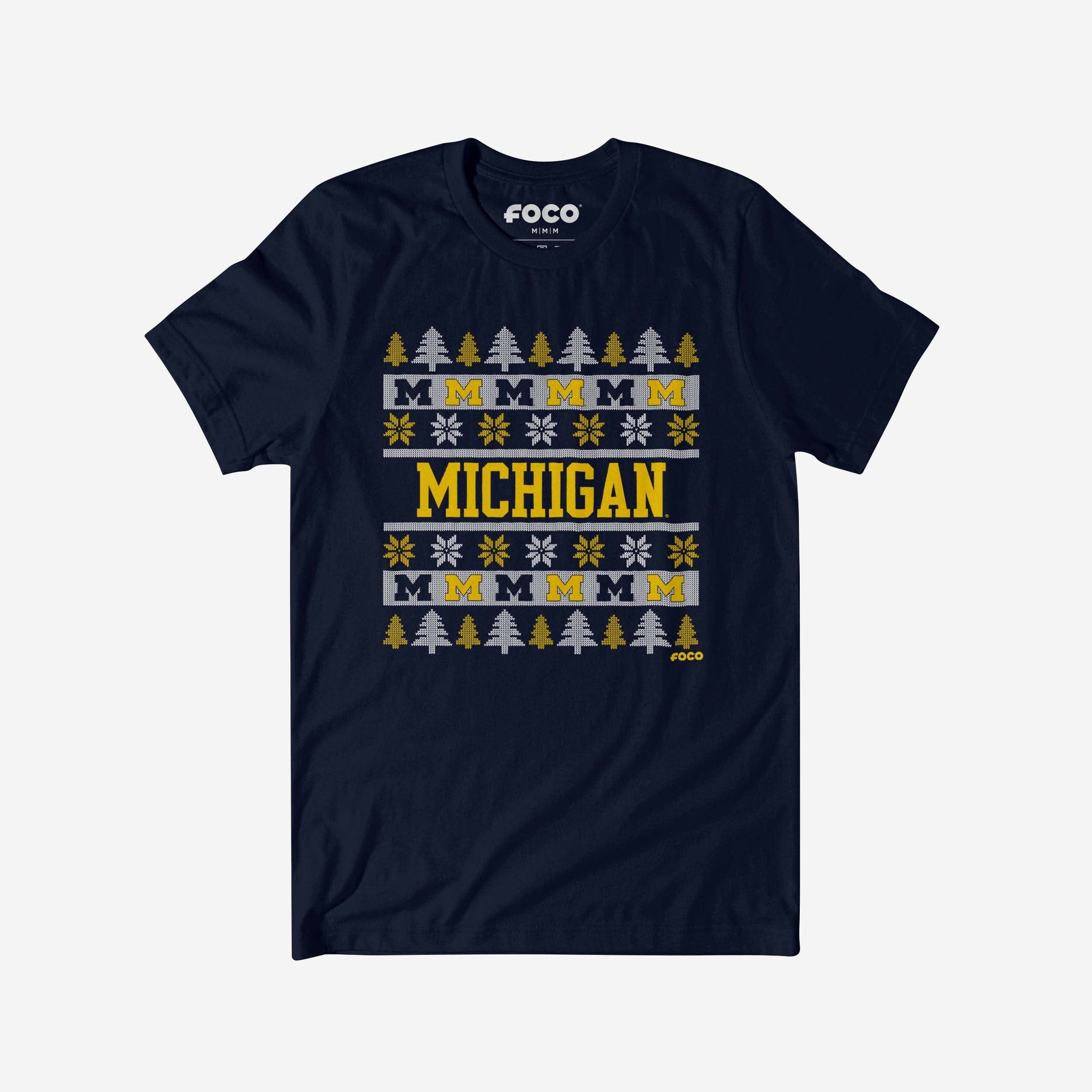 - Festive, team-colored design: This traditional t-shirt shows off the official Michigan Wolverines colors in an all-over team-colored design with winter tree and snowflake accents, so you can show your team spirit with pride.