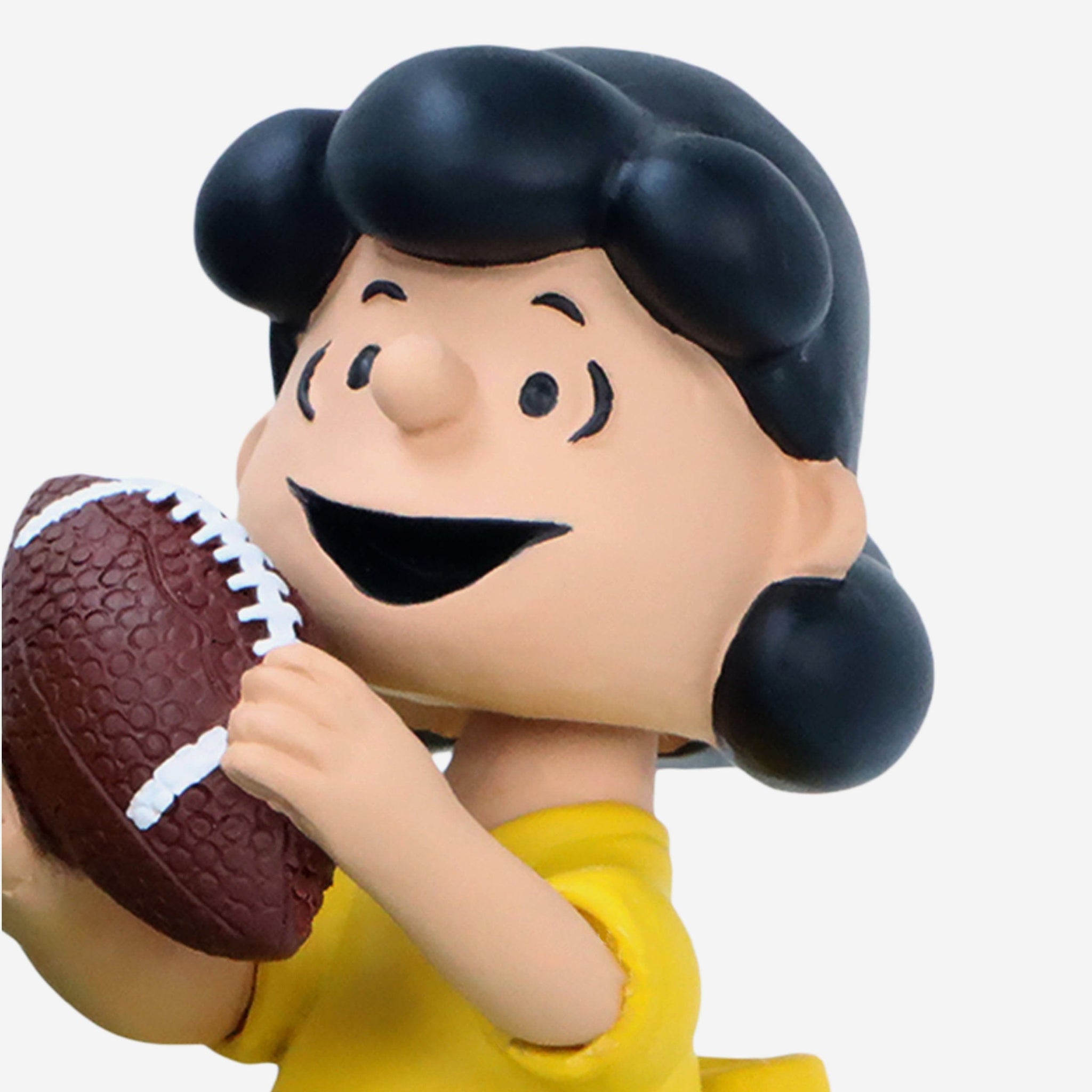- Portrays Charlie Brown and Lucy wearing team-colored outfits, with Woodstock looking on, as they hit the gridiron