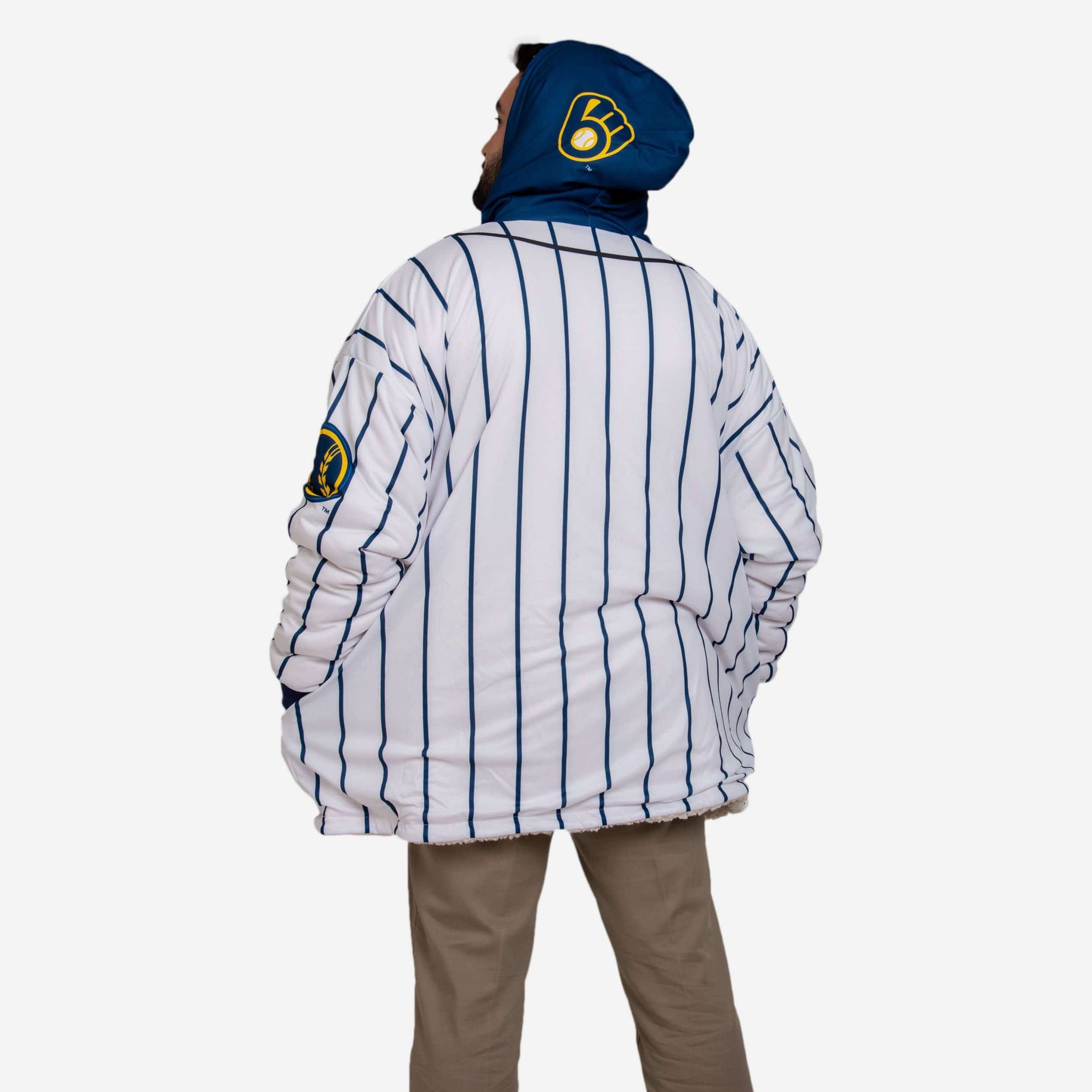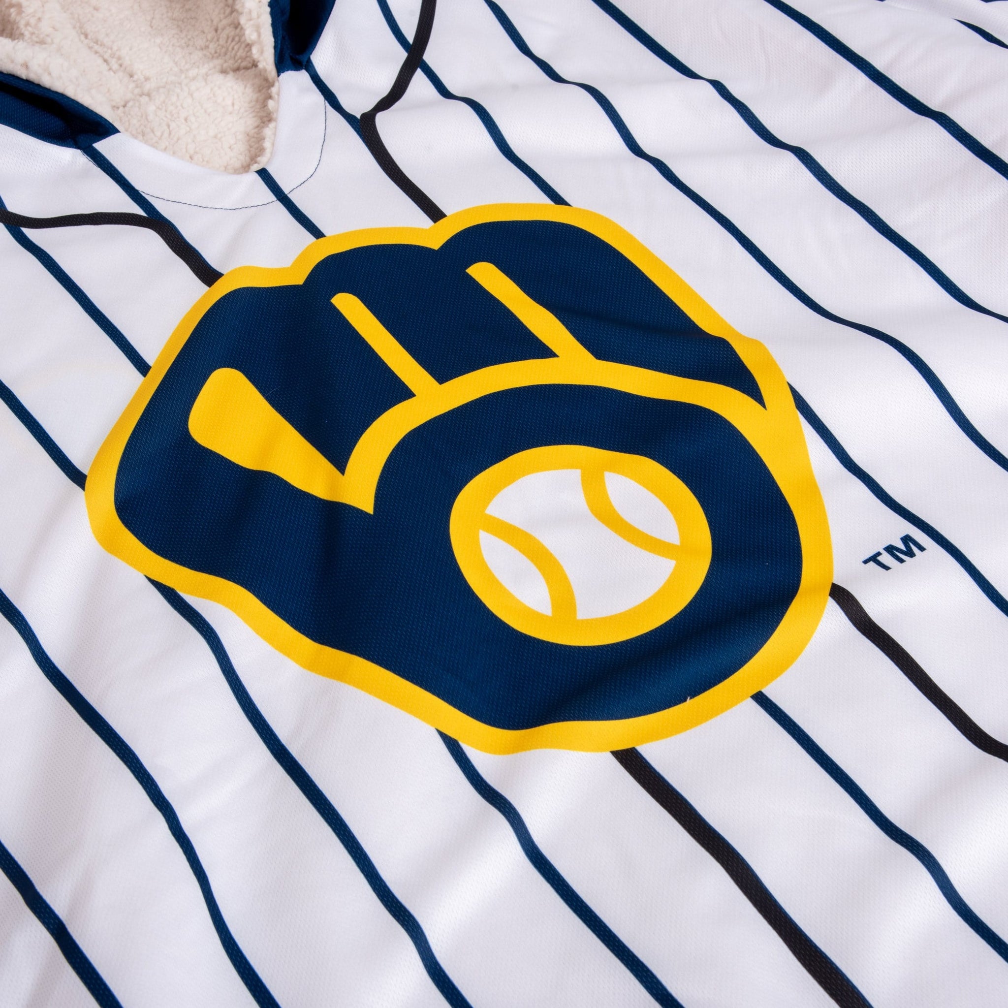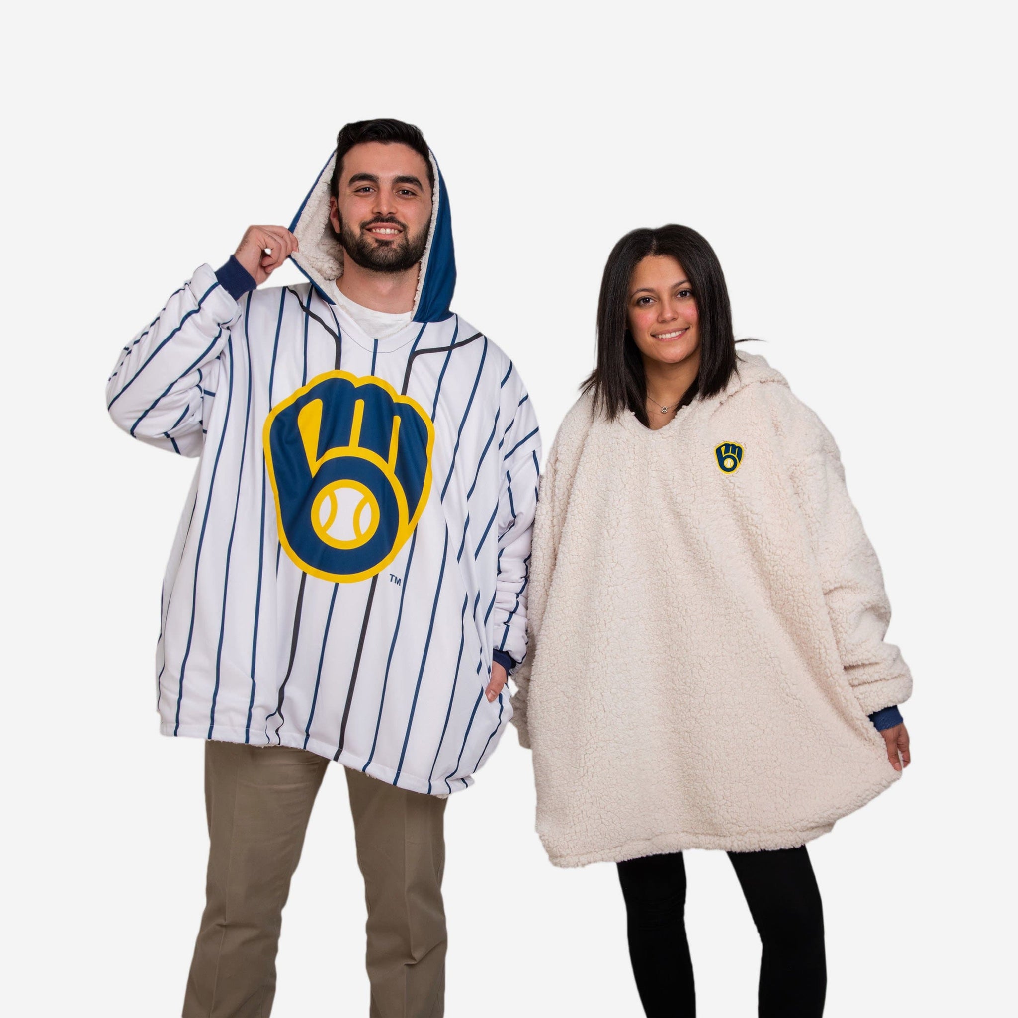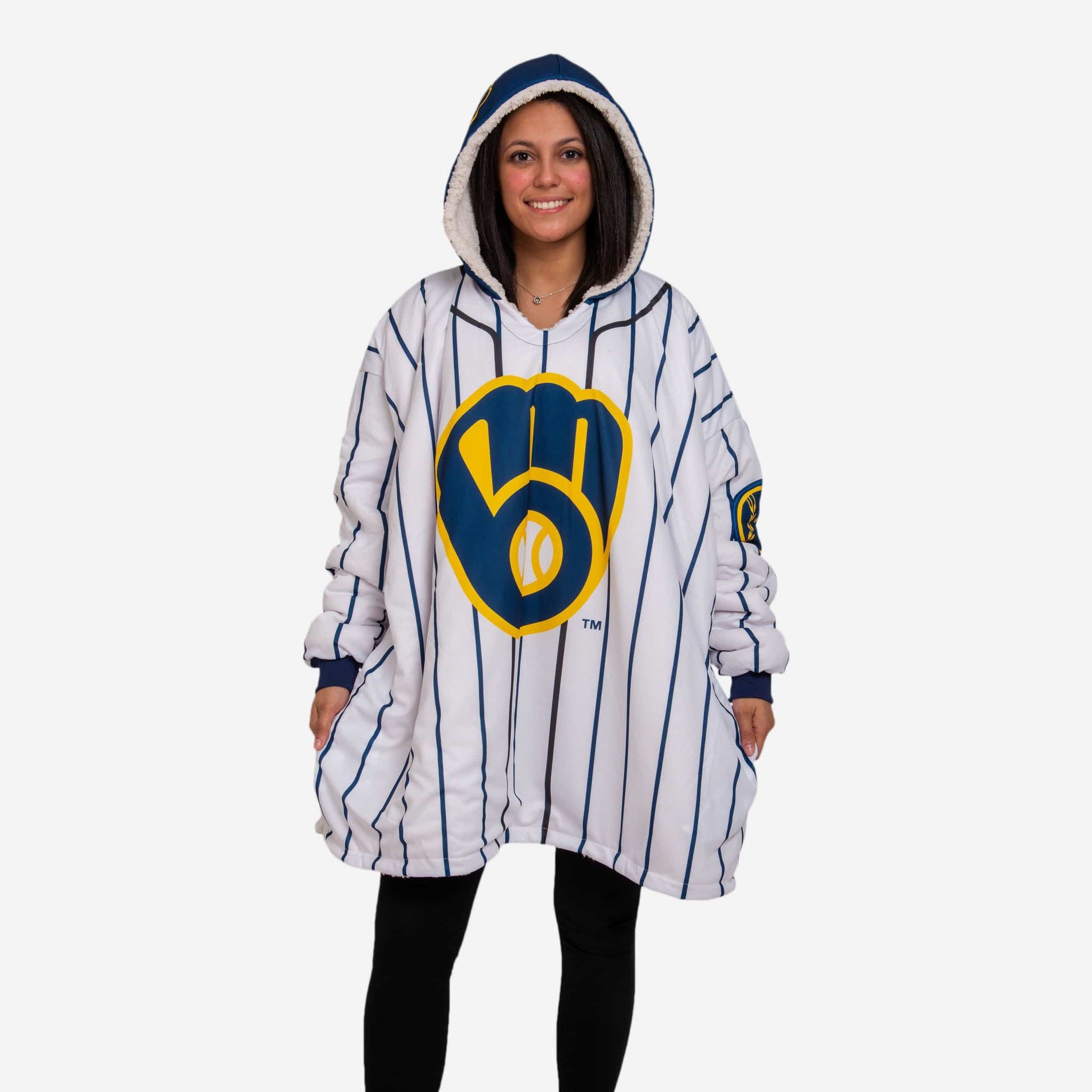 Dress like the star of the game without leaving your couch. Introducing the Milwaukee Brewers Alternate Home Jersey Reversible Gameday Hoodeez.