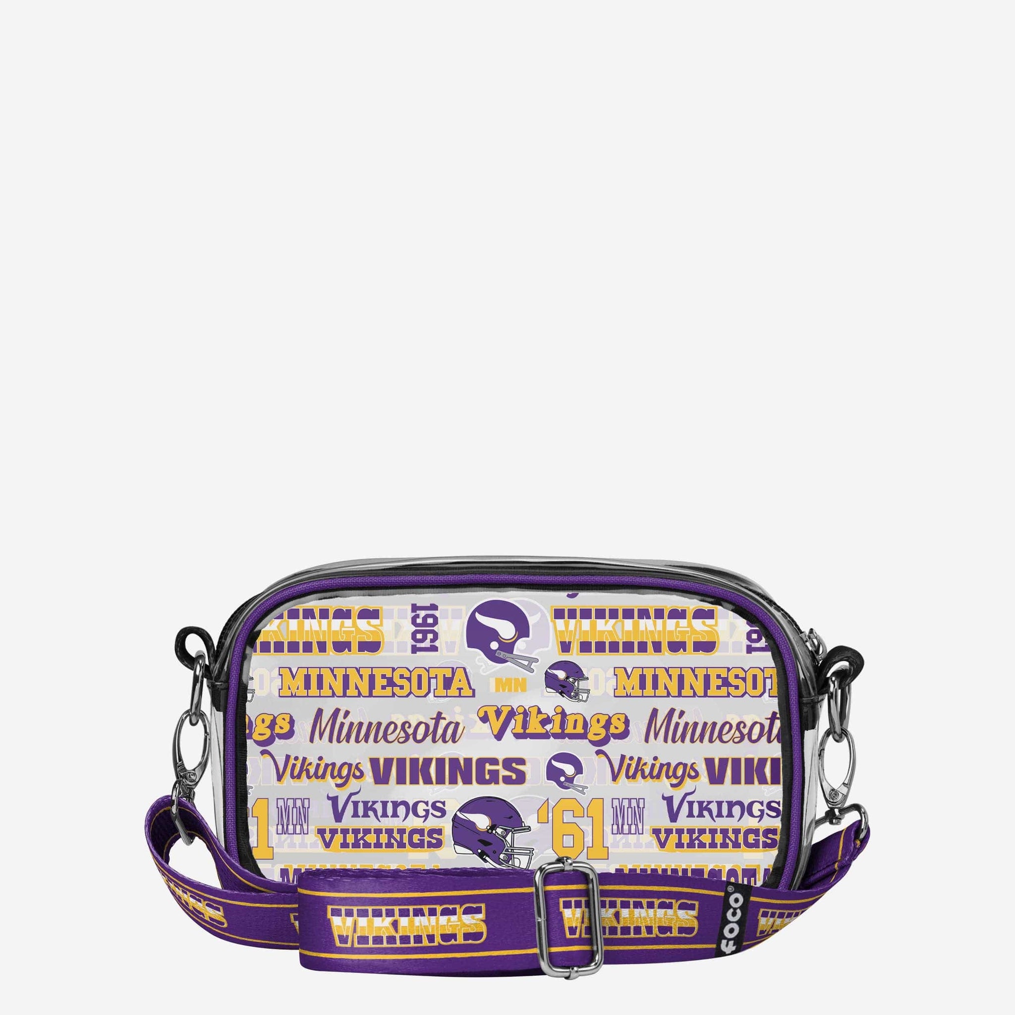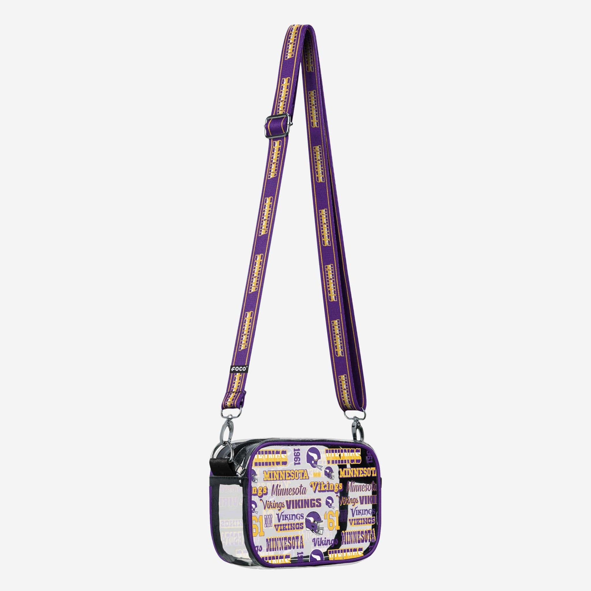 Over your shoulder and off to the game. Whether you're running errands on the town or running the tailgate in the parking lot, this Minnesota Vikings Repeat Retro Print Clear Crossbody Bag is the perfect way to carry the team like never before.