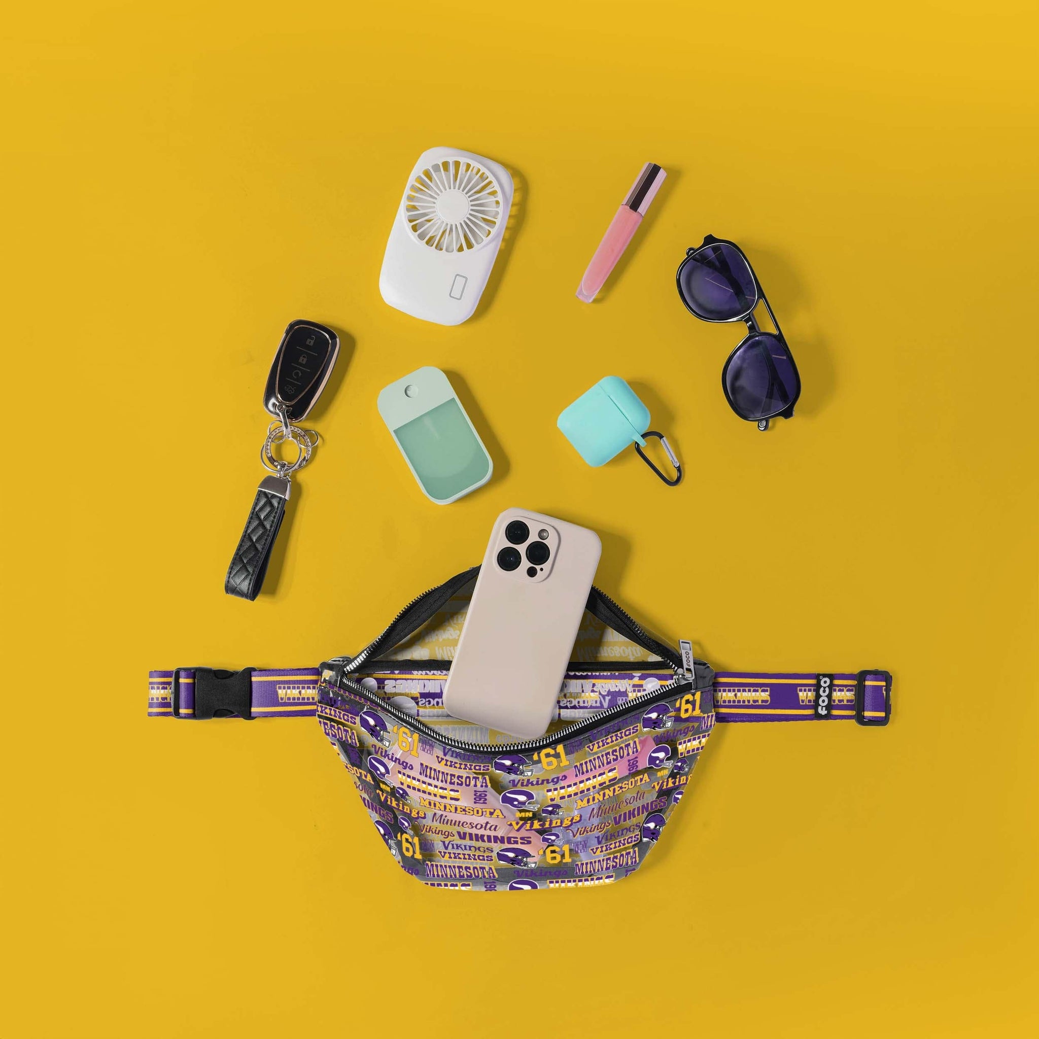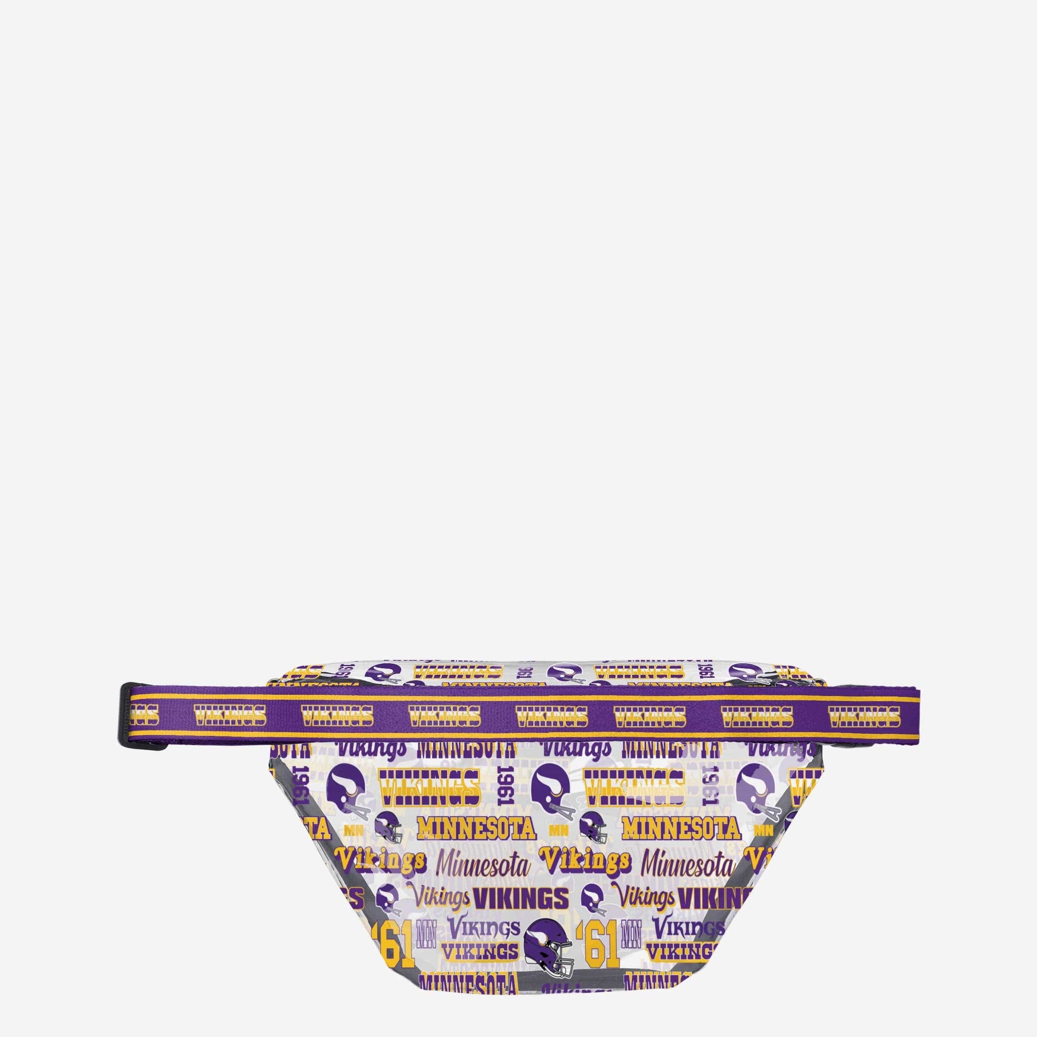 - Repeat Minnesota Vikings current and retro team logo and wordmark displays on the fanny pack, in case there were any doubts where your allegiances lie