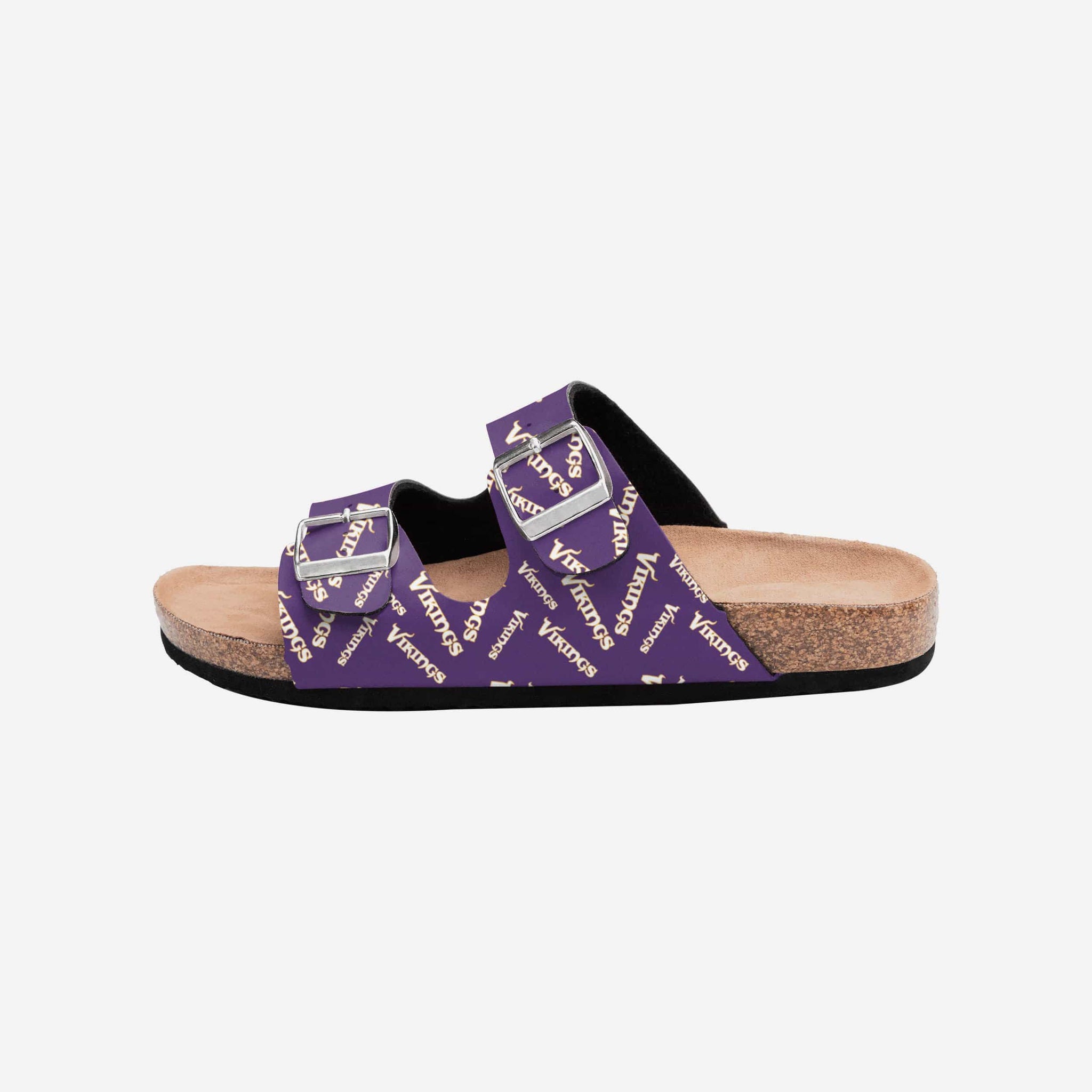 Double your fun. Double your fan. With the Minnesota Vikings Women's Mini Print Double Buckle Sandals, you can step in style, and not have to worry about getting sand in your shoes during your next beach excursion.