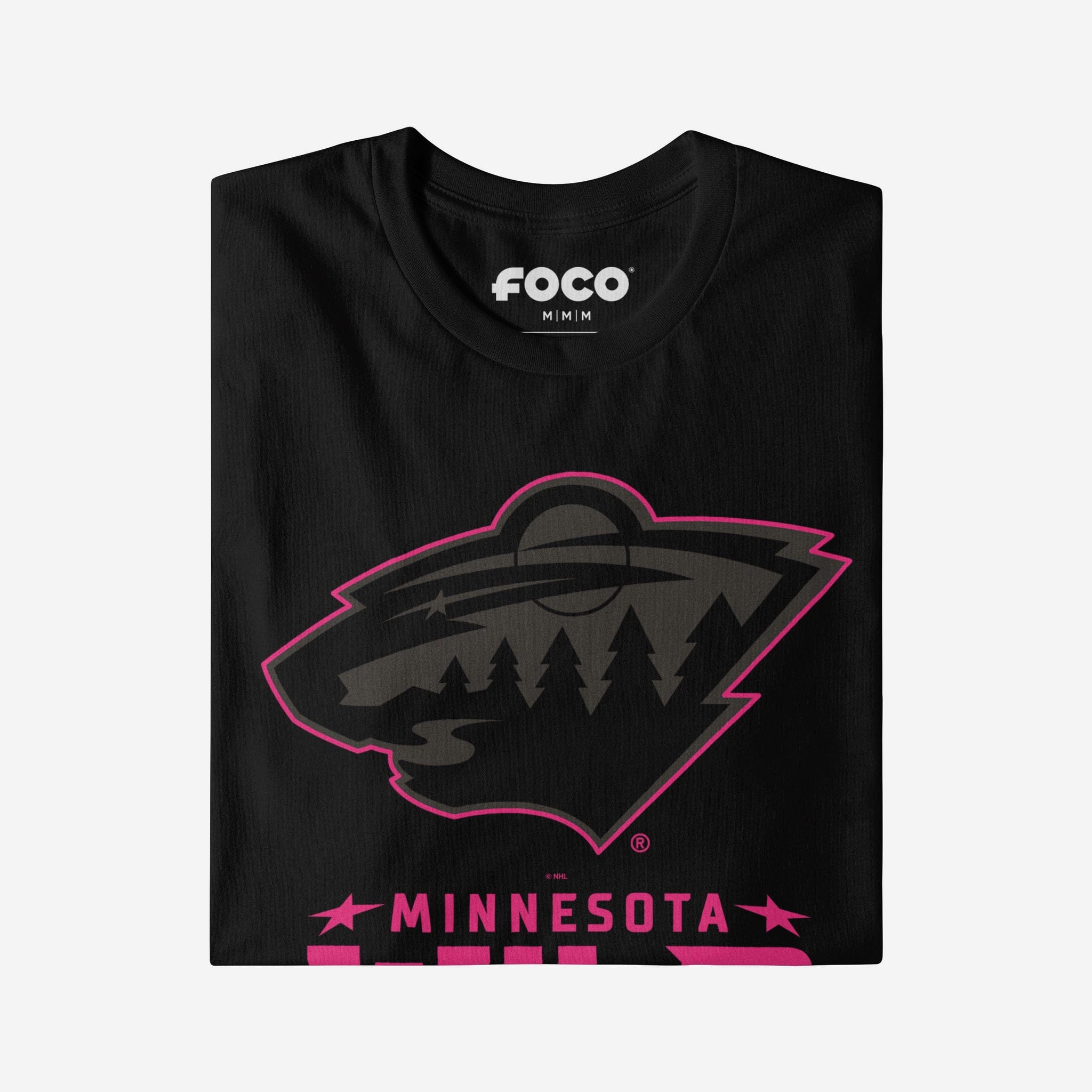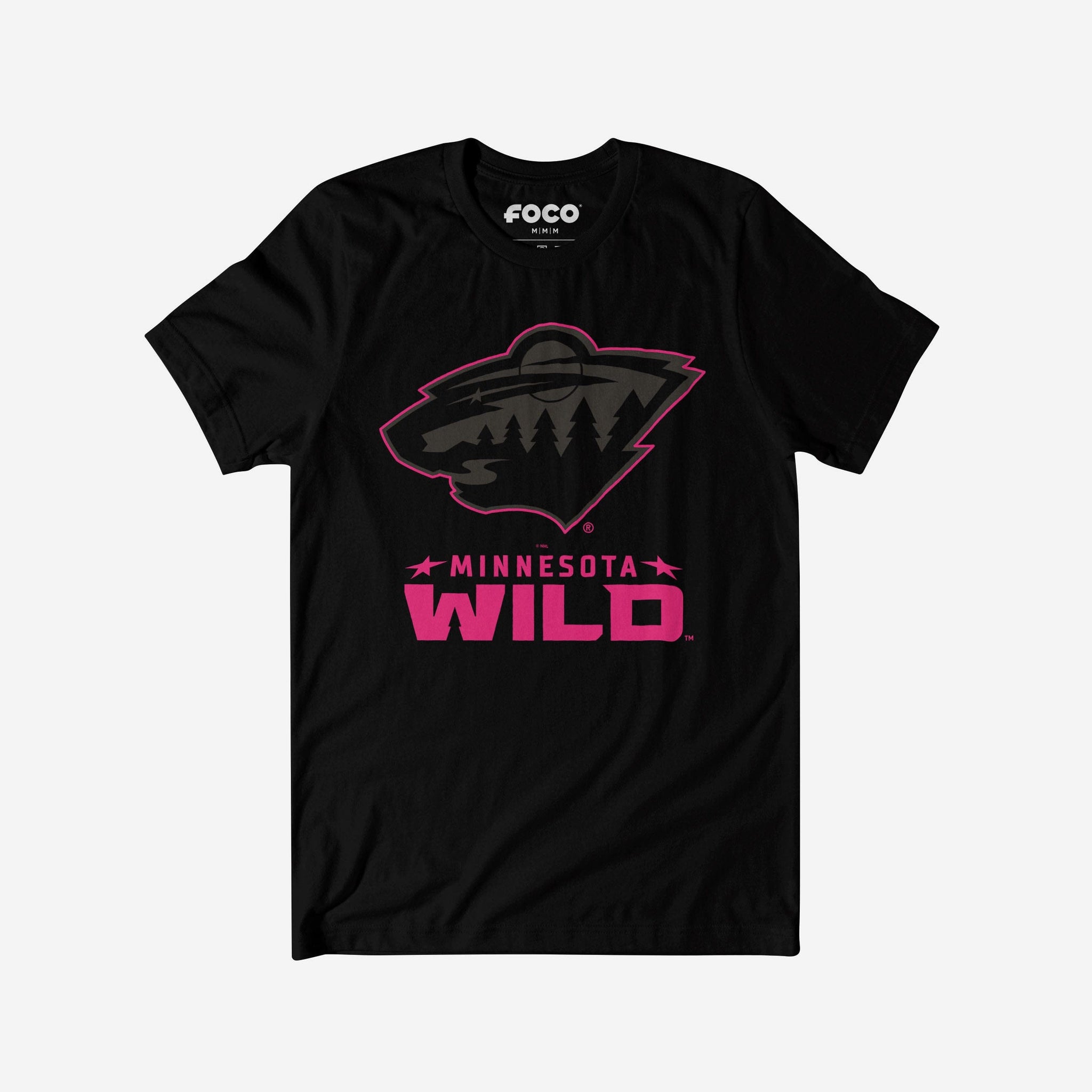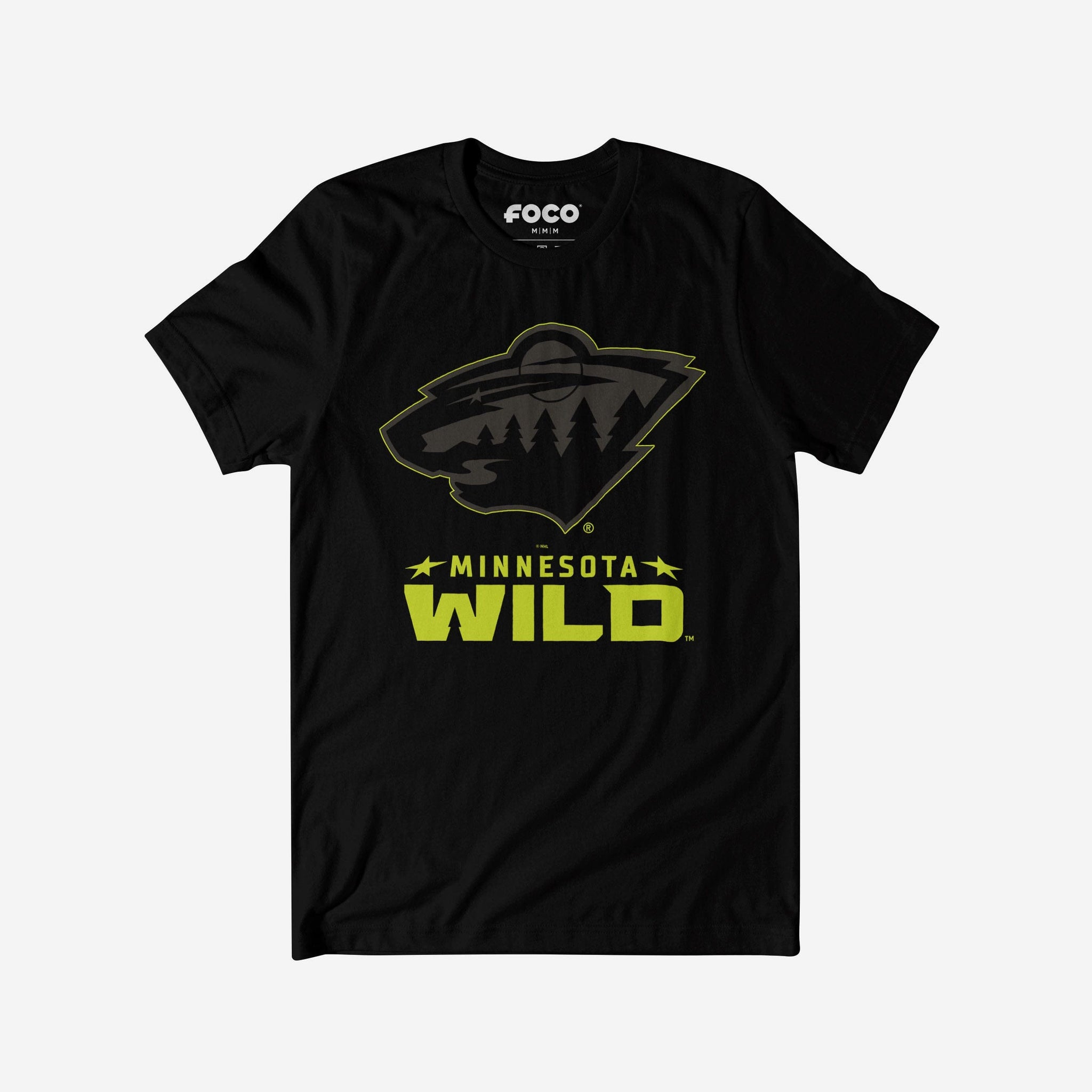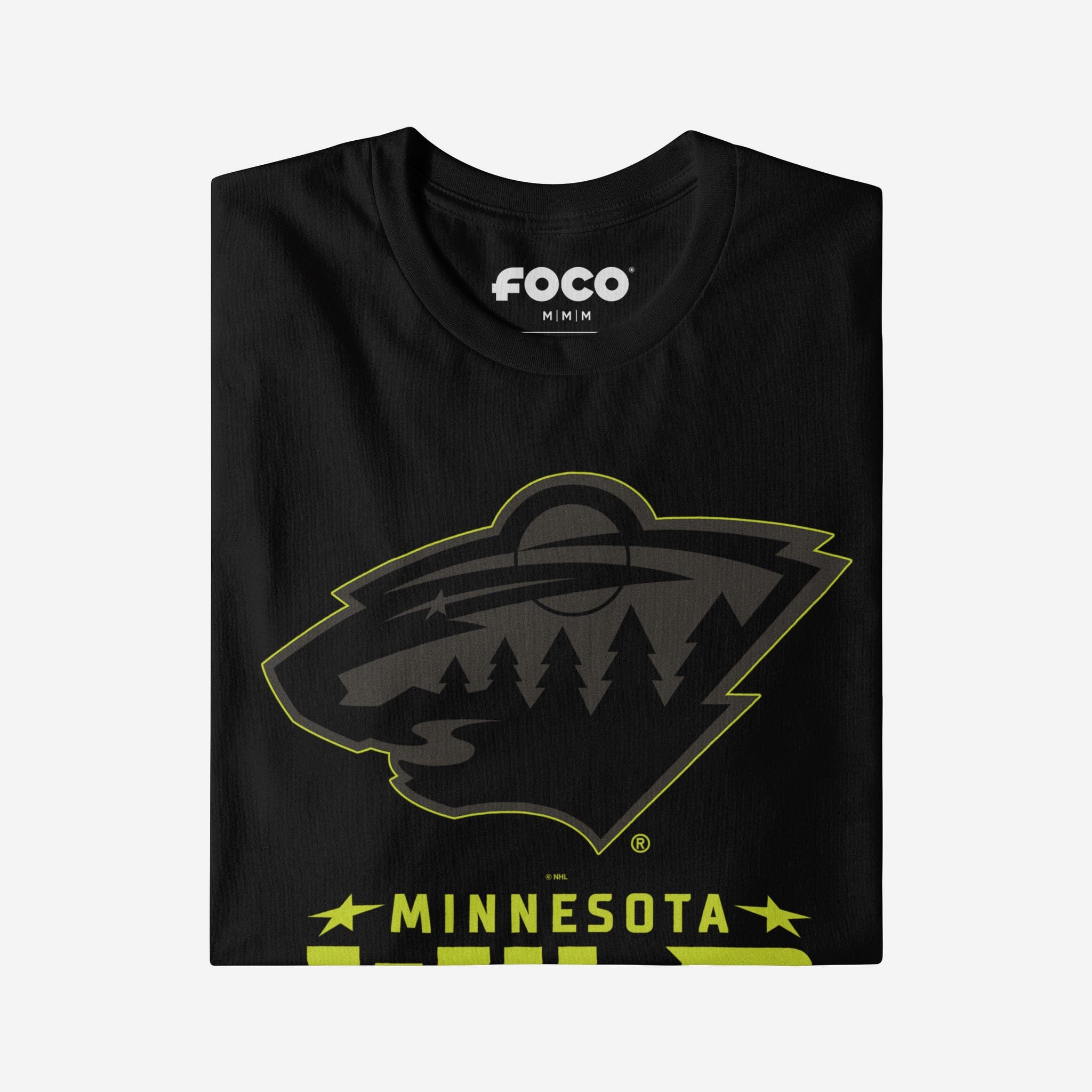 - Team logo display with highlight outline: The front of this apparel features a black Minnesota Wild team logo display outlined in neon, and a neon wordmark team name display