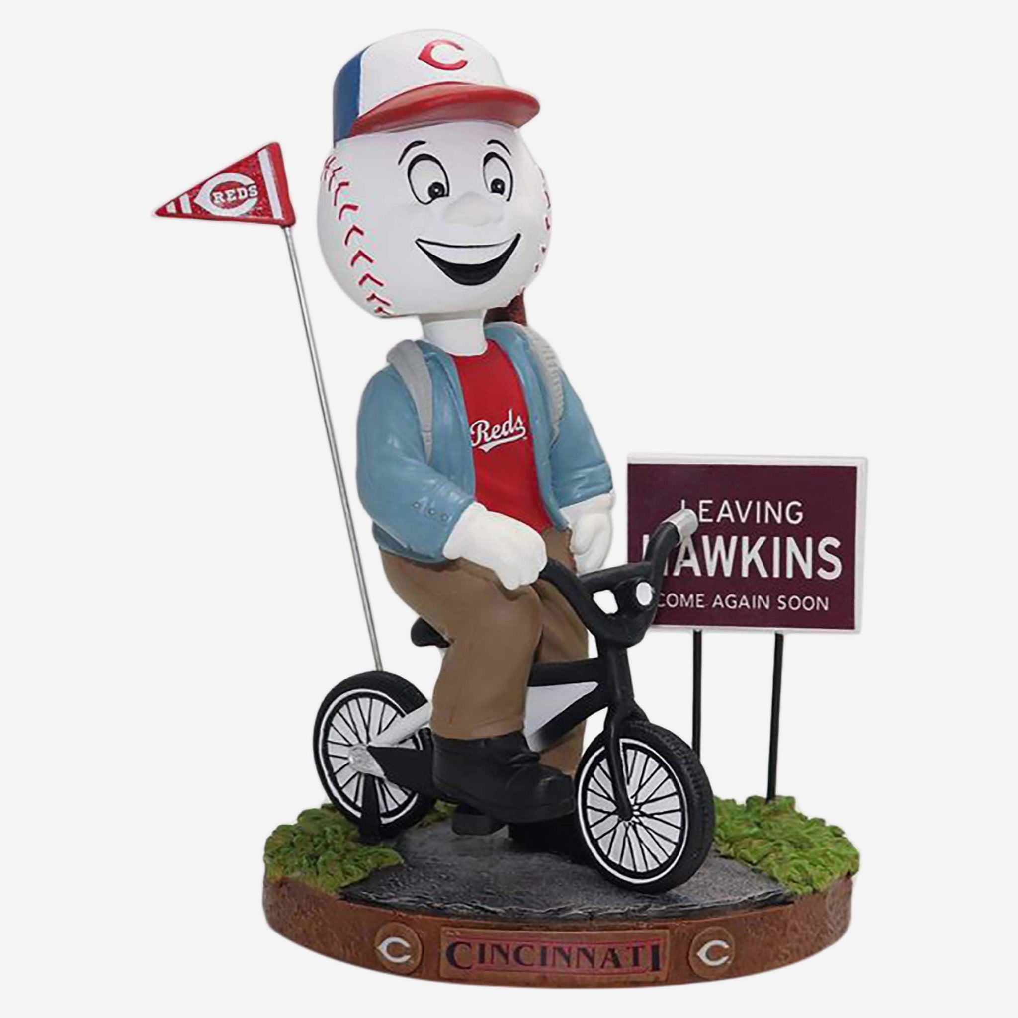 Welcome to Hawkins, Indiana. Home of the Stranger Things kids, and now, your favorite mascot. Get on your bicycle and join this Mr. Redlegs Cincinnati Reds Stranger Things Mascot on Bike Bobblehead for an adventure. Just make sure you're home by dinner.