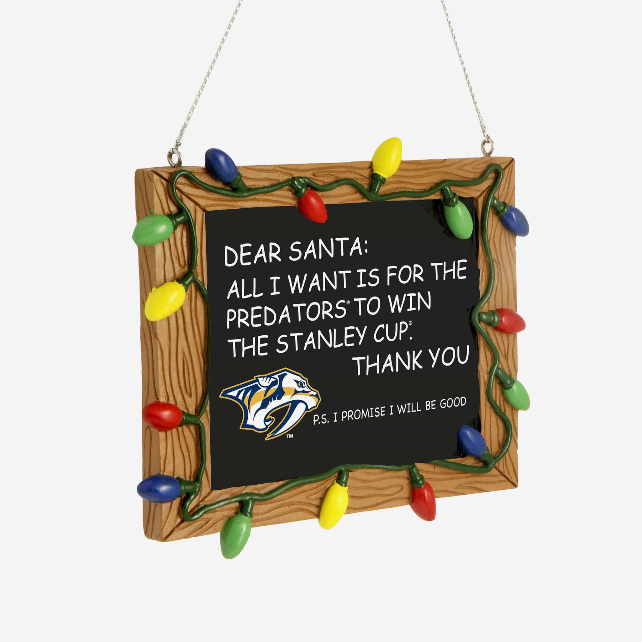 So, you made your list and sent it to jolly ol' Fanta Claus, asking him for a championship. But sometimes letters can get lost in the mail. Just in case, put this Nashville Predators Resin Chalkboard Sign Ornament on your tree to let him know how good you've been this year, and that all you want for the holidays is a trophy.