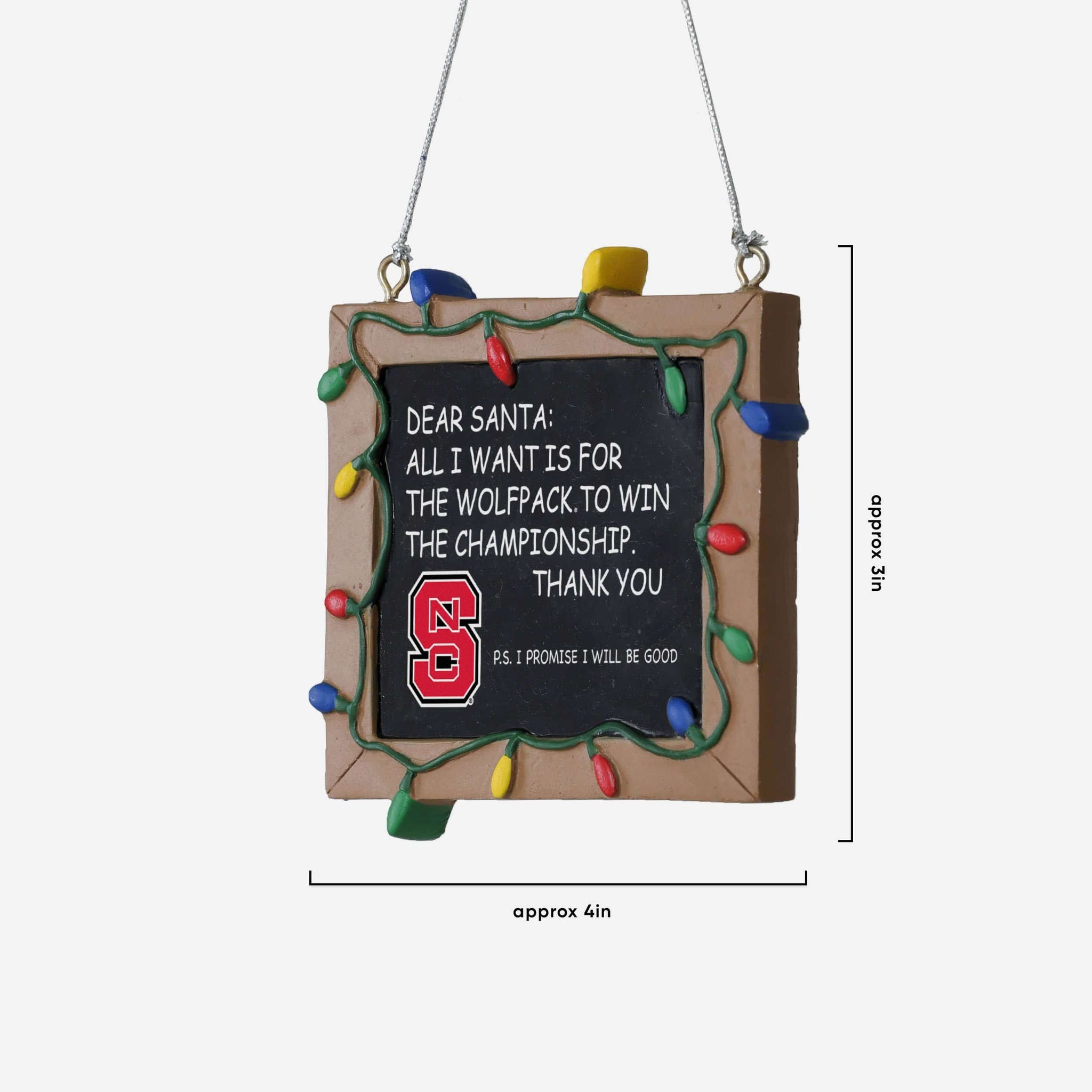 So, you made your list and sent it to jolly ol' Fanta Claus, asking him for a championship. But sometimes letters can get lost in the mail. Just in case, put this NC State Chalkboard Sign Ornament on your tree to let him know how good you've been this year, and that all you want for the holidays is a trophy.