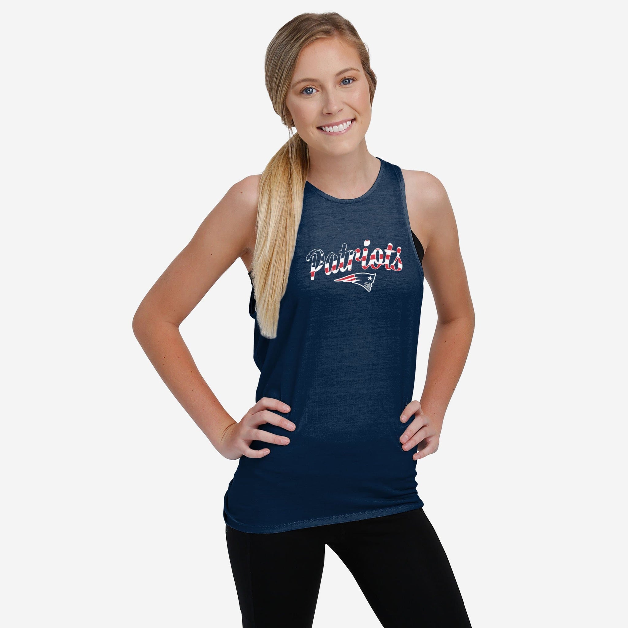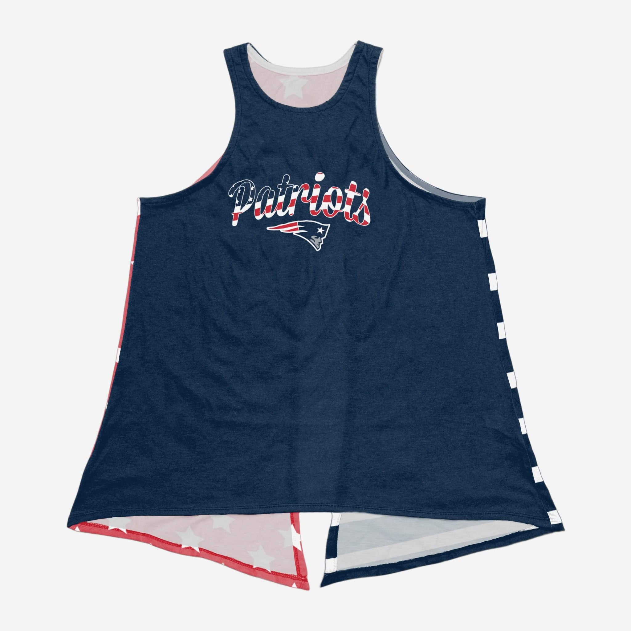 What this New England Patriots Women's Americana Tie Back Sleeveless Top lacks in sleeves, it more than makes up for in patriotic team pride!