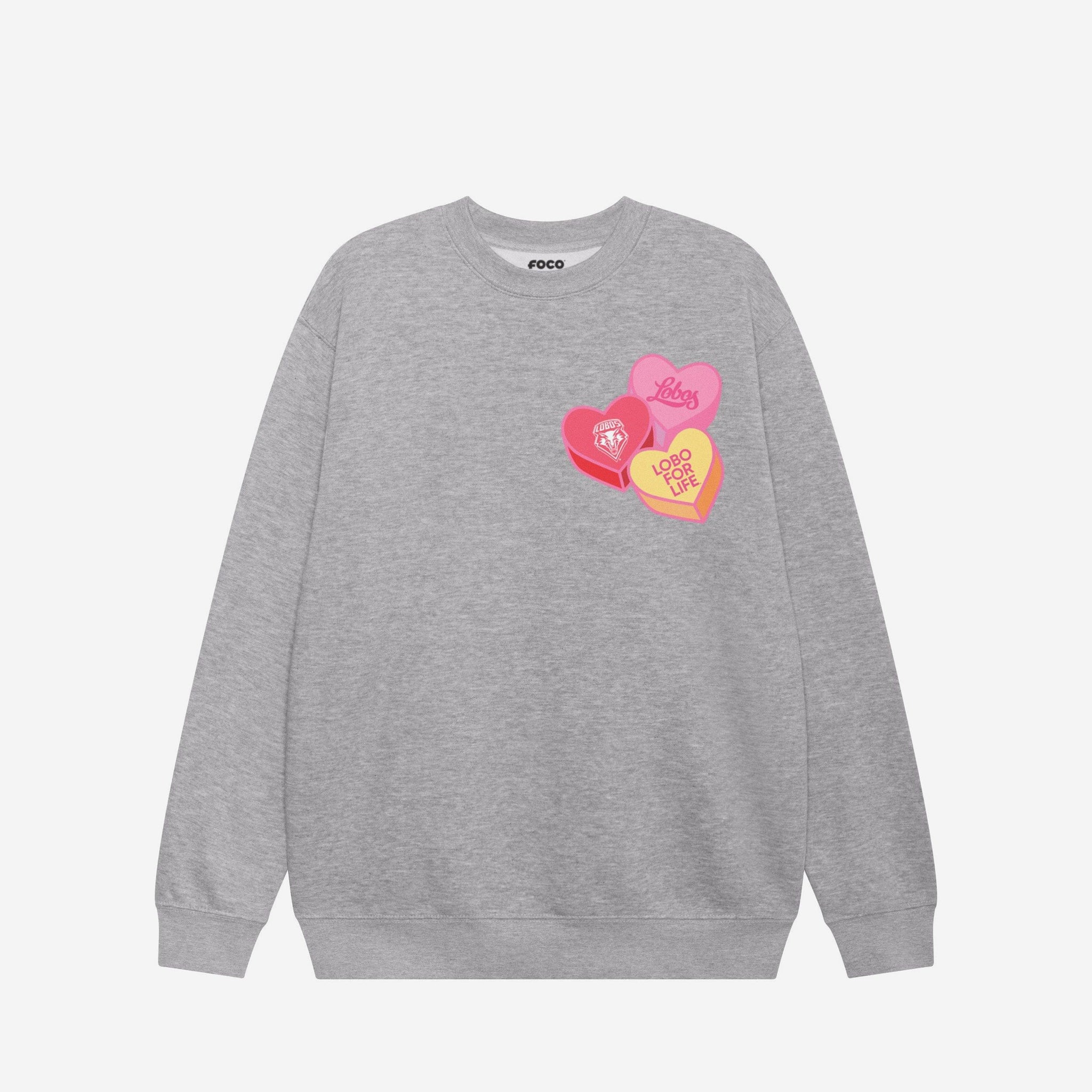 New Mexico Lobos Candy Heart Crew Neck Sweatshirt FOCO Athletic Heather S - FOCO.com