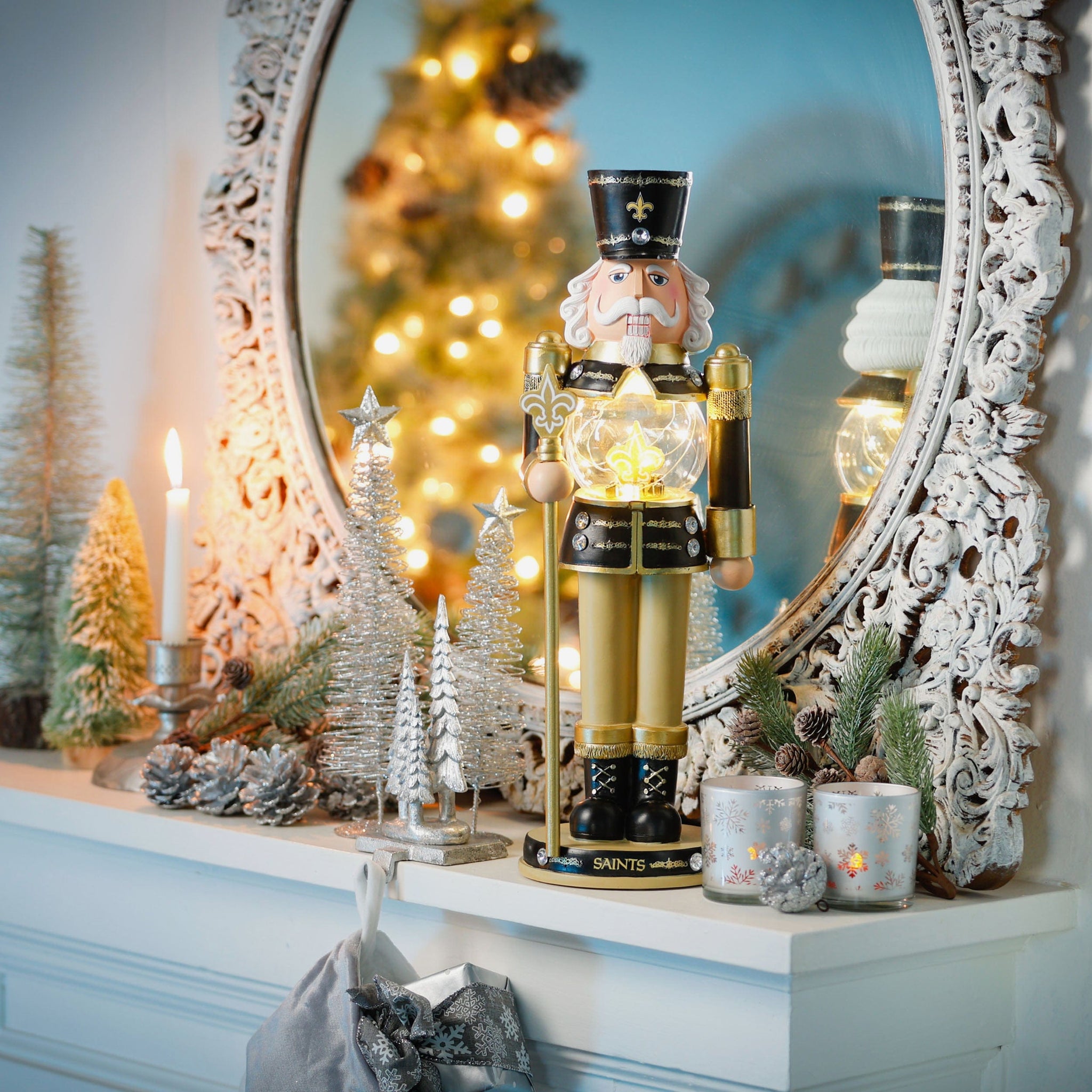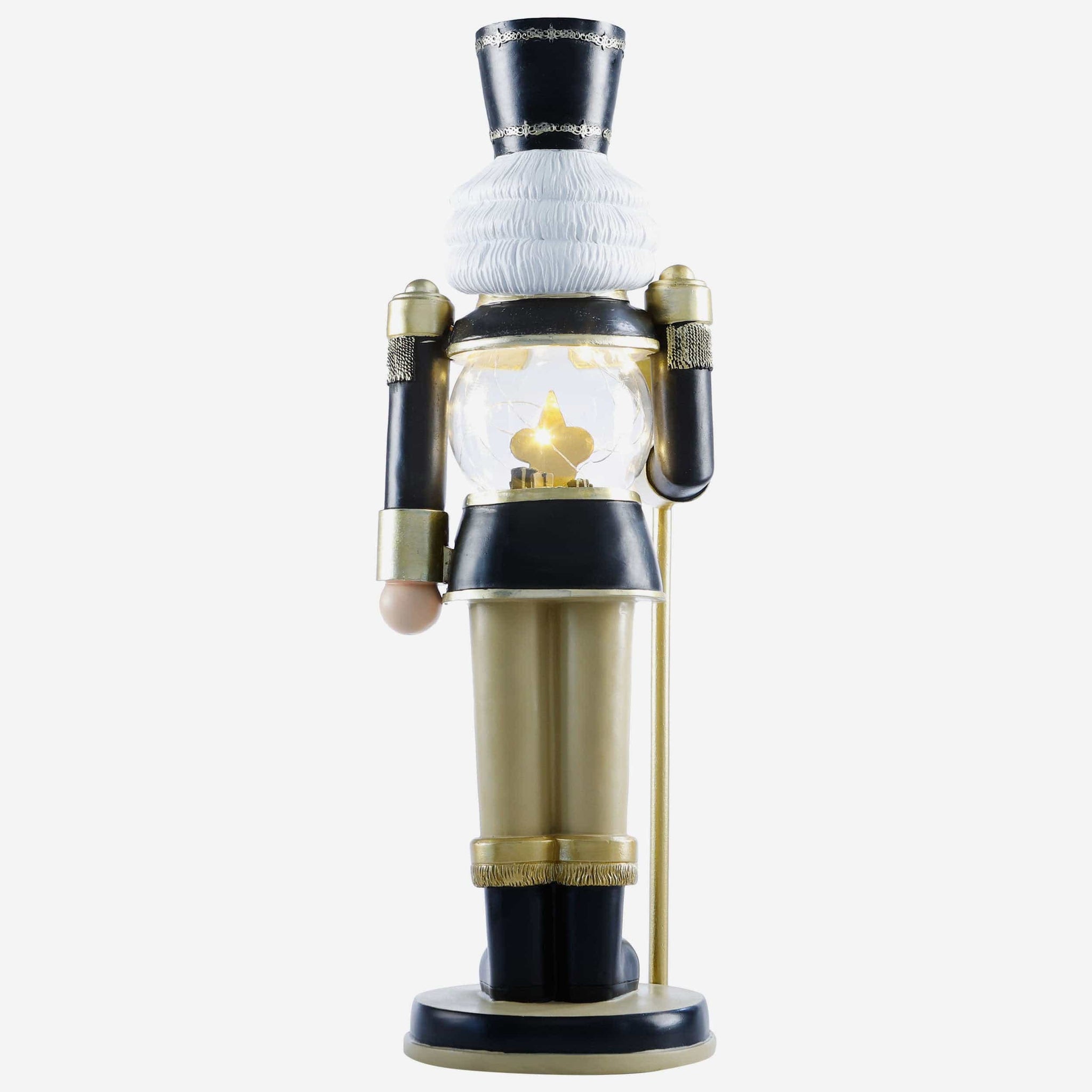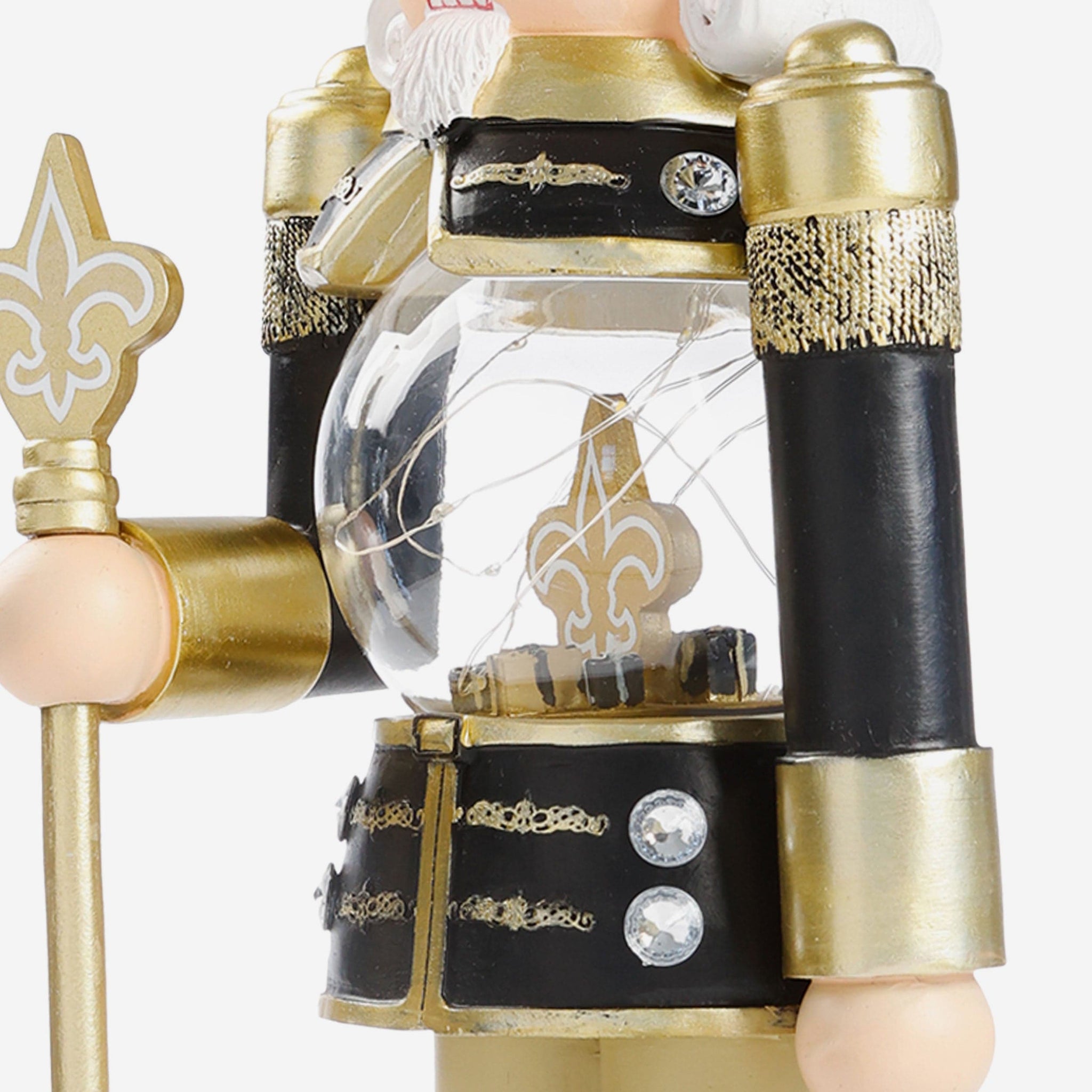 - Nutcracker's torso features clear globe with gold-colored team logo display, holiday gift accents, and light-up fairy lights for maximum holiday magic