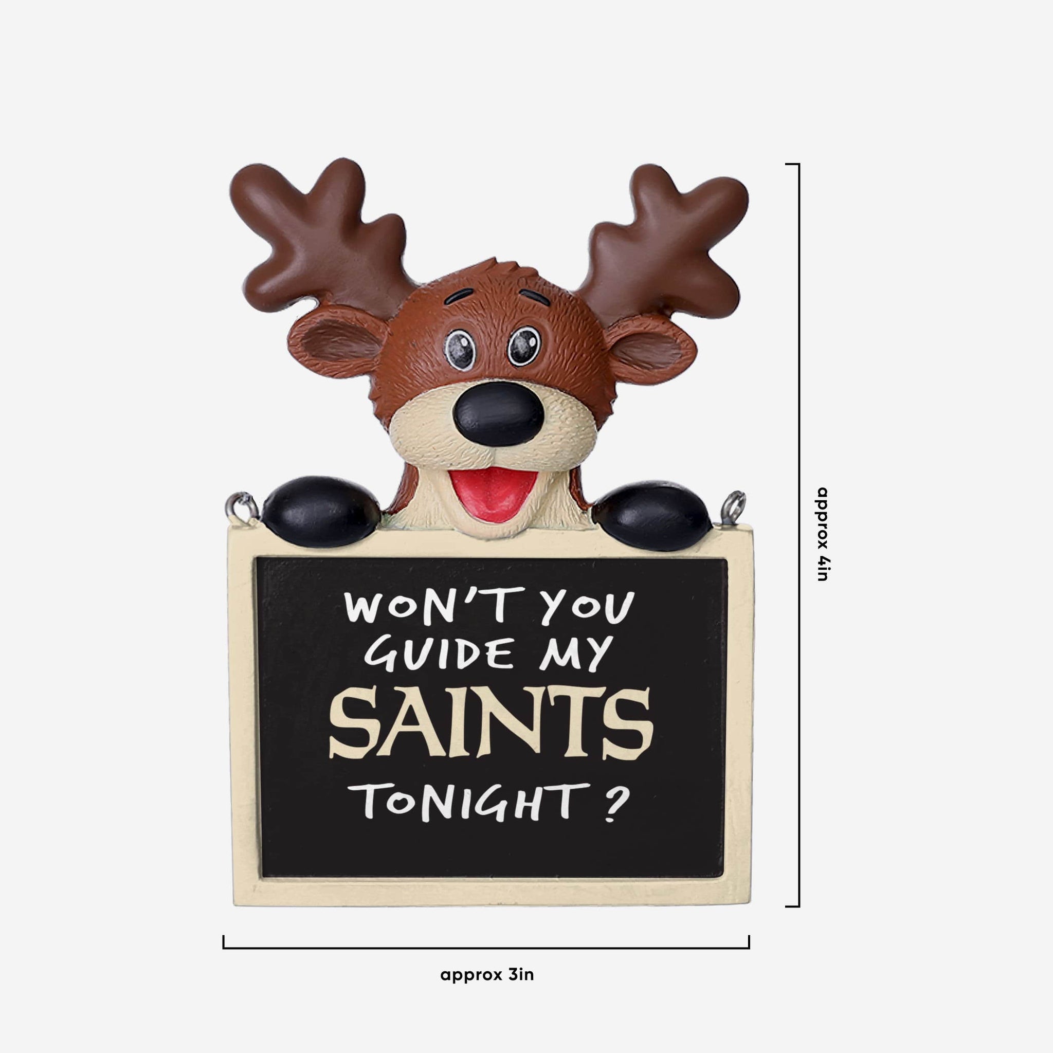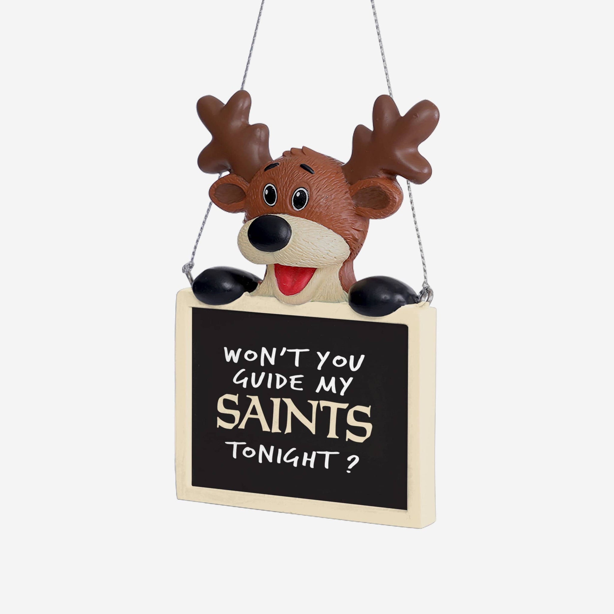 Tired: Dasher. Dancer. Prancer. Vixen. Wired: This New Orleans Saints Reindeer with Sign Ornament.